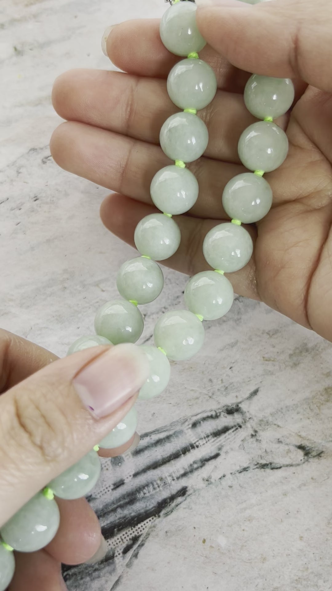 Jade bead necklaces are a classic piece of jewelry that can be dress up or down. These are very translucent light green jadeite beads. The color is very even and all beads have the same tone. This is what you want in bead necklaces. There are a total of 48 beads and they all average 13mm. There is 925 sterling silver clasp. with total 27 inches long.