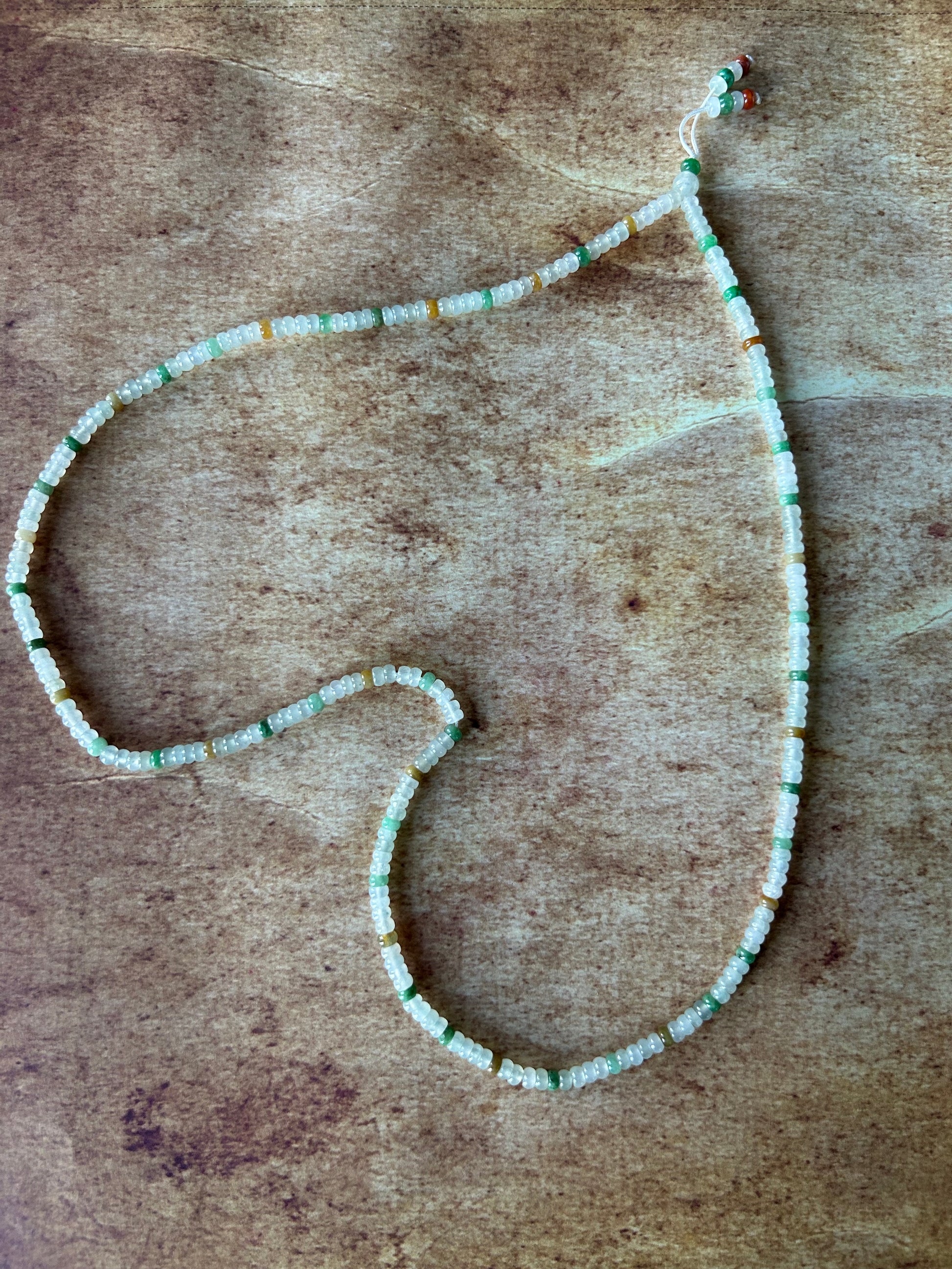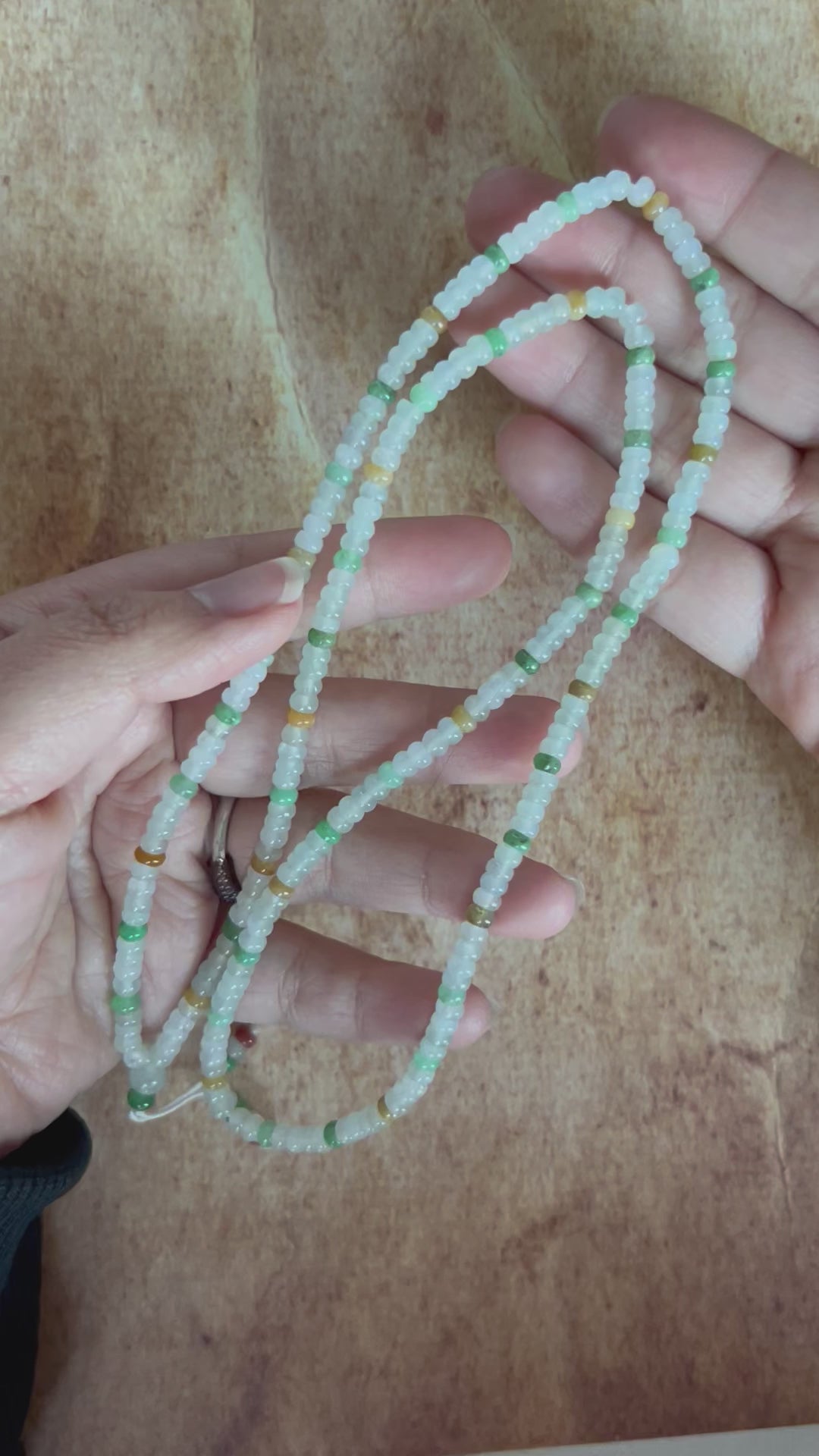 Jade bead necklaces are a classic piece of jewelry that can be dress up or down. These are very translucent multi color jadeite beads. The color is very even and all beads have the same tone. This is what you want in bead necklaces. There are all average 4mm. the total length is 26 inches long.