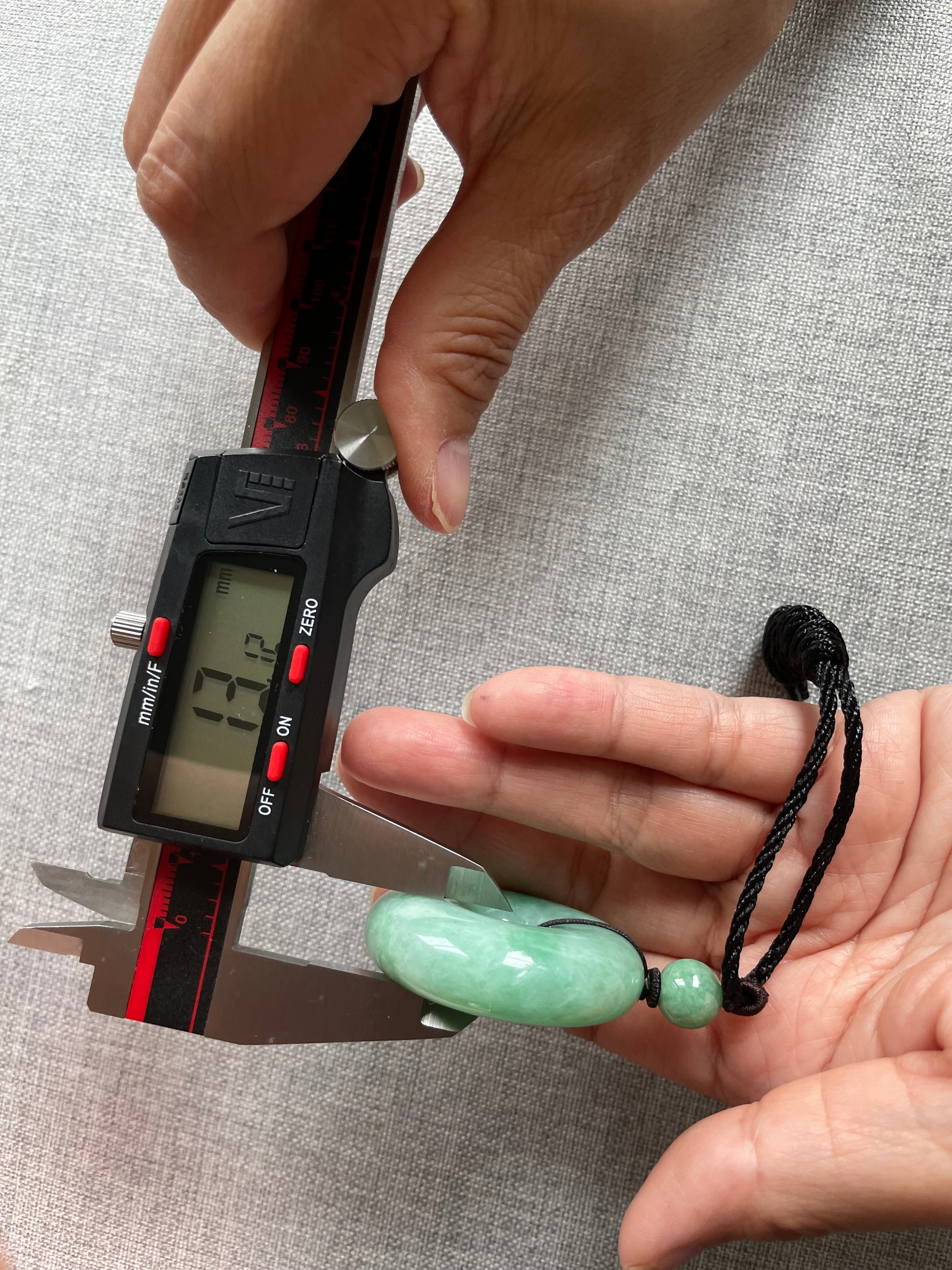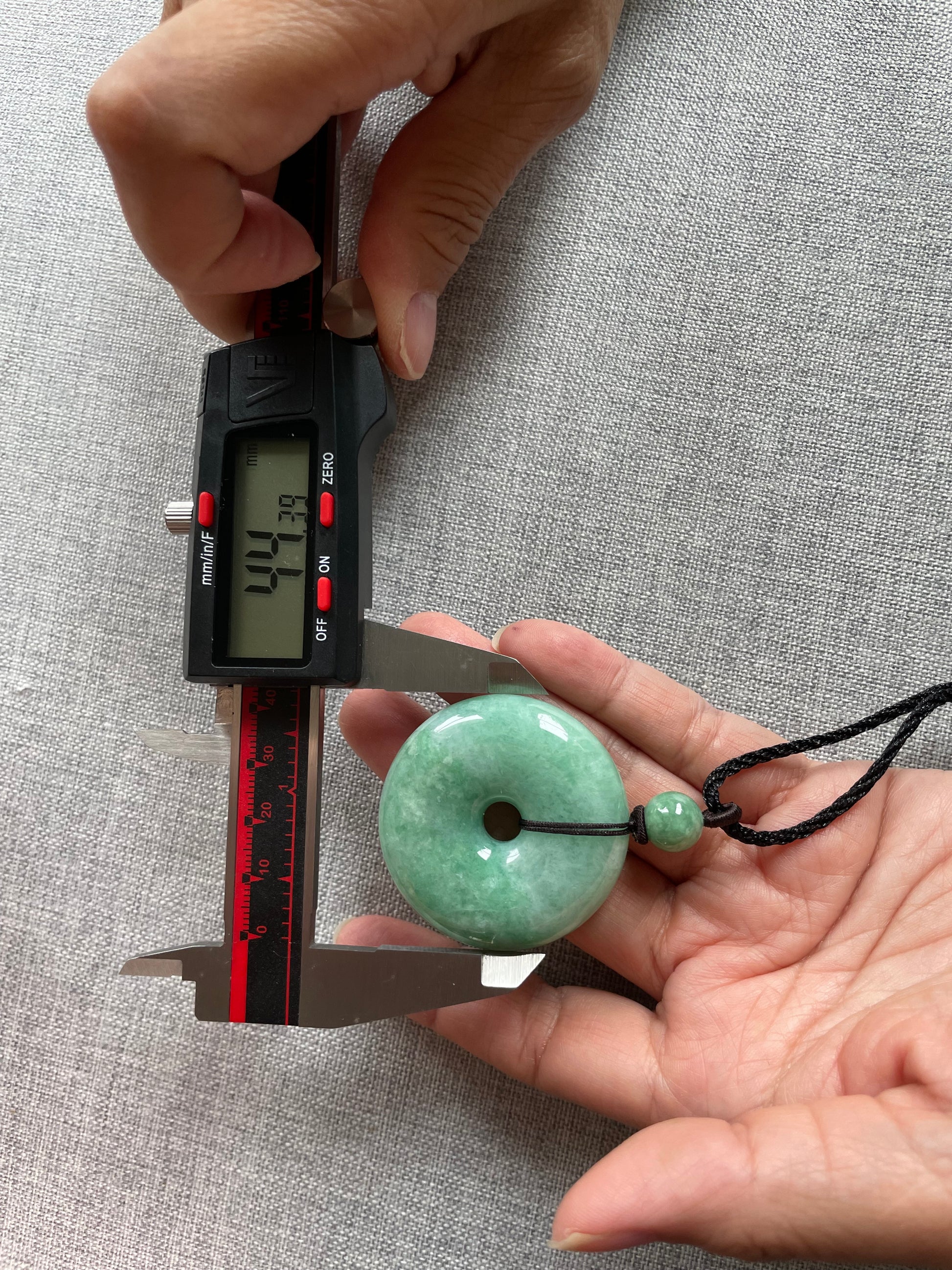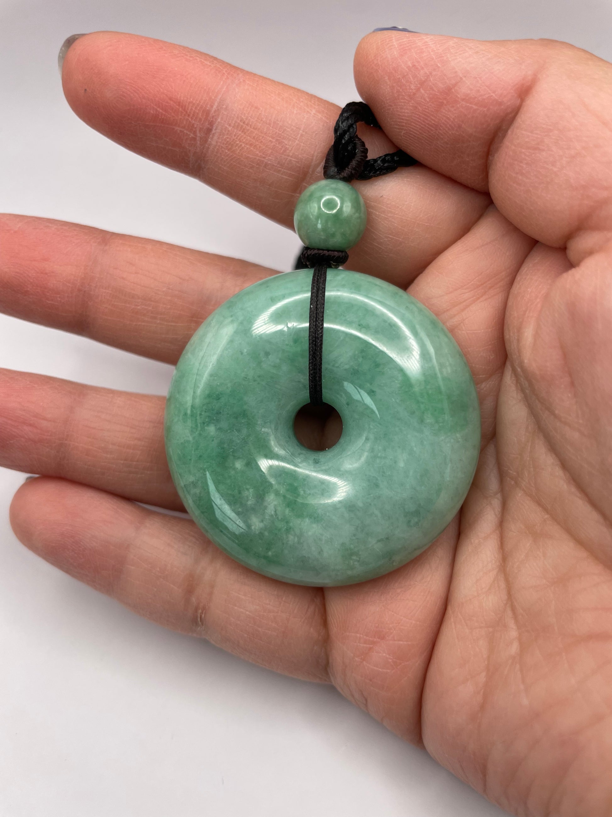 Icy green donut (ping an kou) pendant. Genuine Type A jadeite. All natural non treated jade. This is a unique translucent piece of jadeite. The donut is 44.39mm in diameter and 13.12mm thick. It is an adjustable necklace.