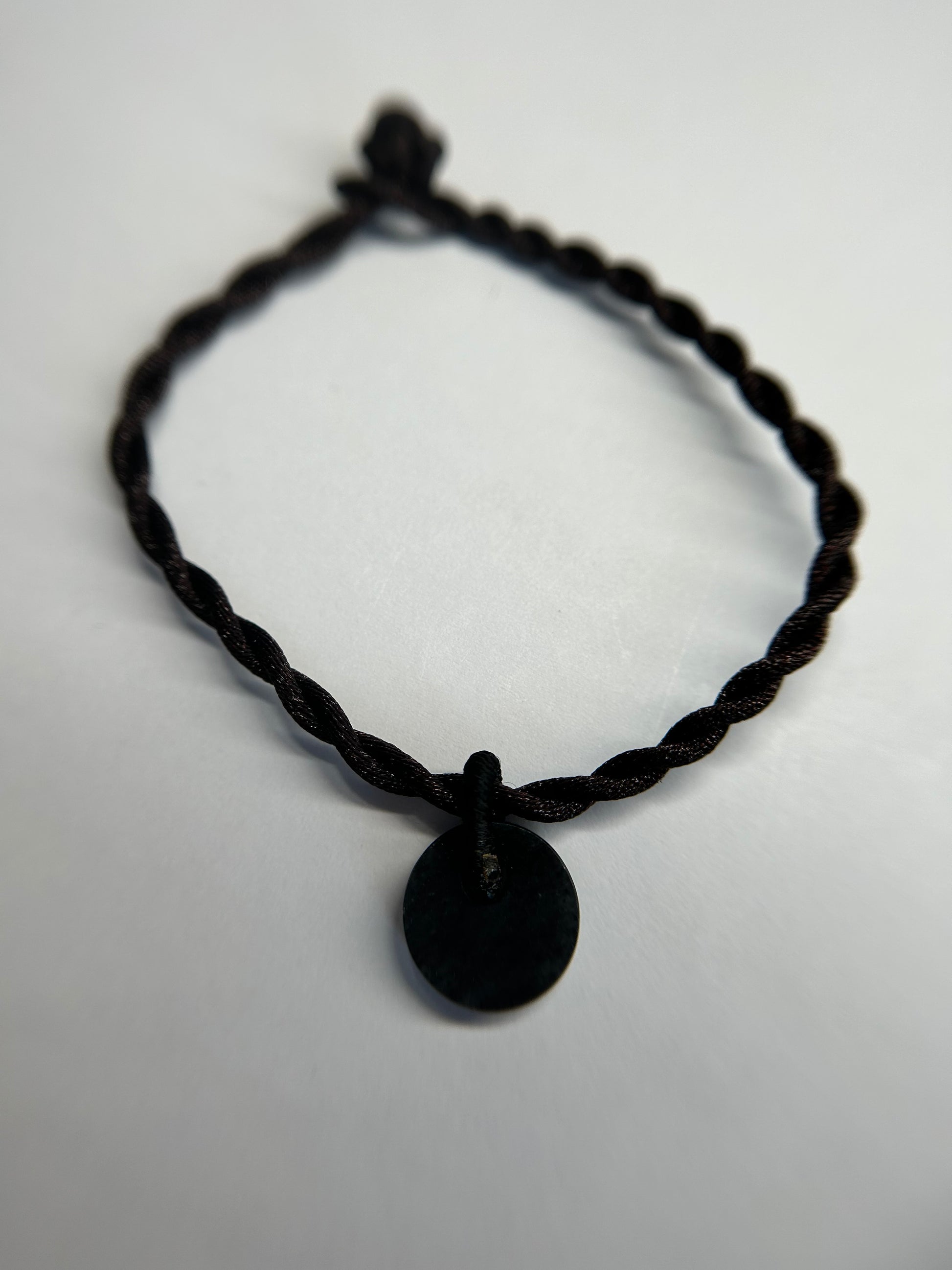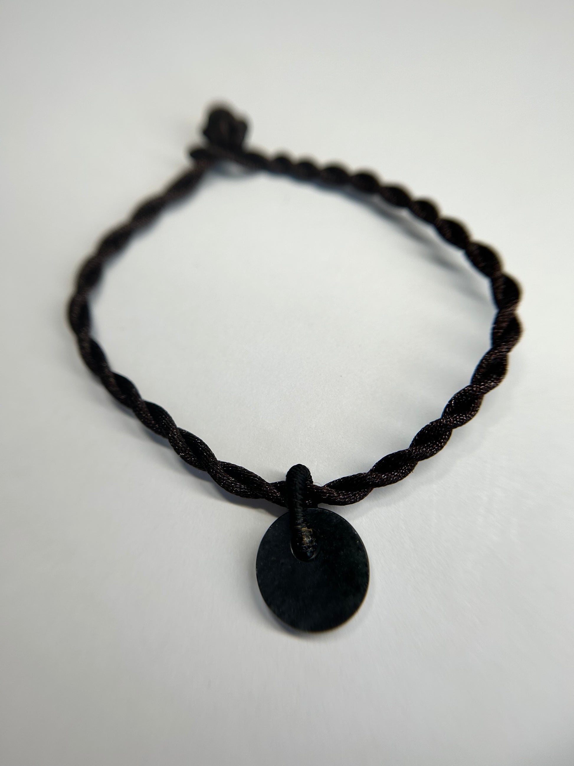 Beautiful black disc braided with black rope. This is a unisex pieces that is full of meaning.