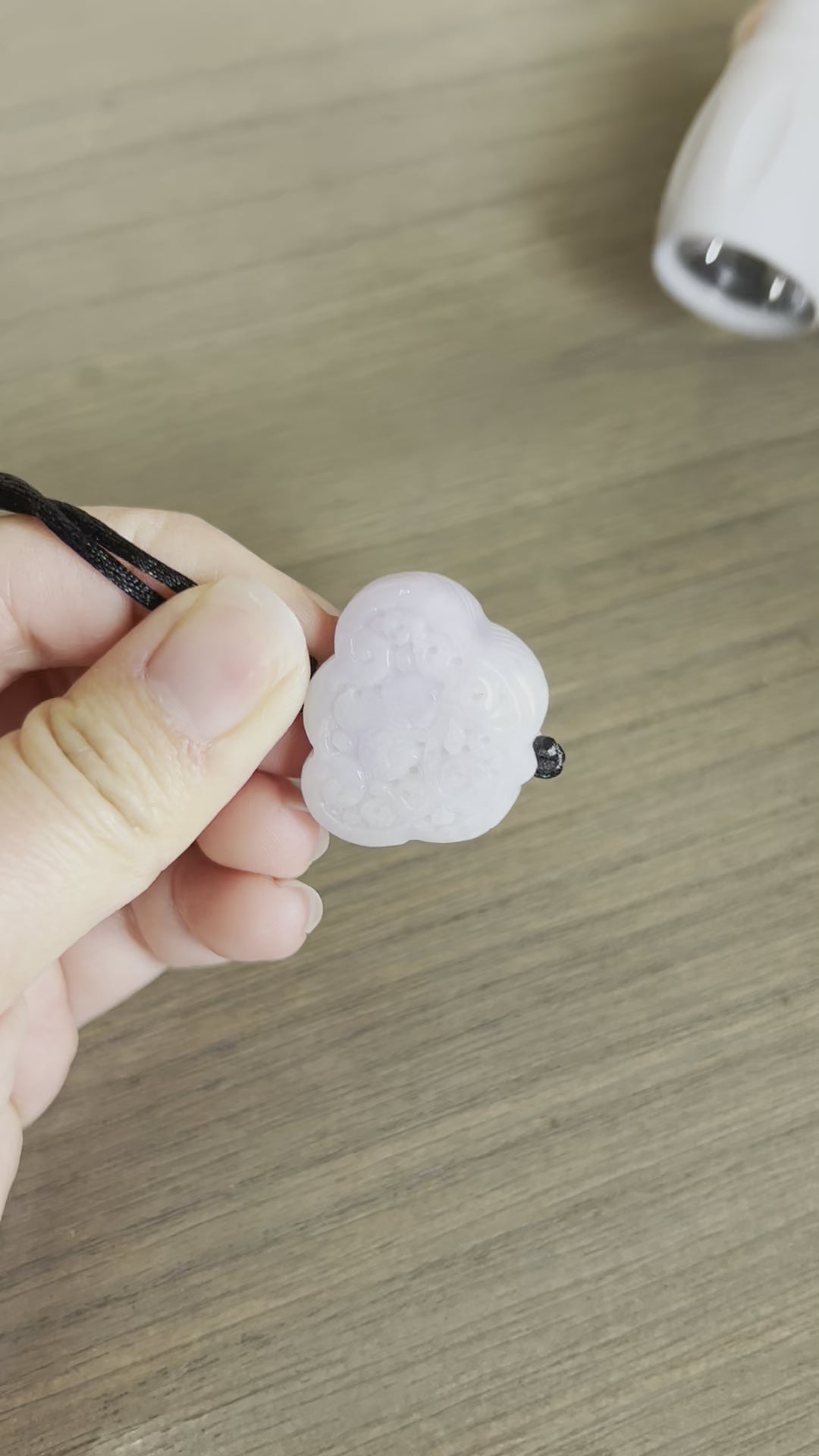 Grade A Natural Burma Jadeite Hand carved lavender Yuyi (ruyi) pendant on a black lanyard