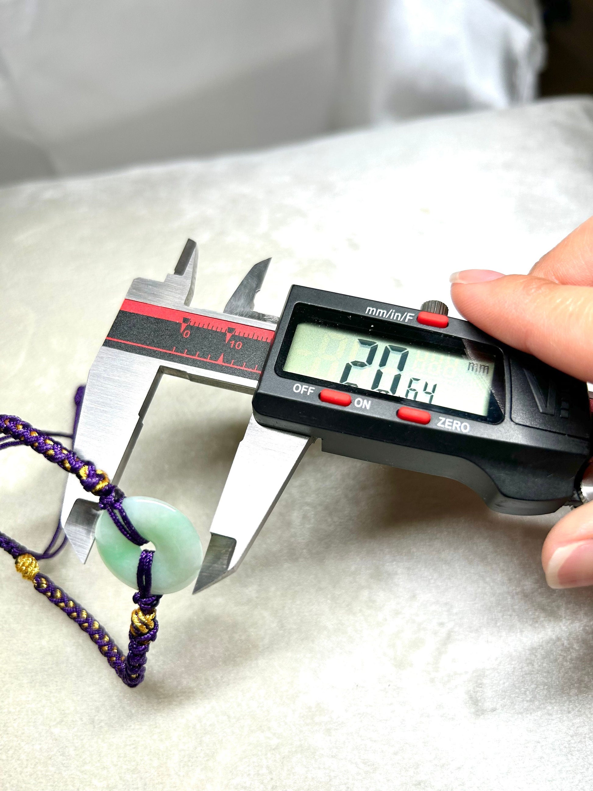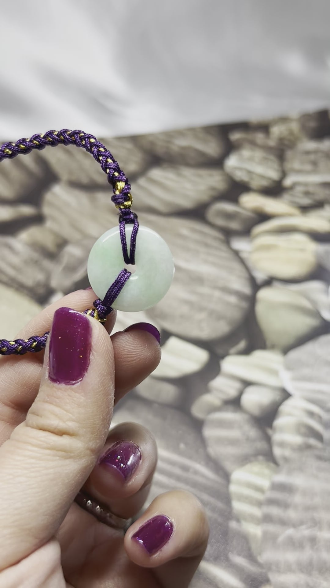 Beautiful translucent Burma jadeite Pi disc braided with purple, gold, and black rope. This piece is adjustable and will fit 6 inches to 8.5 inches wrist. The jadeite is 20.64 mm diameter. this bracelet is suitable for all ages.