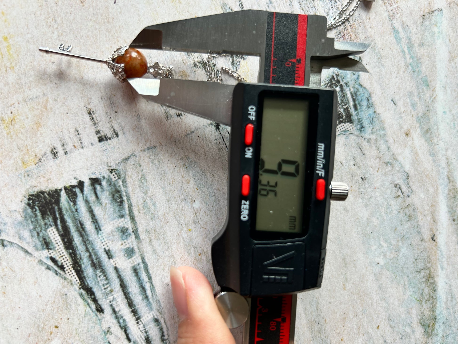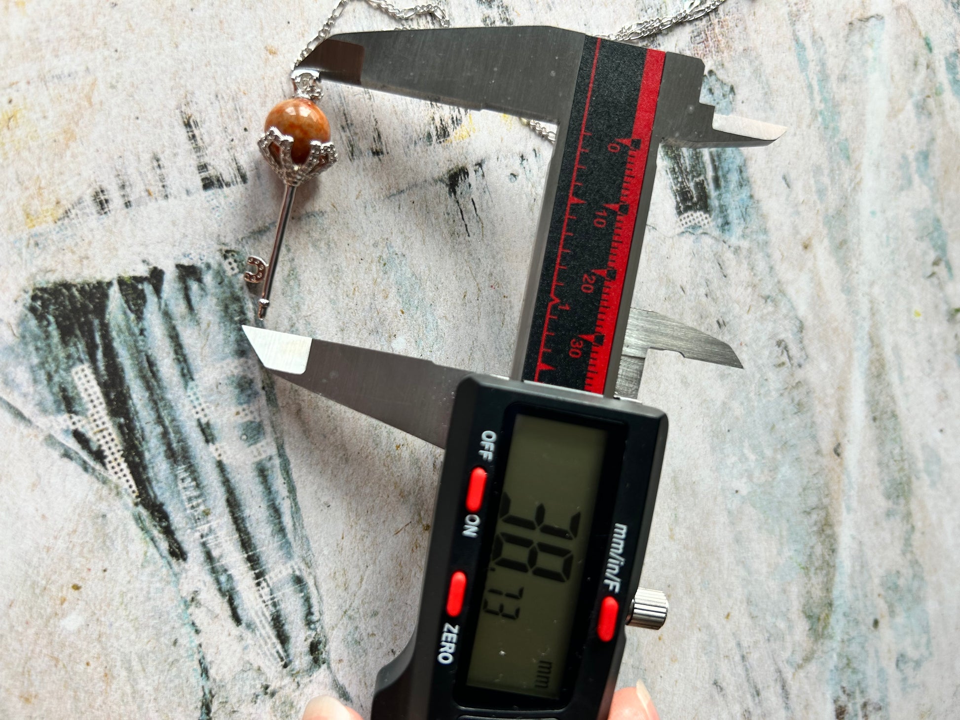 It measures 38.73mm x 9.36mm with red jadeite beads.