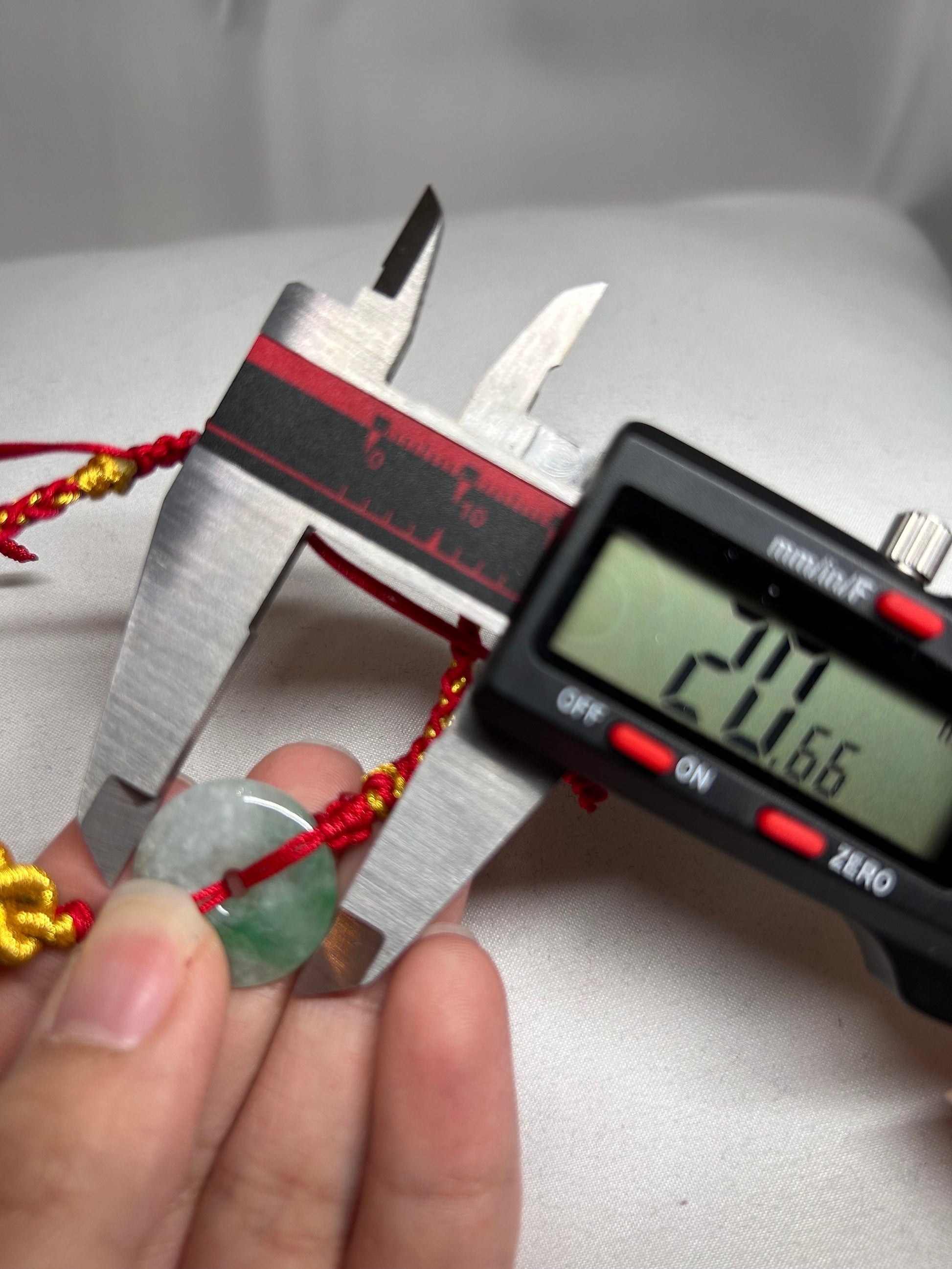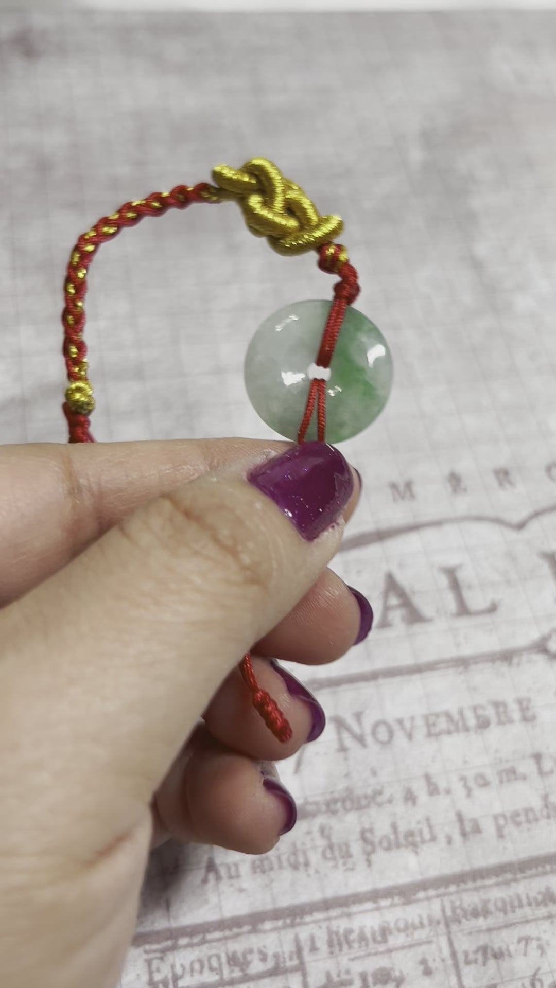 Beautiful translucent Burma jadeite Pi disc braided with red, and gold rope. The gold know accent brings this bracelet to another level and makes this piece more unique. This piece is adjustable and will fit 6 inches to 10 inches wrist. The jadeite is 20.66 mm diameter.