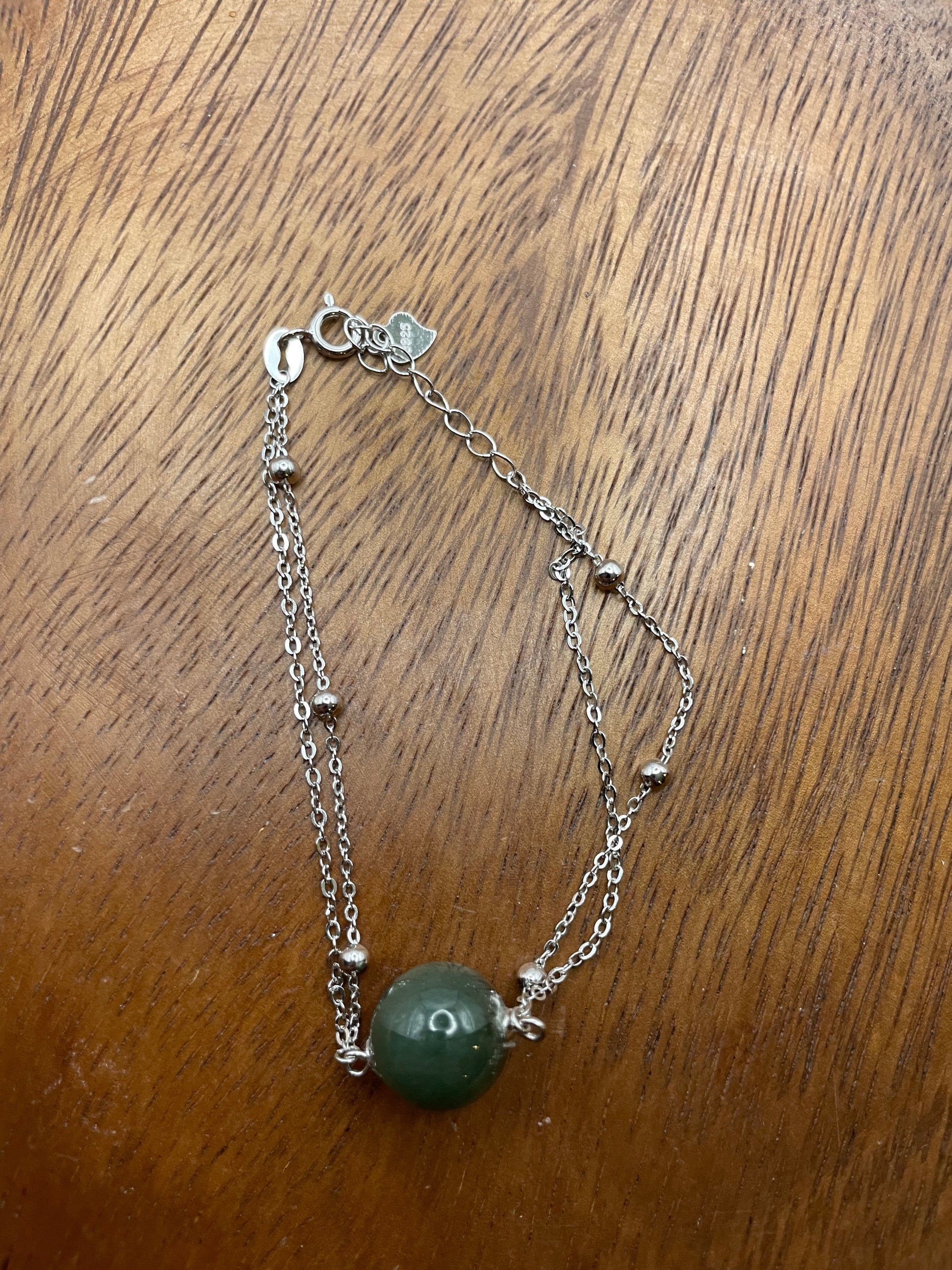 Dark green jadeite bead silver bracelet. This is a versátile piece that can be dress up or down and can be stacked with other bracelets. it has 1 green jadeite bead that the size is 12.64mm .