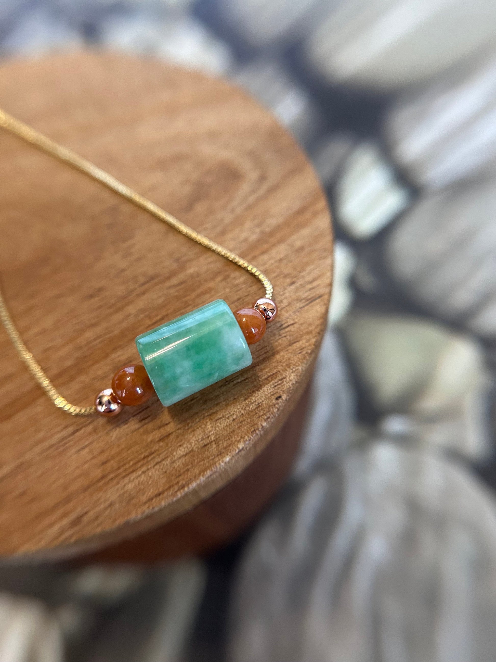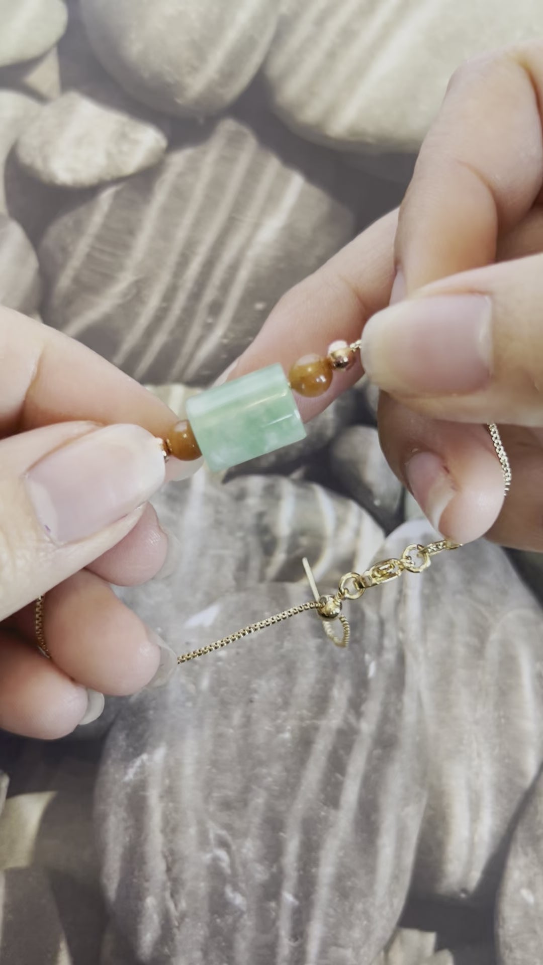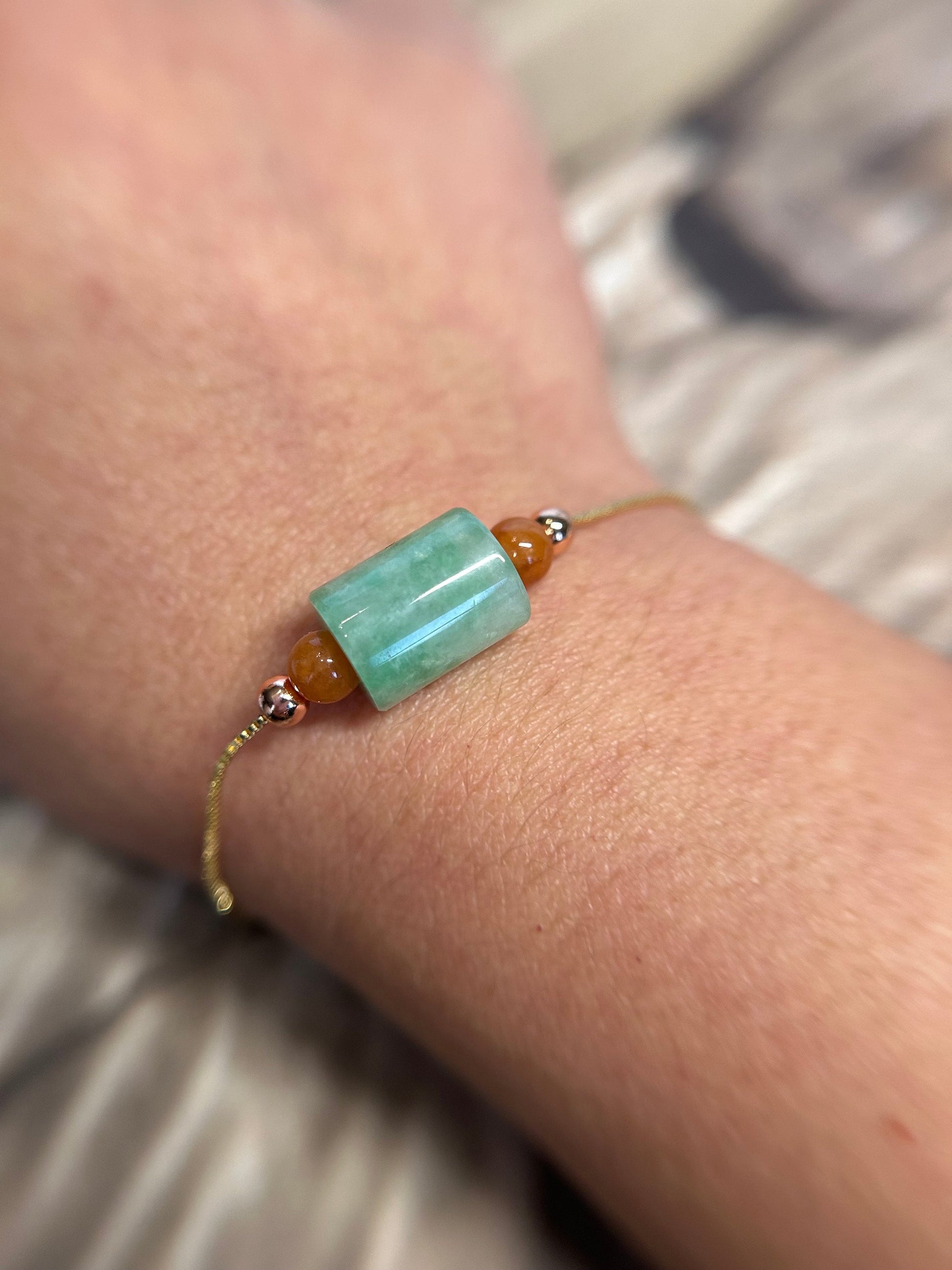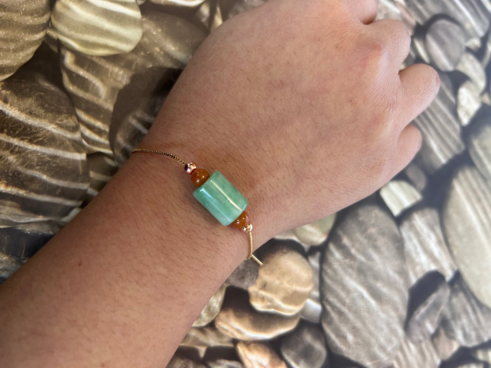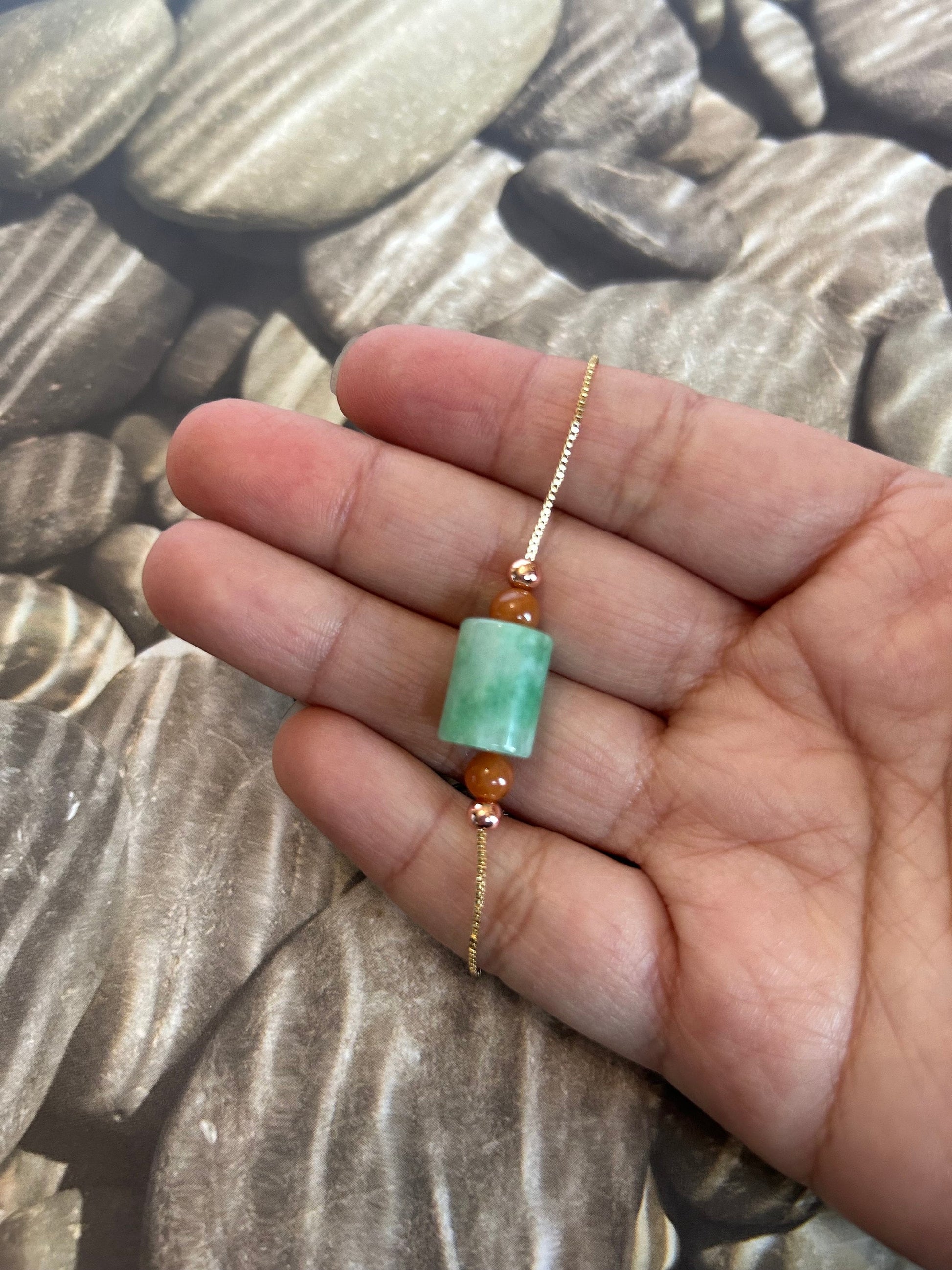 This is a very versatile piece of jewerly. The chain can be extended to 10 inches. It can be used as a bracelet or anklet and it is adorned by 3 beautiful Green and red Jadeites. This is a unisex piece and suitable for kids as well.