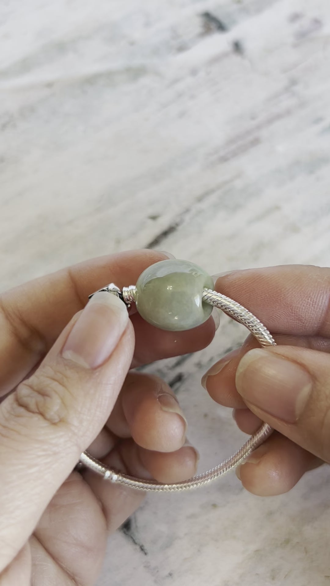 Grade A Natural Green and Yellow Burmese Jadeite Lu Lu Tong charm on a sterling silver bracelet