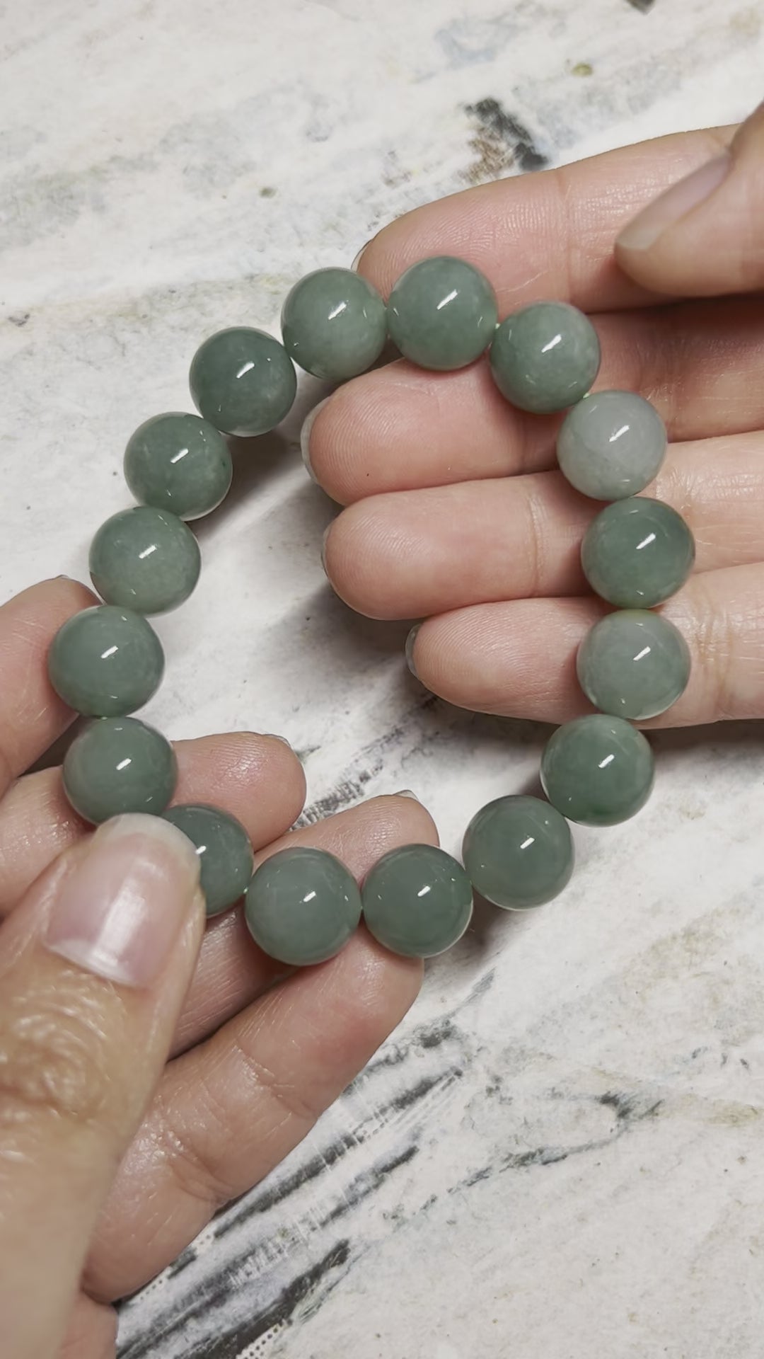 Jade bead bracelet are a classic piece of jewelry that can be dress up or down. These are very translucent green jadeite beads. The color is very even and all beads have the same tone. This is what you want in bead necklaces. There are a total of 16 beads and they all average 12mm. This is collector size beads that are highly sought after.