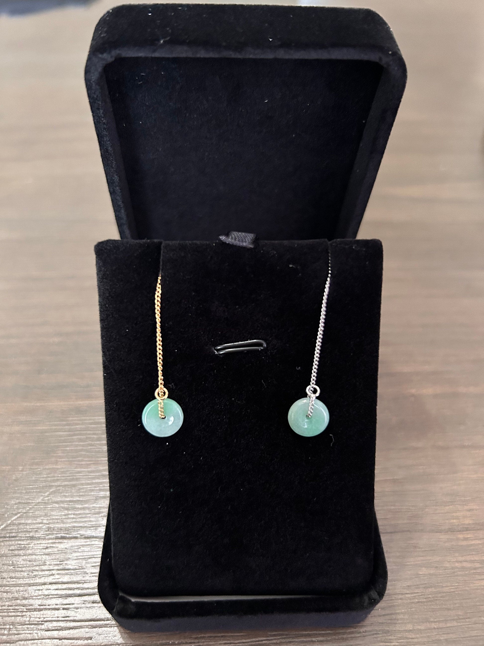 Looking for an investment piece that is versatile and can be dress up or down? These are the earrings for you. This can be worn as a thread earring that drops two inches, or use your favorite stud to use the jadeite as a earring jacket as shown in the pictures.