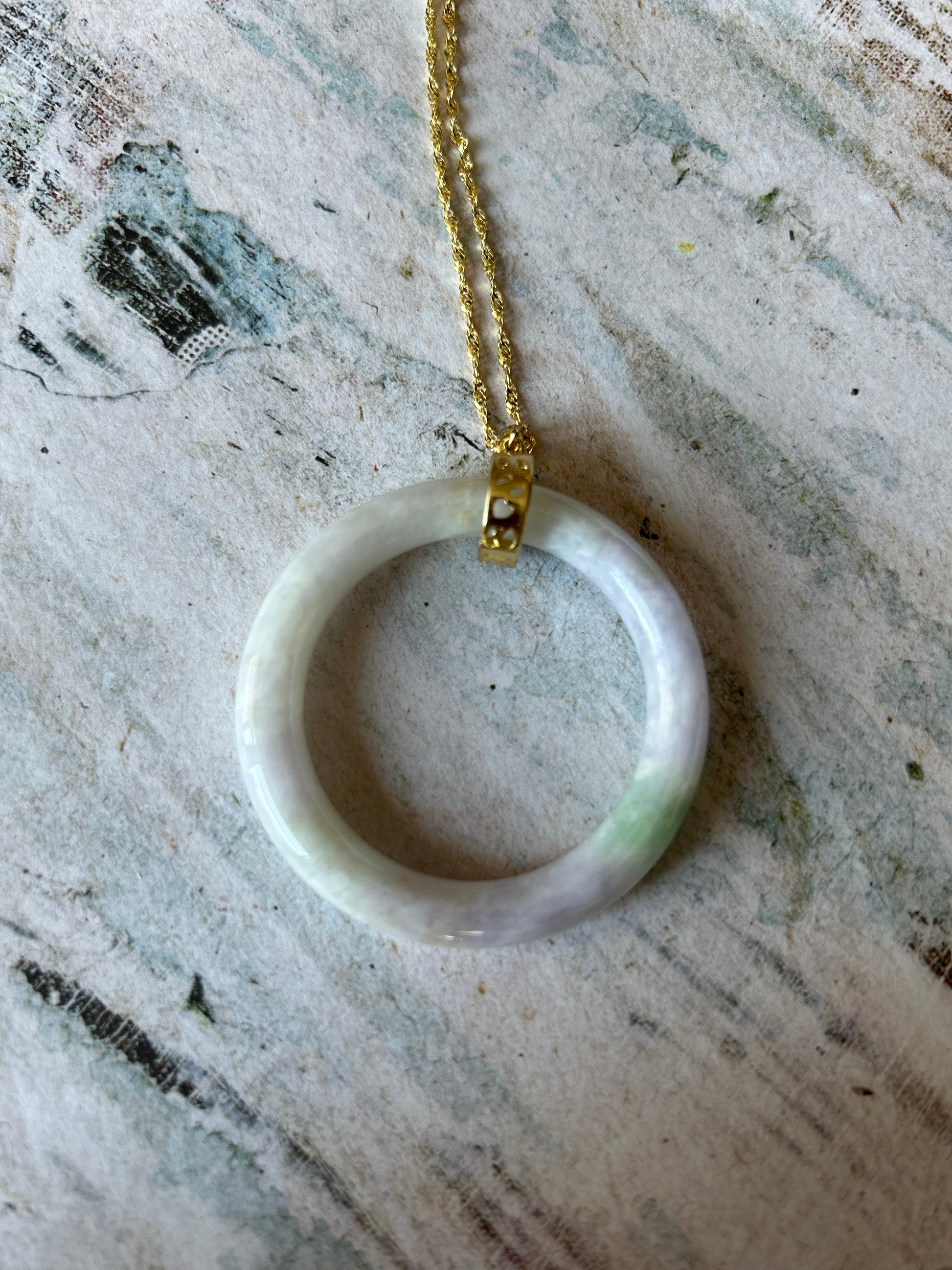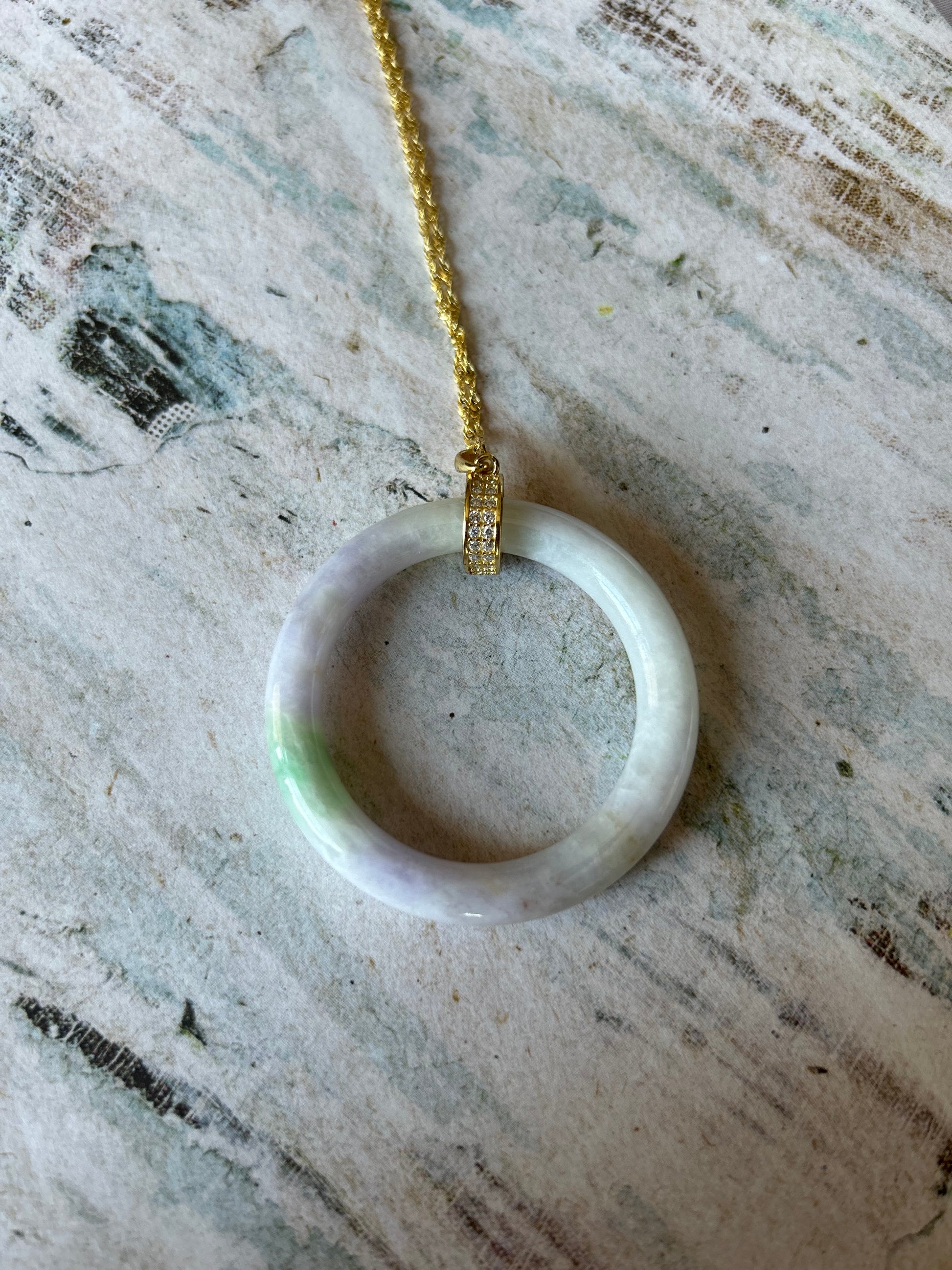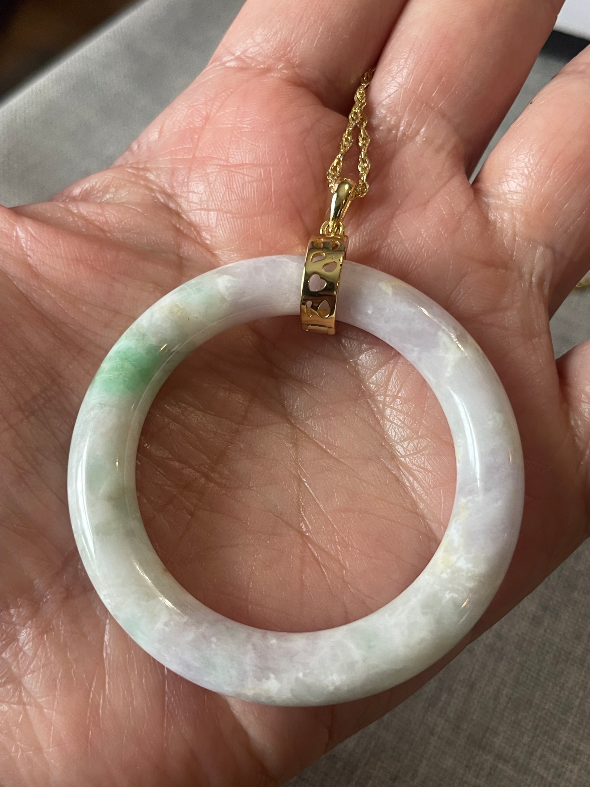 The lavender with green full circle pendant in Chinese signifies all is well and safety for the wearer. the jadeite is an apple green and very translucent. it’s a very classic piece that can be worn casually and can be dress up. the piece is 49.72mm in outer diameter, 7.19mm width and 6.93mm thick.The bail and chain are gold over sterling silver.