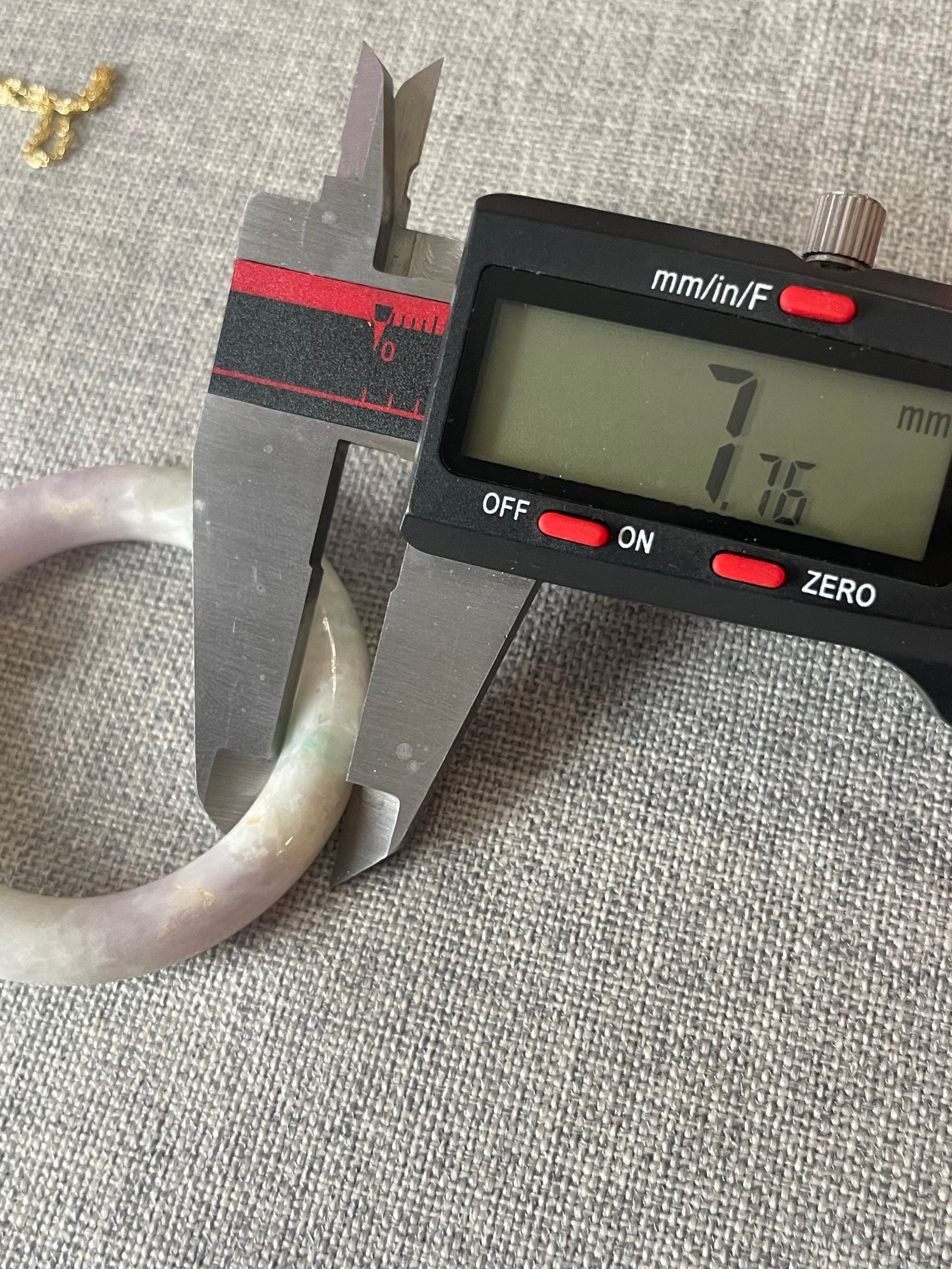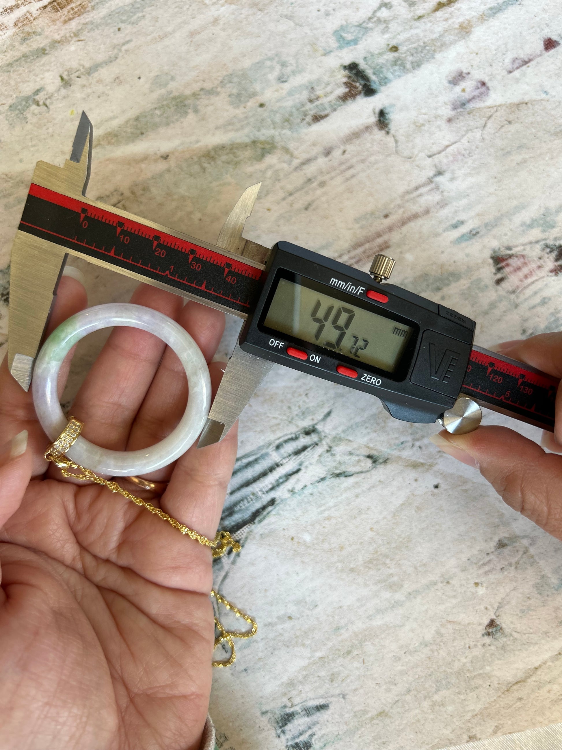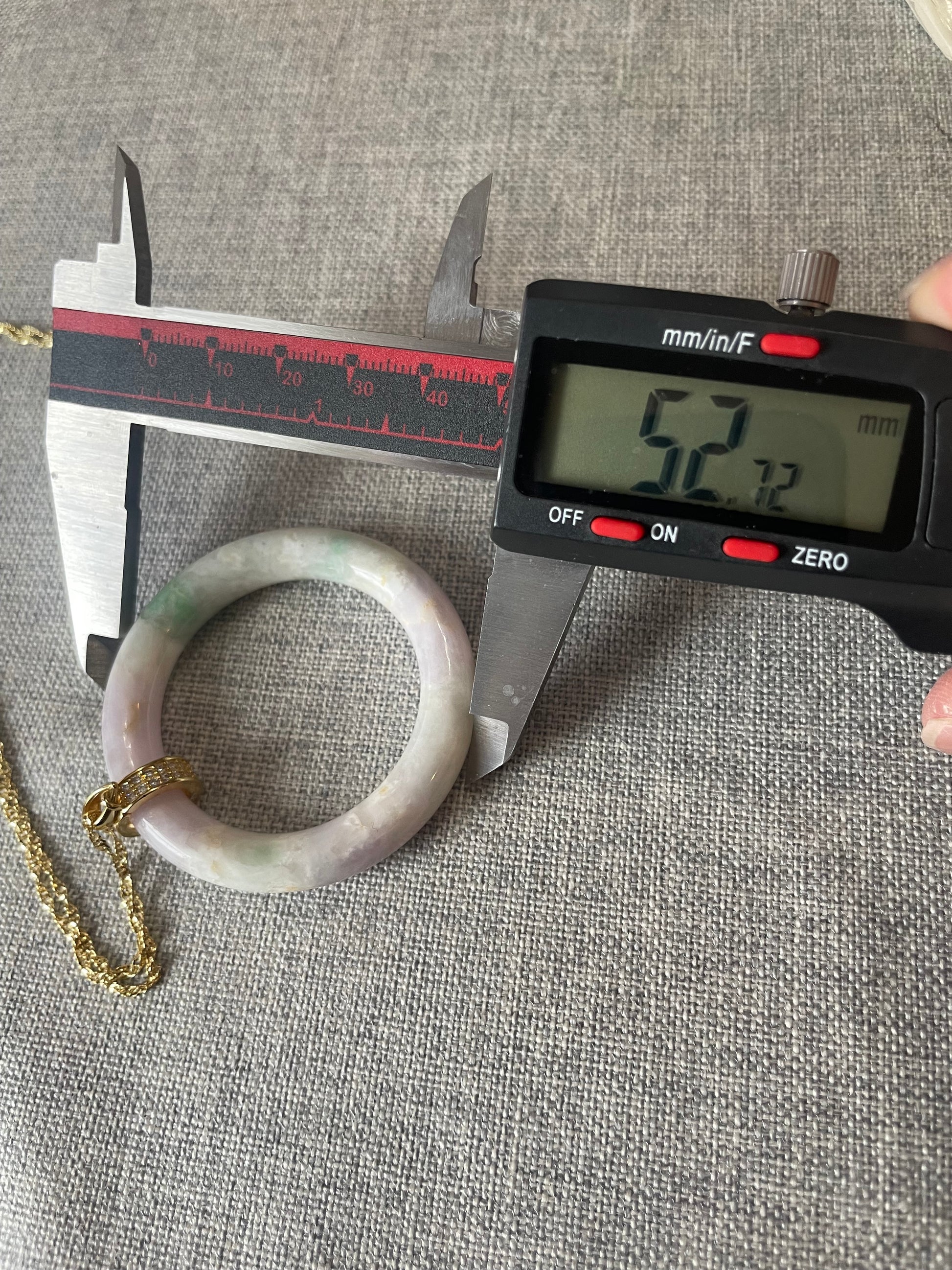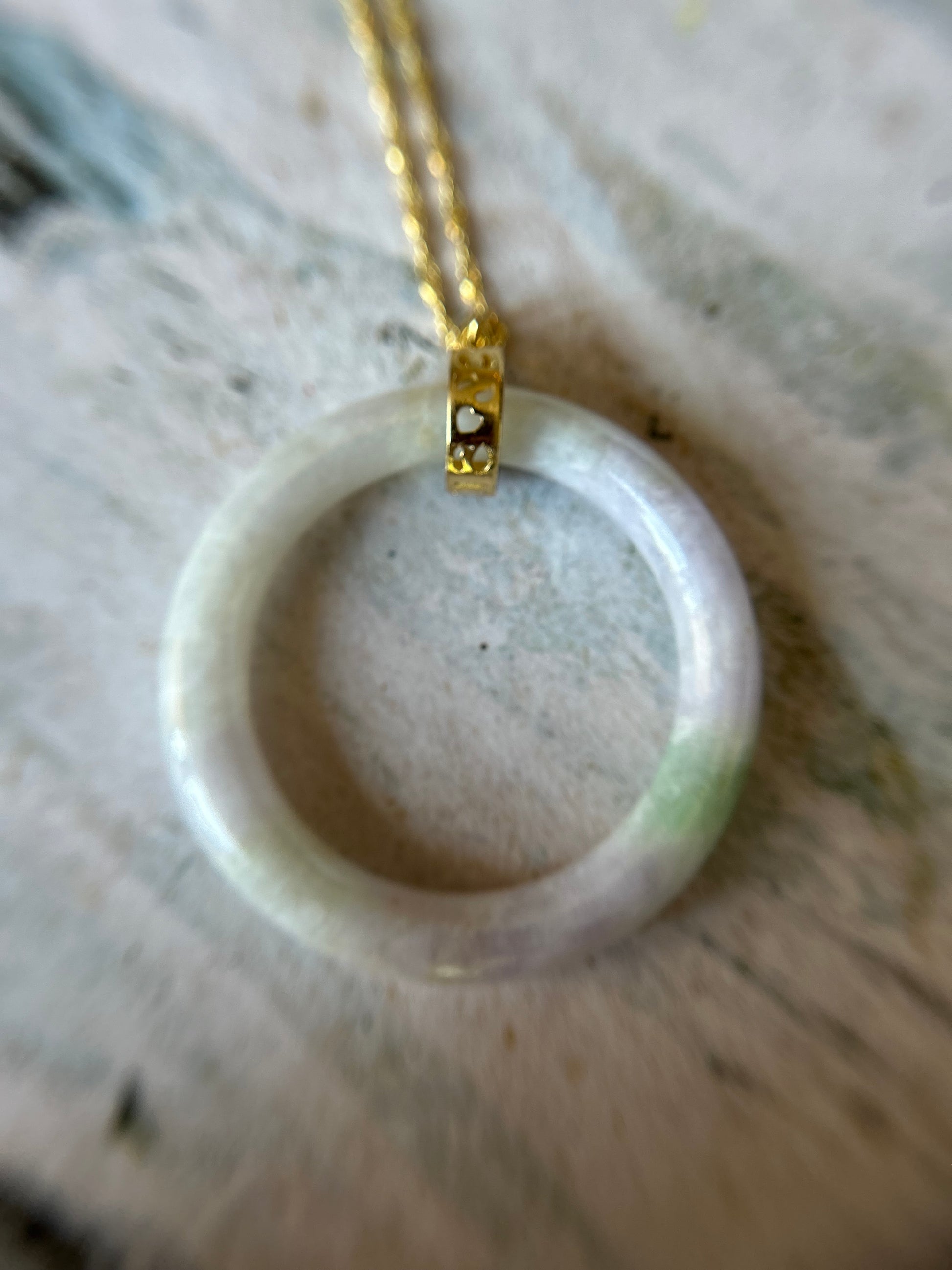 The lavender with green full circle pendant in Chinese signifies all is well and safety for the wearer. the jadeite is an apple green and very translucent. it’s a very classic piece that can be worn casually and can be dress up. the piece is 49.72mm in outer diameter, 7.19mm width and 6.93mm thick.The bail and chain are gold over sterling silver.