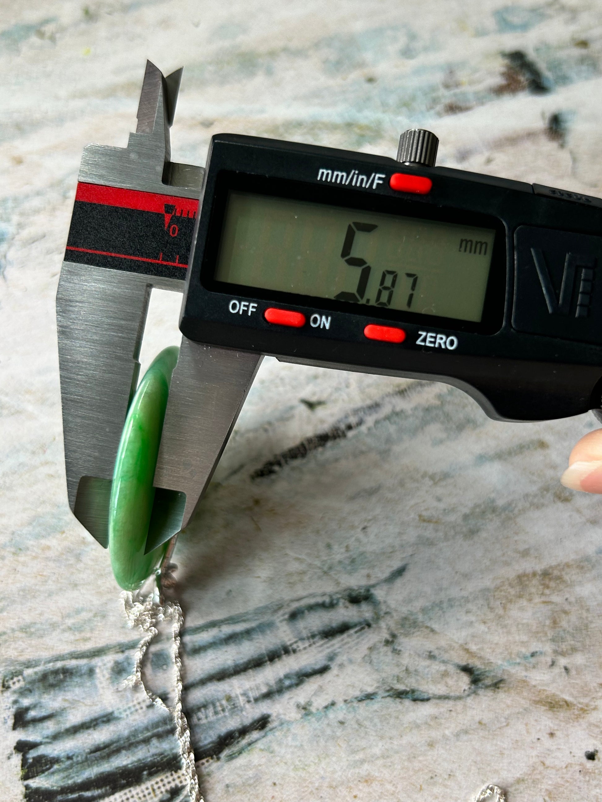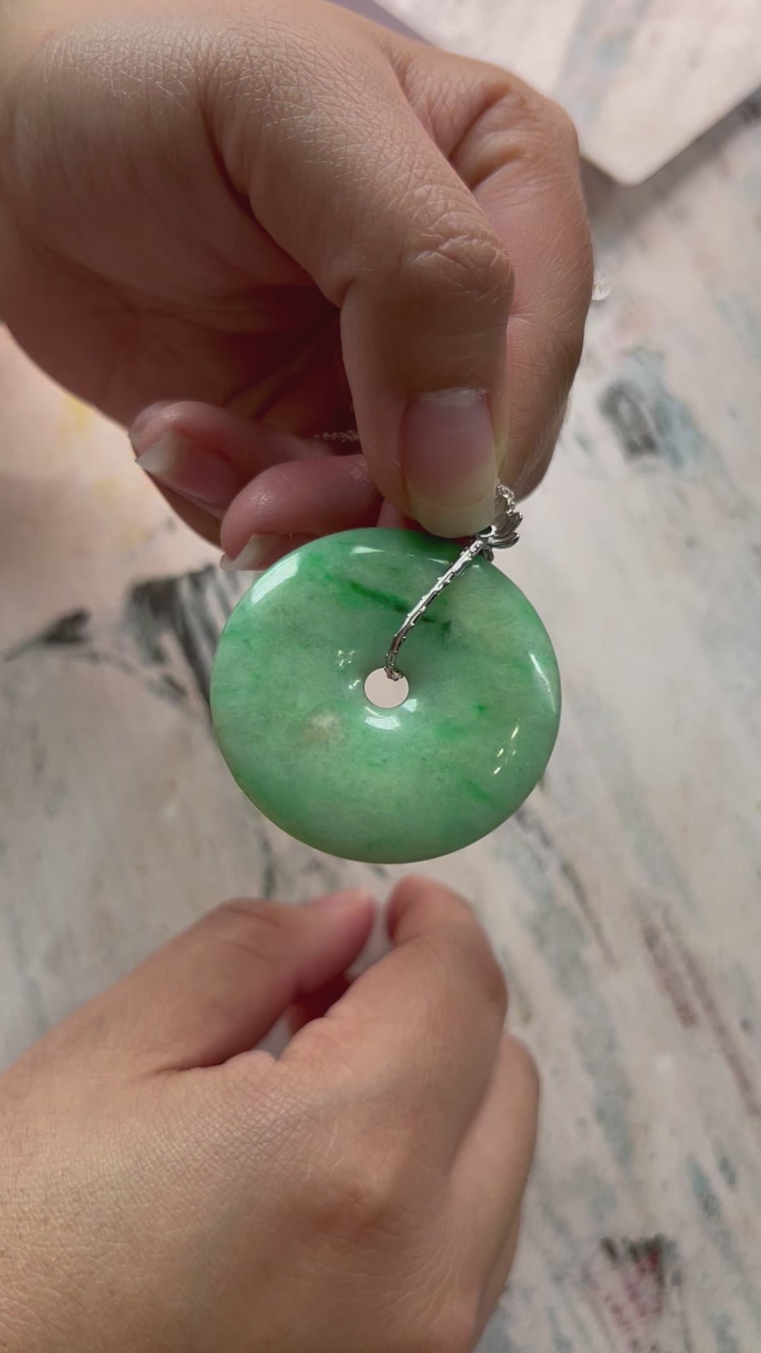 Green donut (ping an kou) pendant. Genuine Type A jadeite. All natural non treated jade. This is a unique translucent piece of jadeite. The donut is 41.23mm in diameter and 5.87mm thick. It is an adjustable necklace.