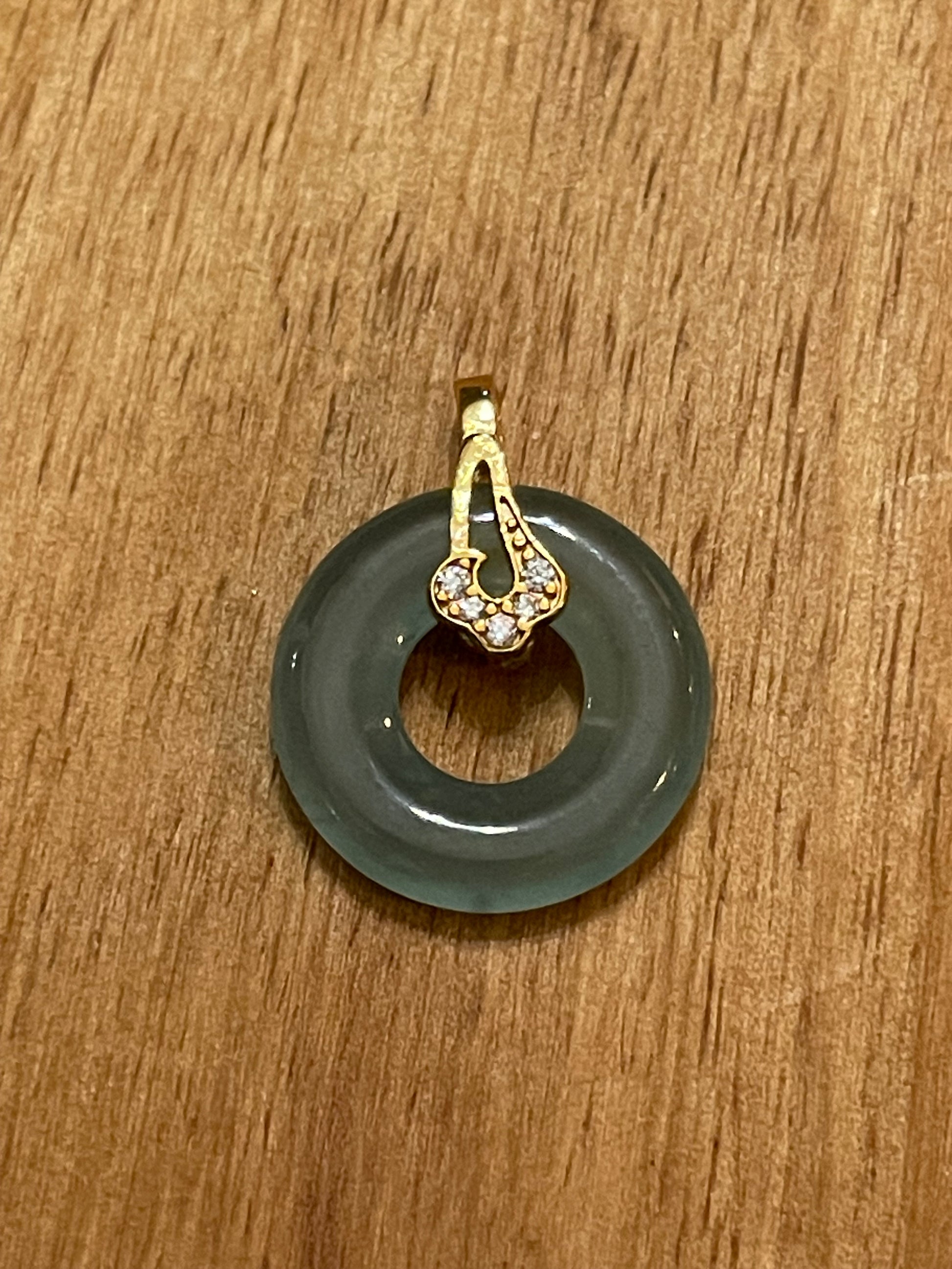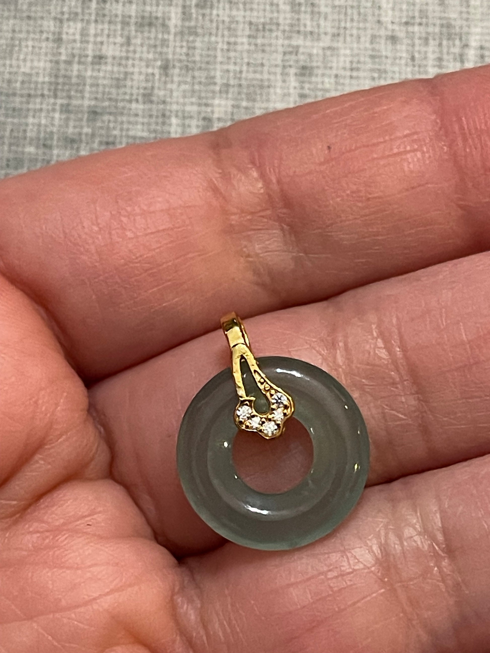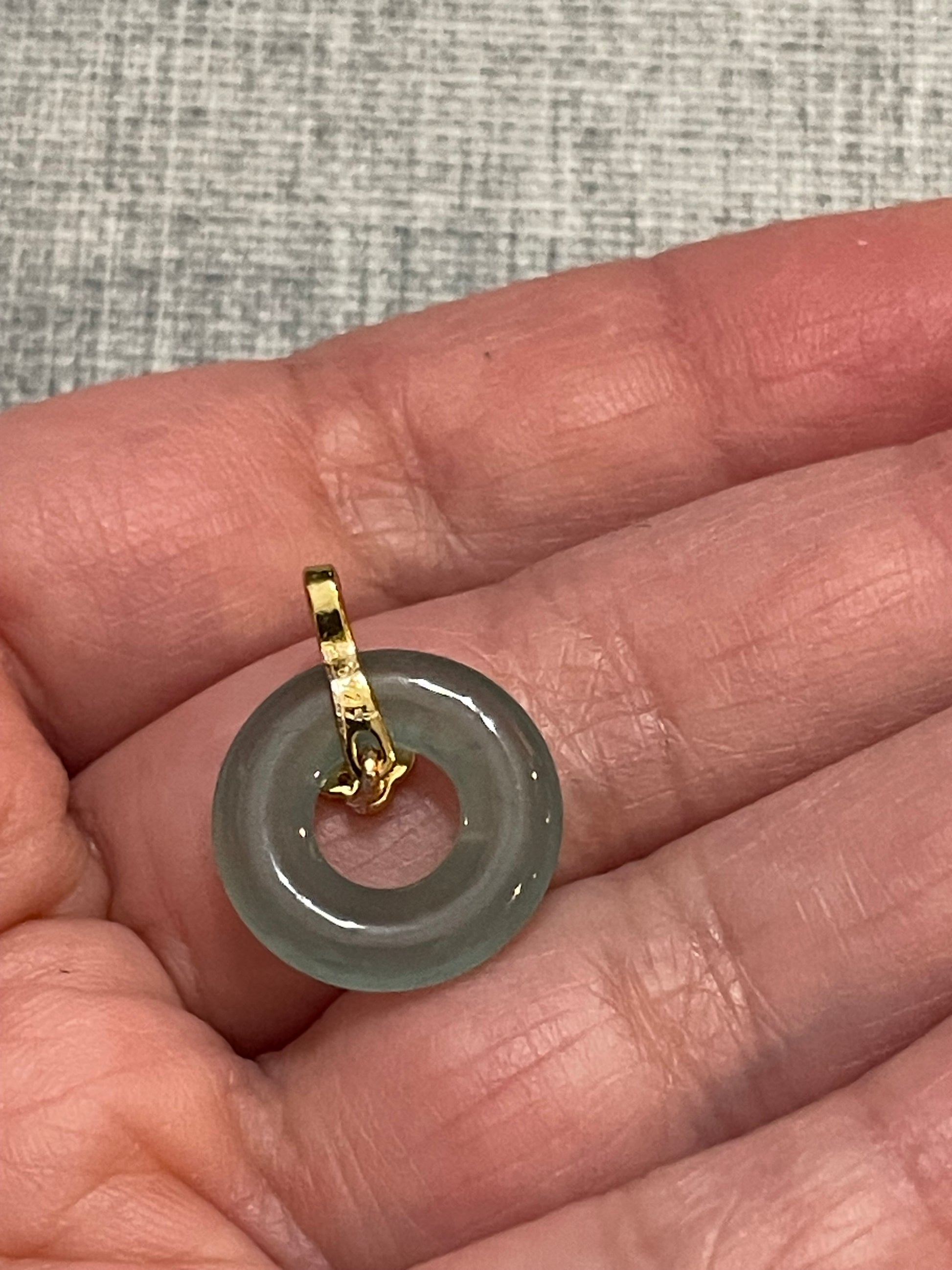 Green donut (ping an kou) pendant. Genuine Type A jadeite. All natural non treated jade. This is a unique translucent piece of jadeite. The donut is 15.79mm in diameter and 2.93mm thick. It is a silver necklace.