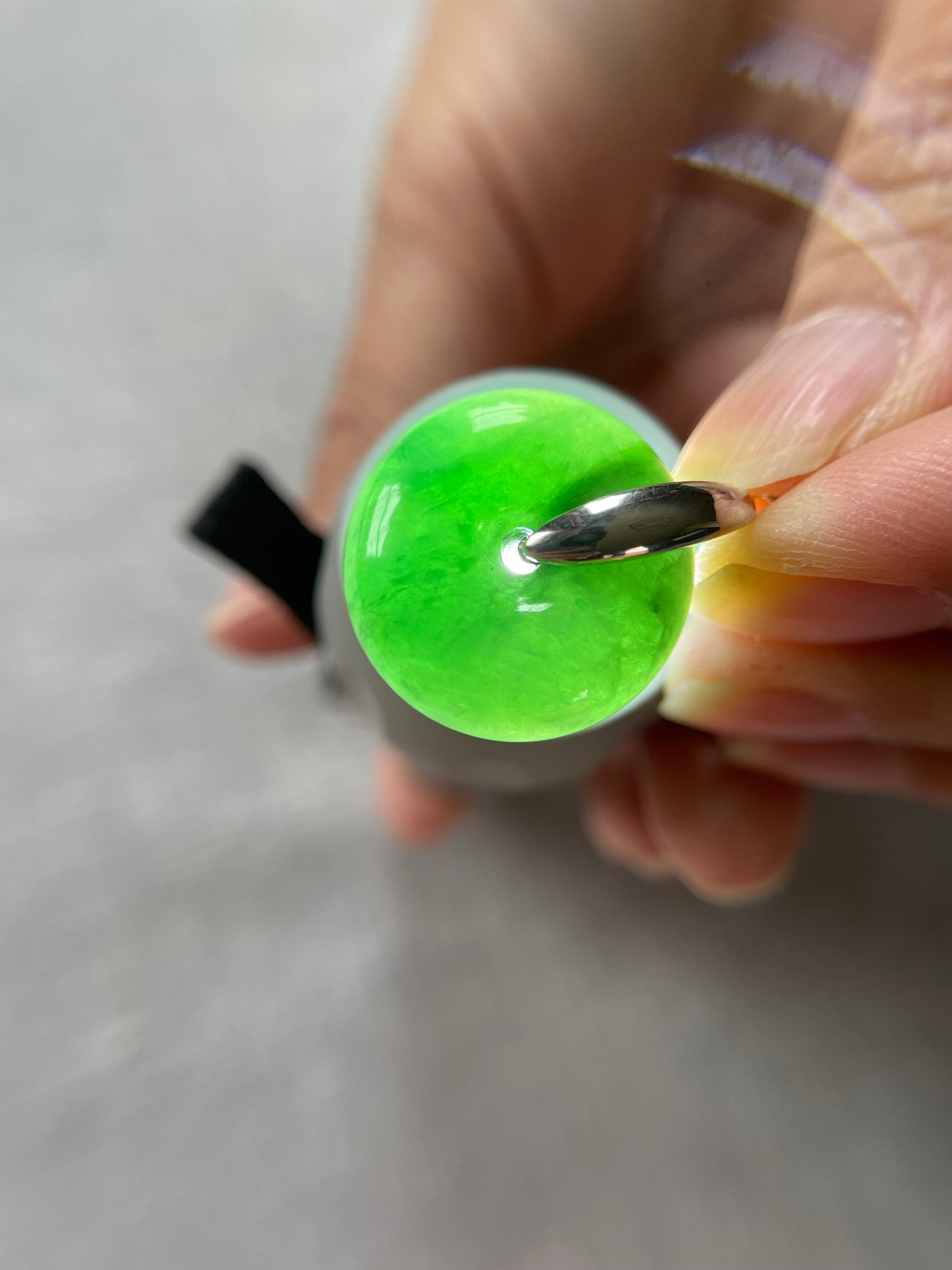 Icy green donut (ping an kou) pendant. Genuine Type A jadeite. All natural non treated jade. This is a unique translucent piece of jadeite. The donut is 20.87mm in diameter and 10.76mm thick.