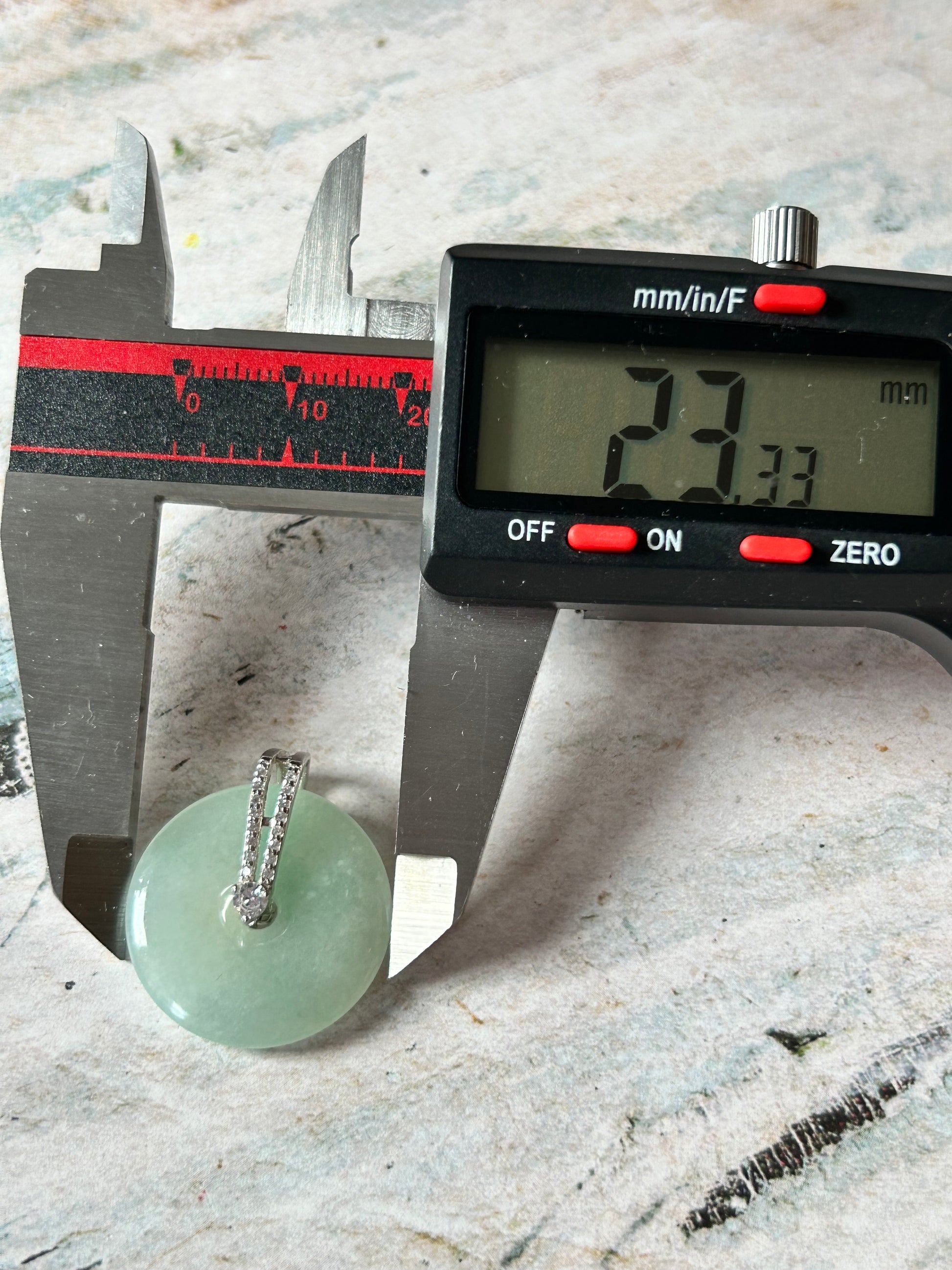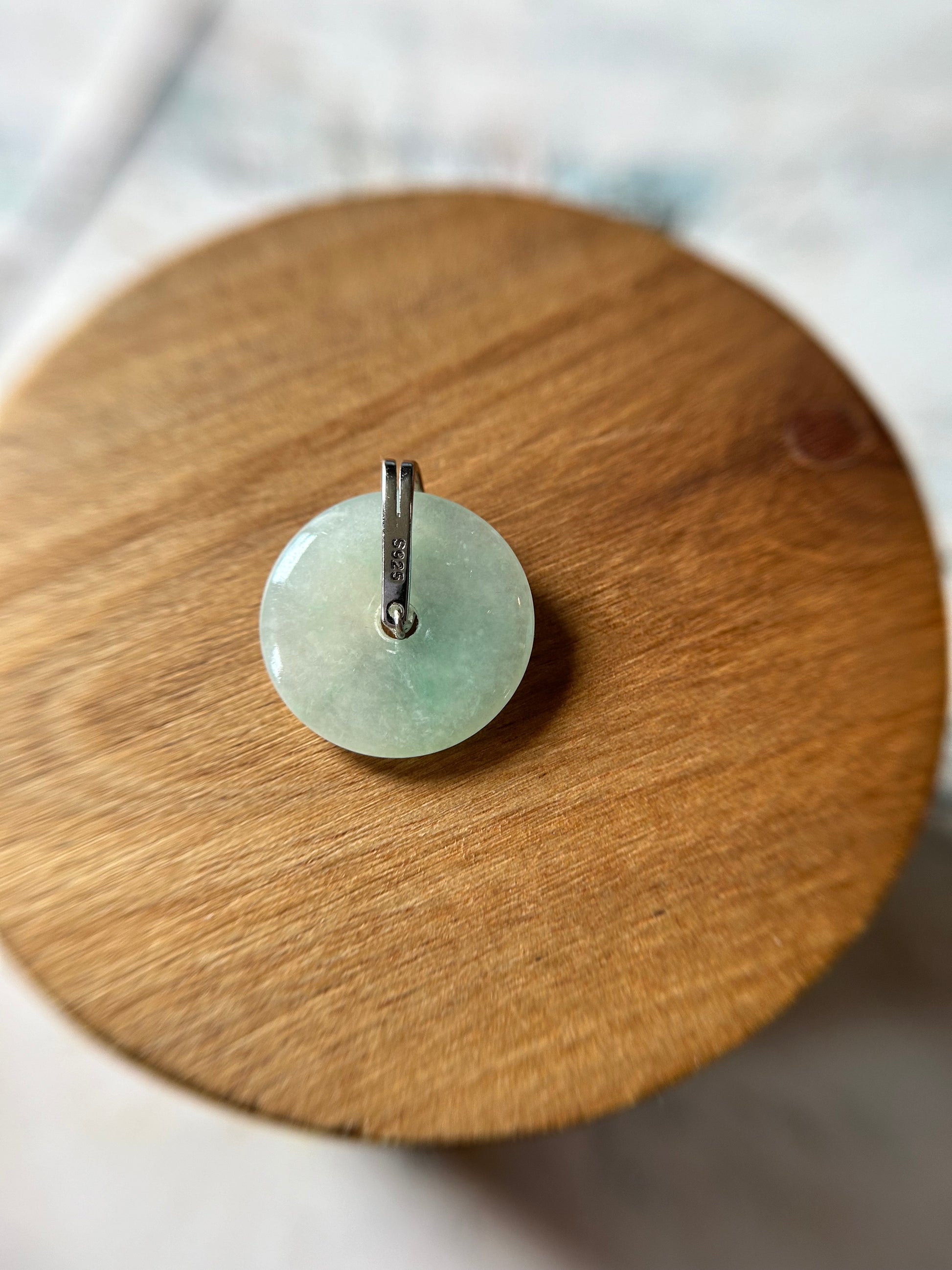 Grade A Natural green Jadeite Pi Disc ( peng on kou, donut) pendant with 2 rows zircon sterling silver bail