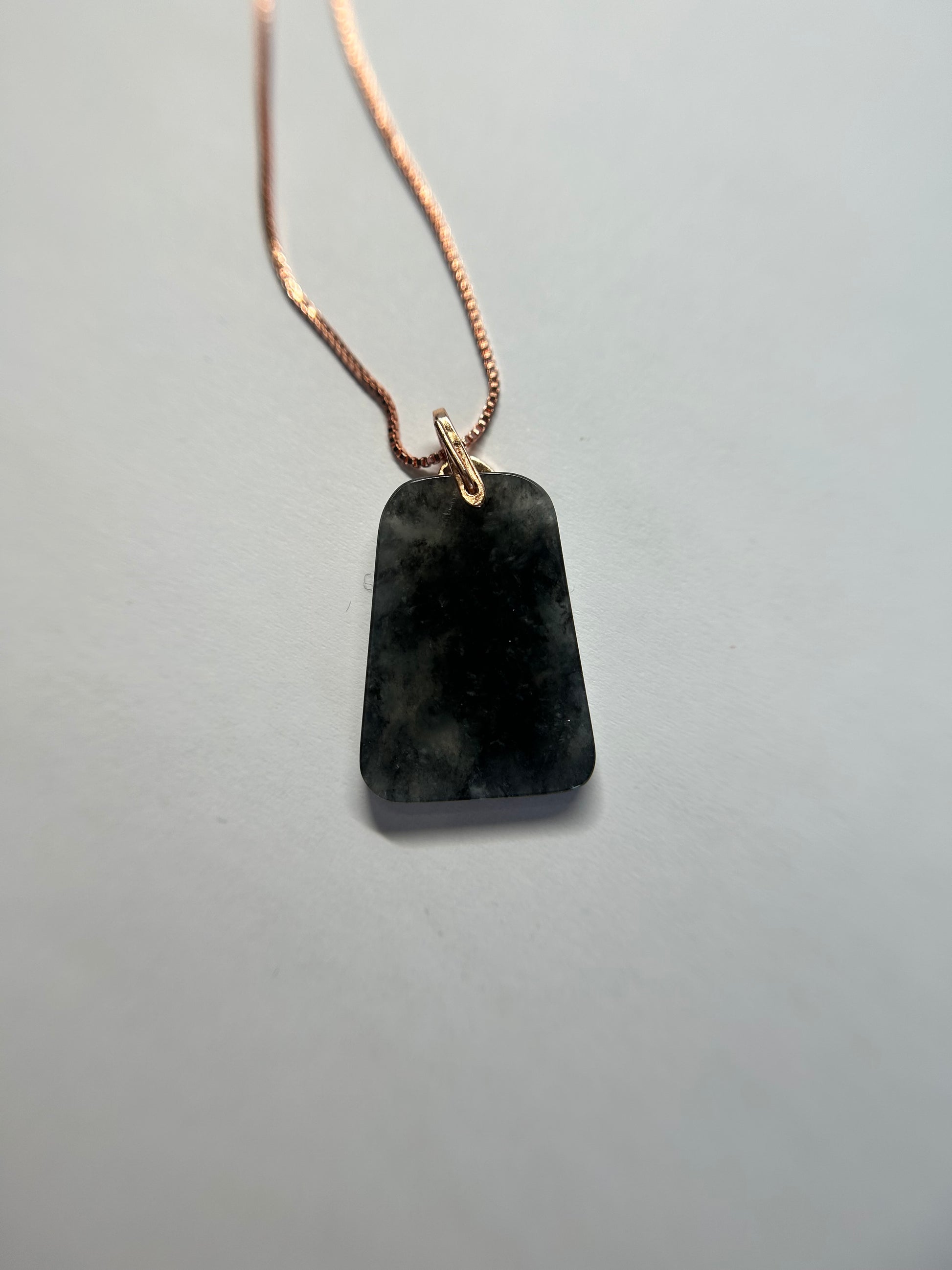 Unique glass black trapezo rose gold plated sterling silver bail.  it grants safety, harmony, and fortune to its wearers.    Height:26.29mm, width:18.89mm, thick:3.15mm .