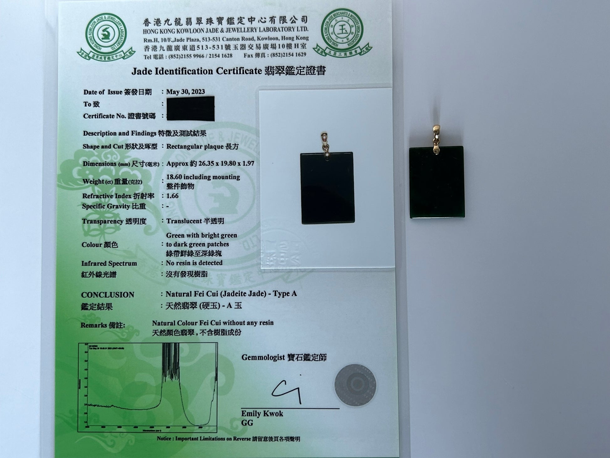 Grade A Natural Highly Icy Dark Green Rectangle 18K yellow gold bails Pendant