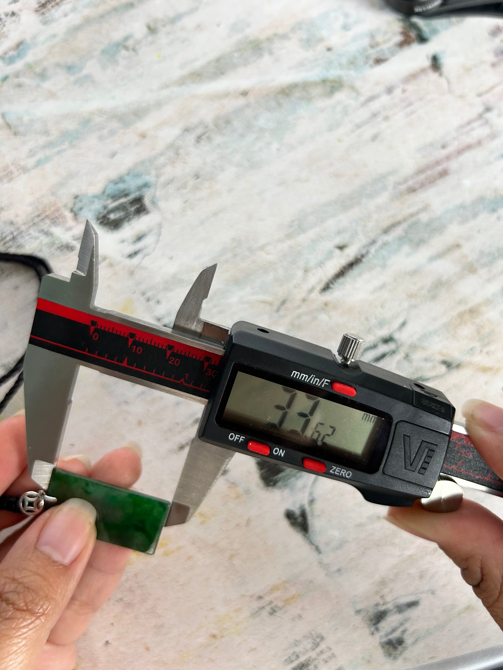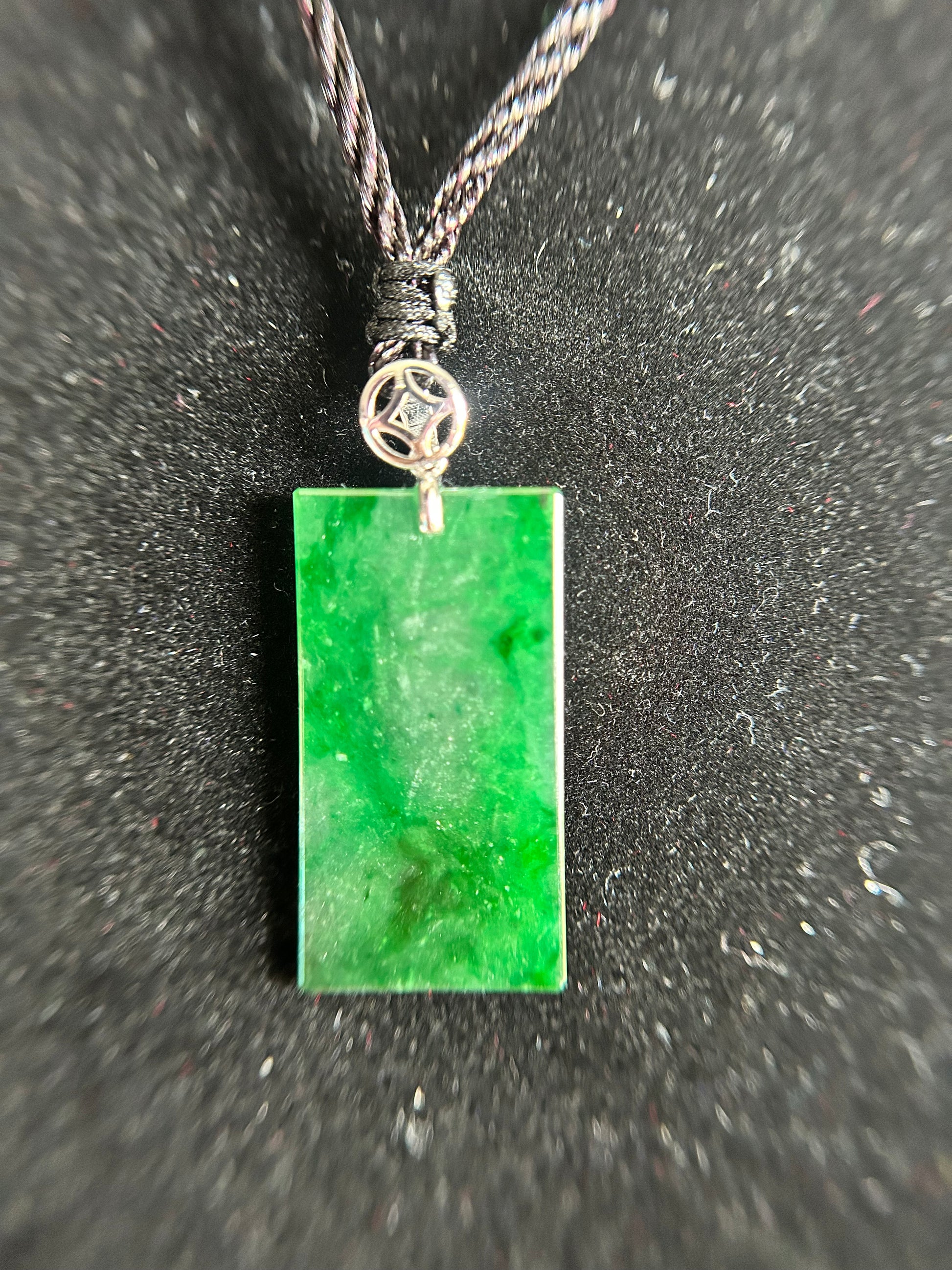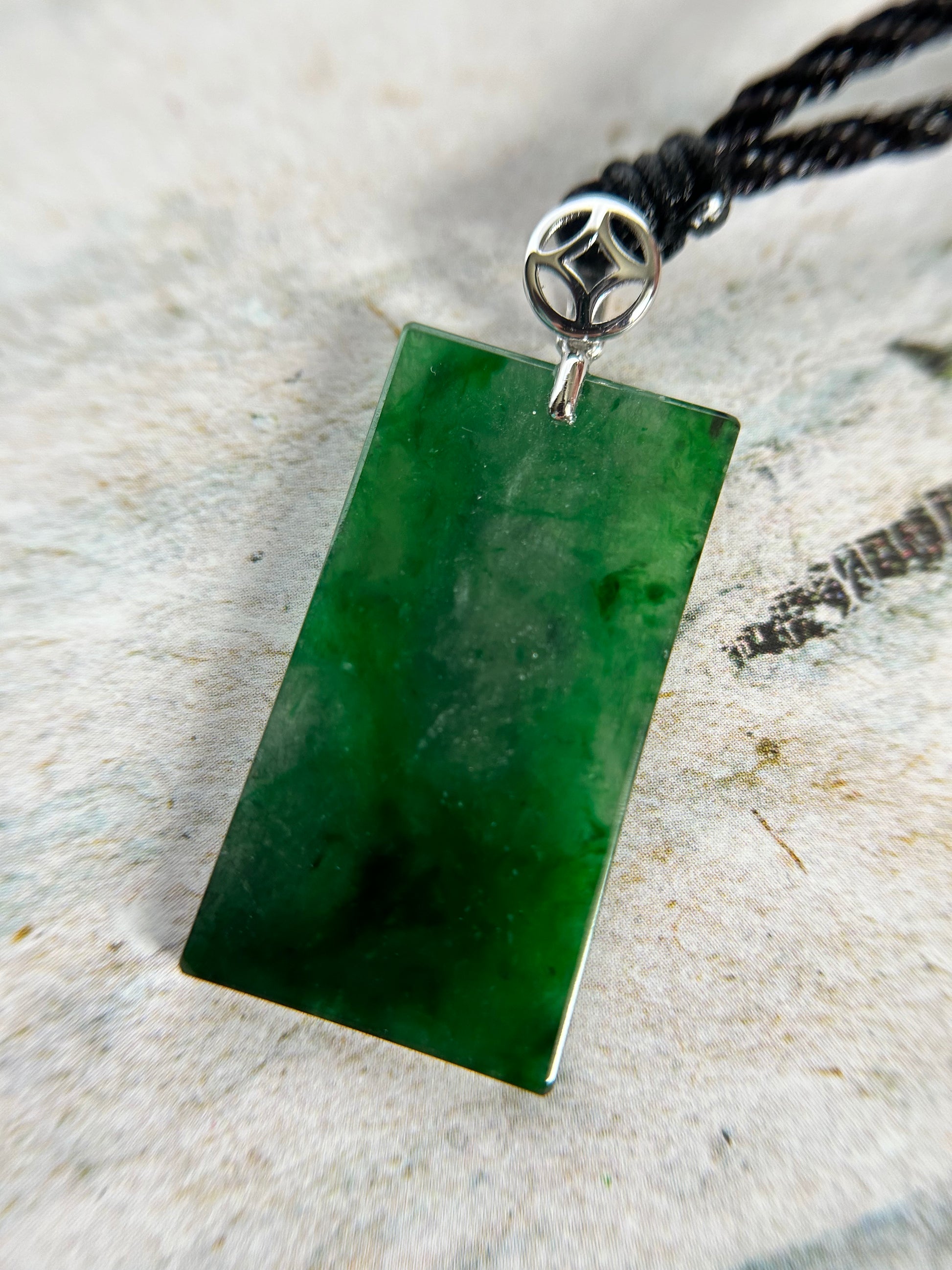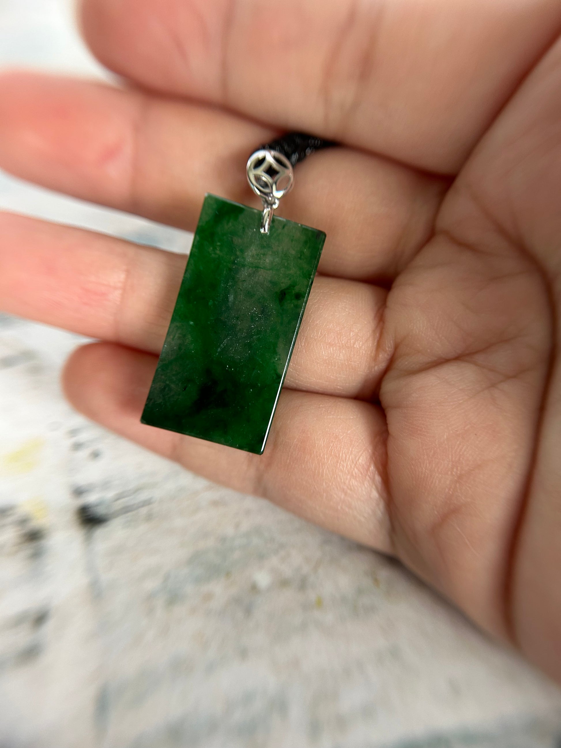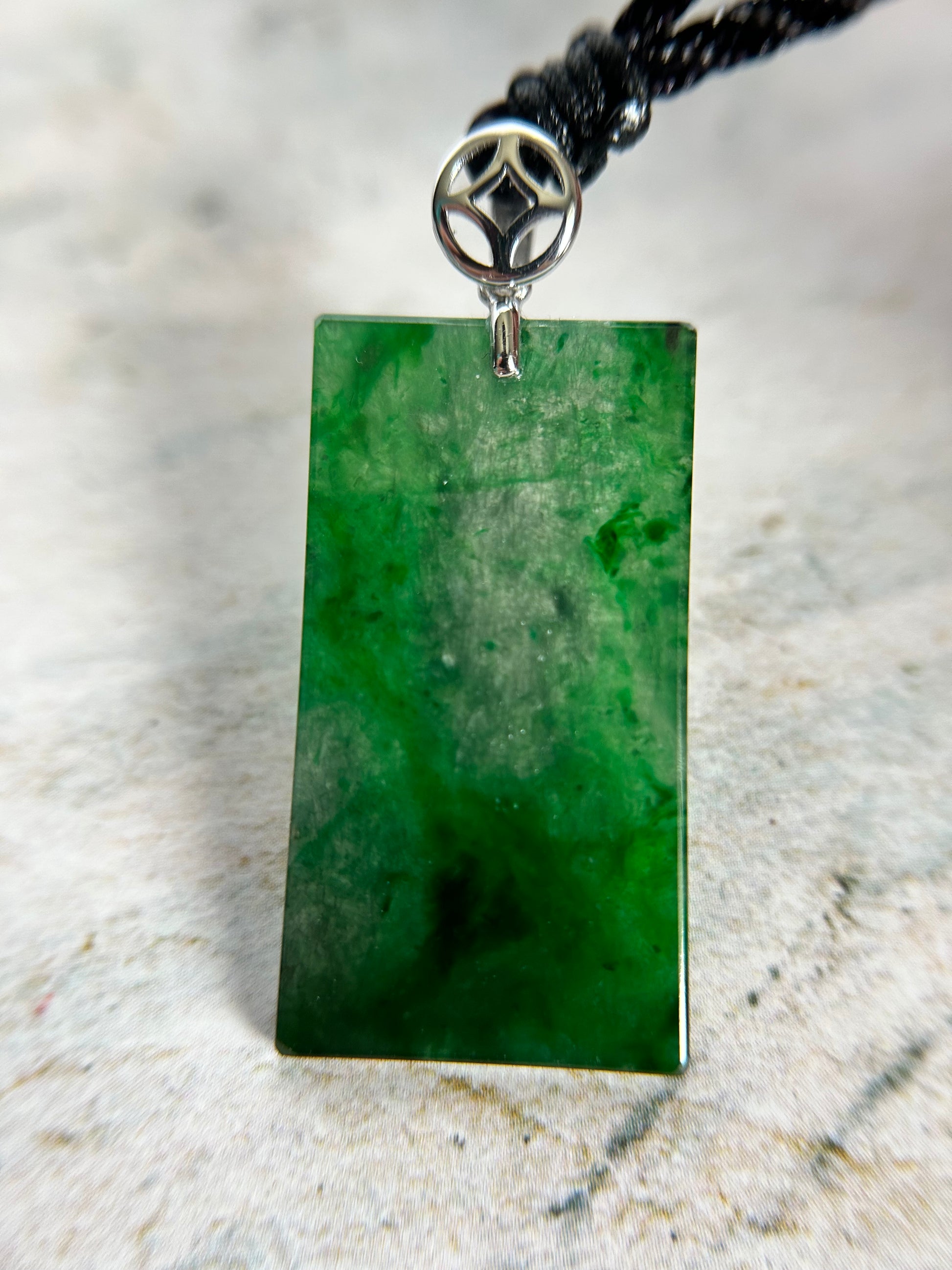 Unique glass green rectangle 18K white gold bail. it grants safety, harmony, and fortune to its wearers. Height:33.62mm, width:17.88mm, thick:2.04mm .
