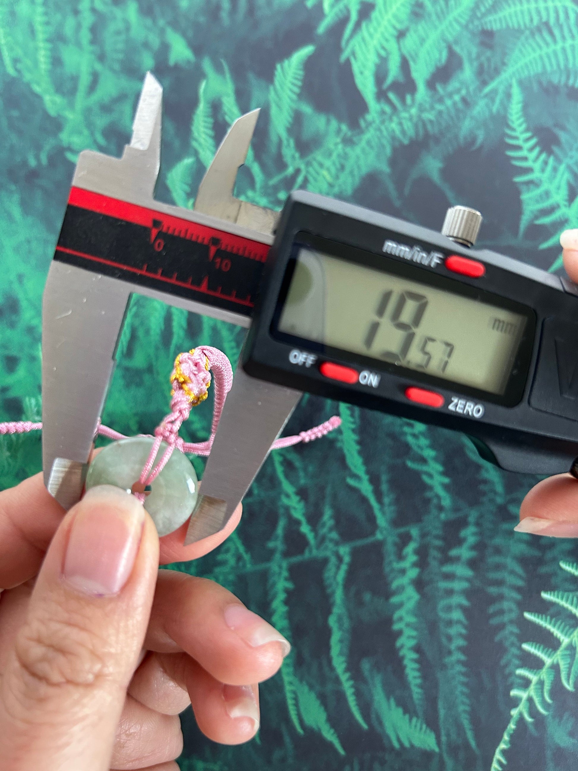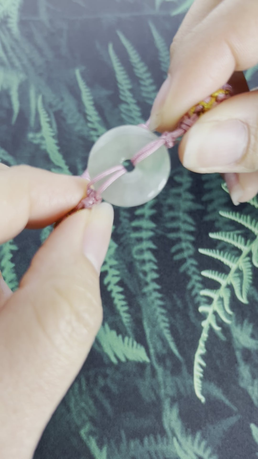 This is a beautiful pi disc braided with pink, and gold accents rope. The green translucent jadeite is 19.57 mm in diameter and it is a Burmese grade A all natural jadeite. This is a unisex piece that is suitable for all ages.