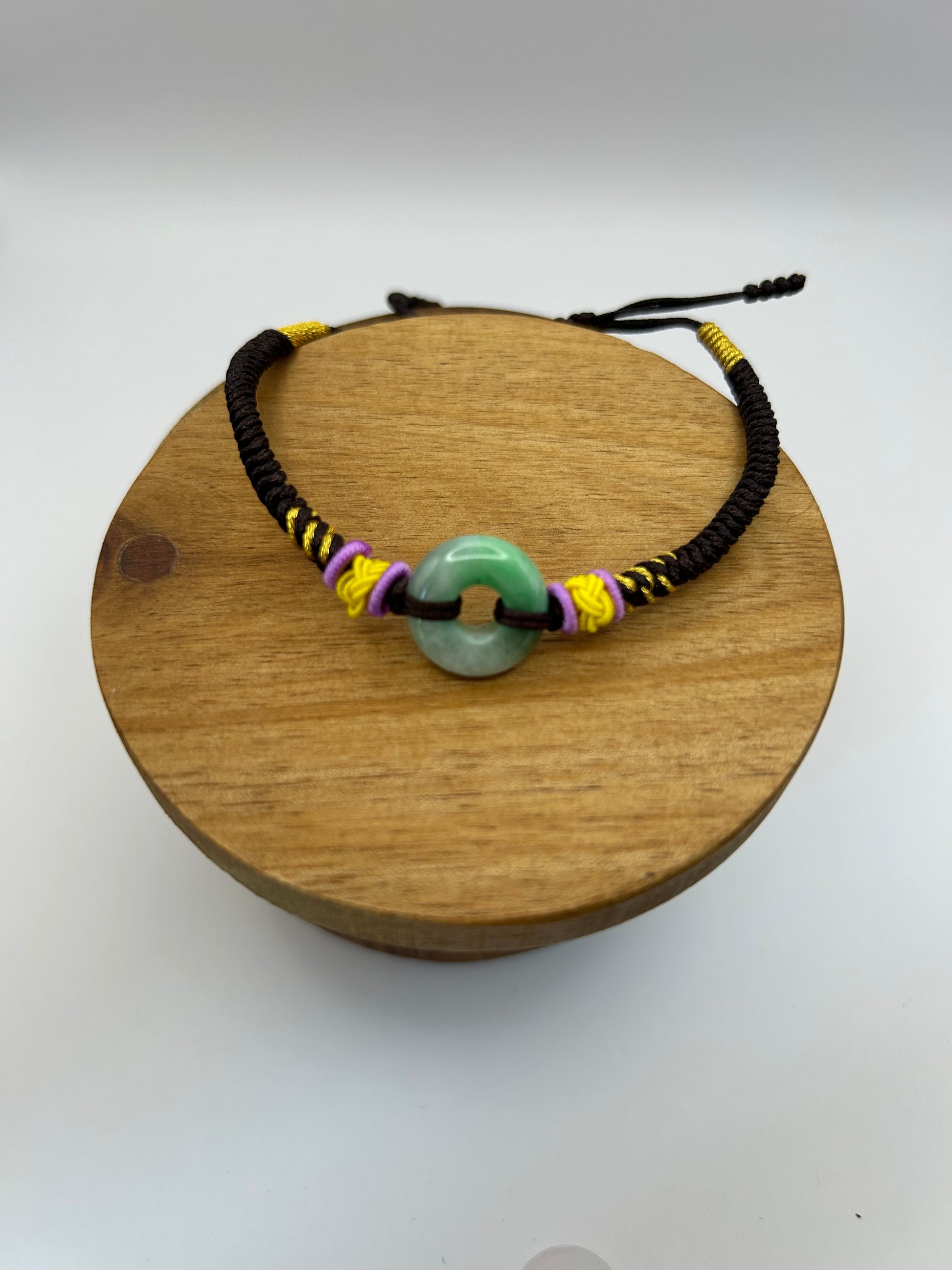Icy green donut ( ping an kou) bracelet braided with black, yellow,and violet rope. This is a unique piece that would look amazing on anyone. Genuine Type A jadeite. All natural non treated jade. This is a beautiful translucent piece. The bracelet can be adjusted from 6 inches to 10 inches.