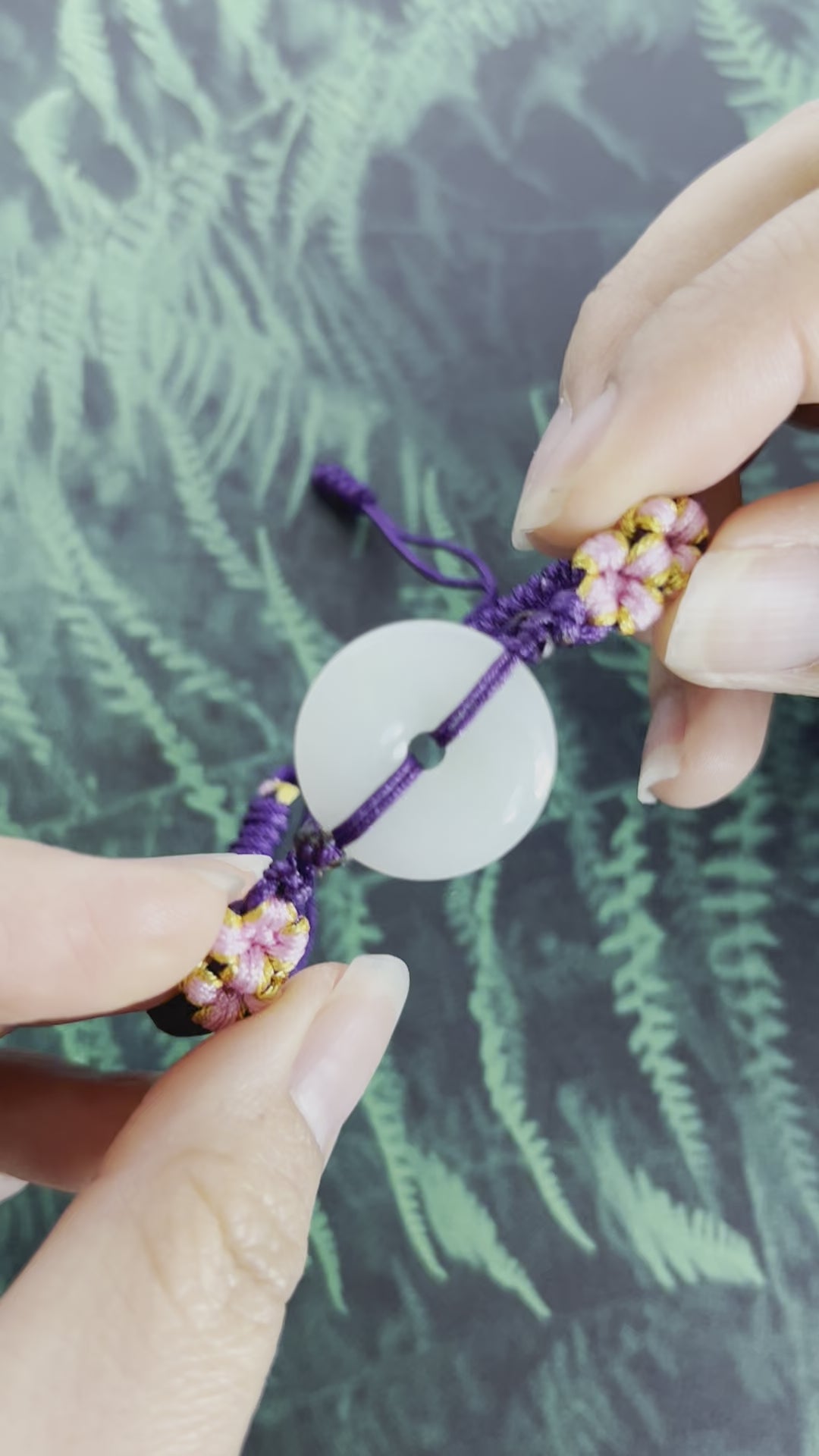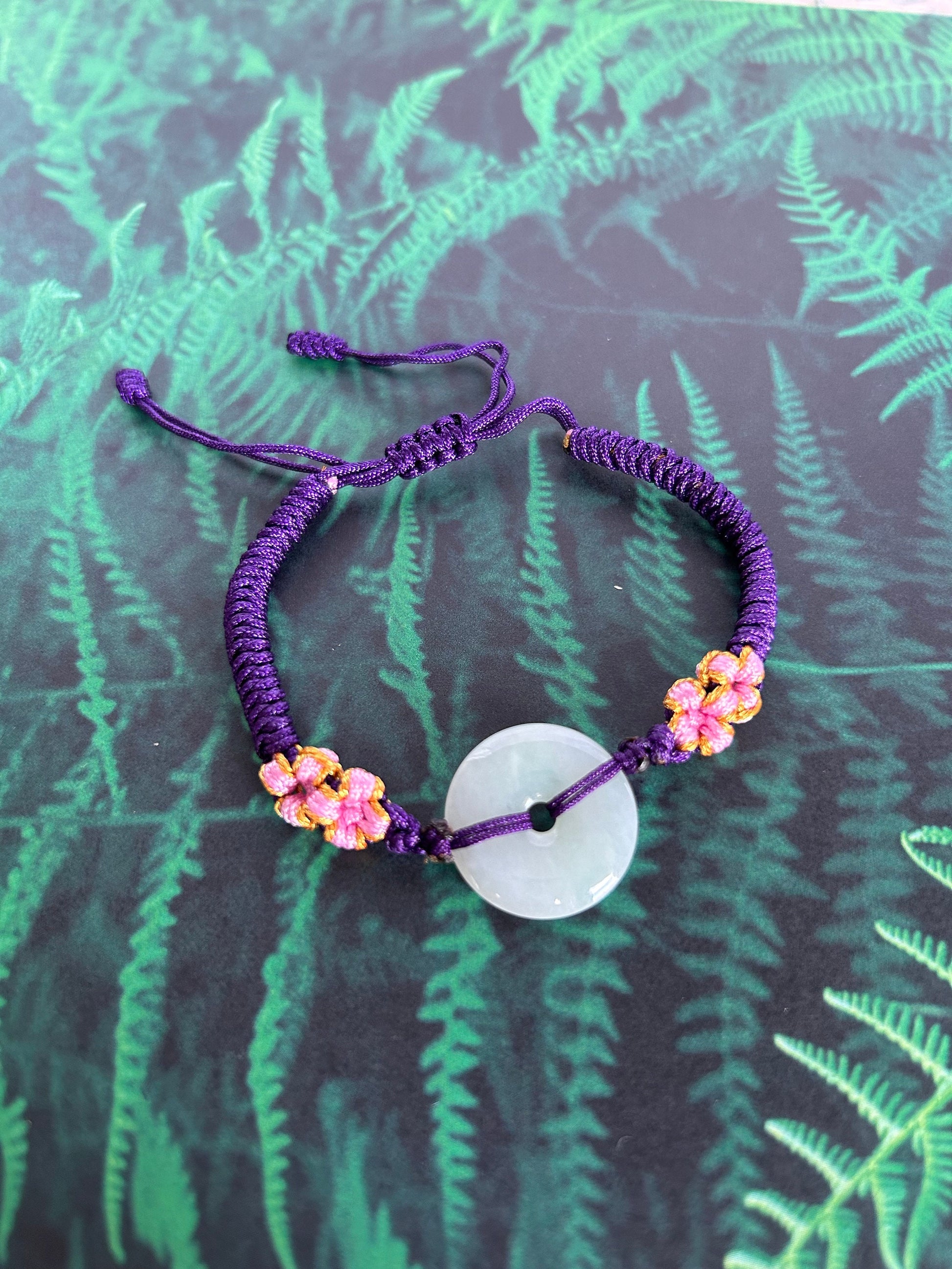 Icy green donut ( ping an kou) bracelet braided with purple, yellow, and pink rope. This is a unique piece that would look amazing on anyone. Genuine Type A jadeite. All natural non treated jade. This is a beautiful translucent piece. The donut is 20.9 mm. The bracelet can be adjusted from 6 inches to 10 inches.