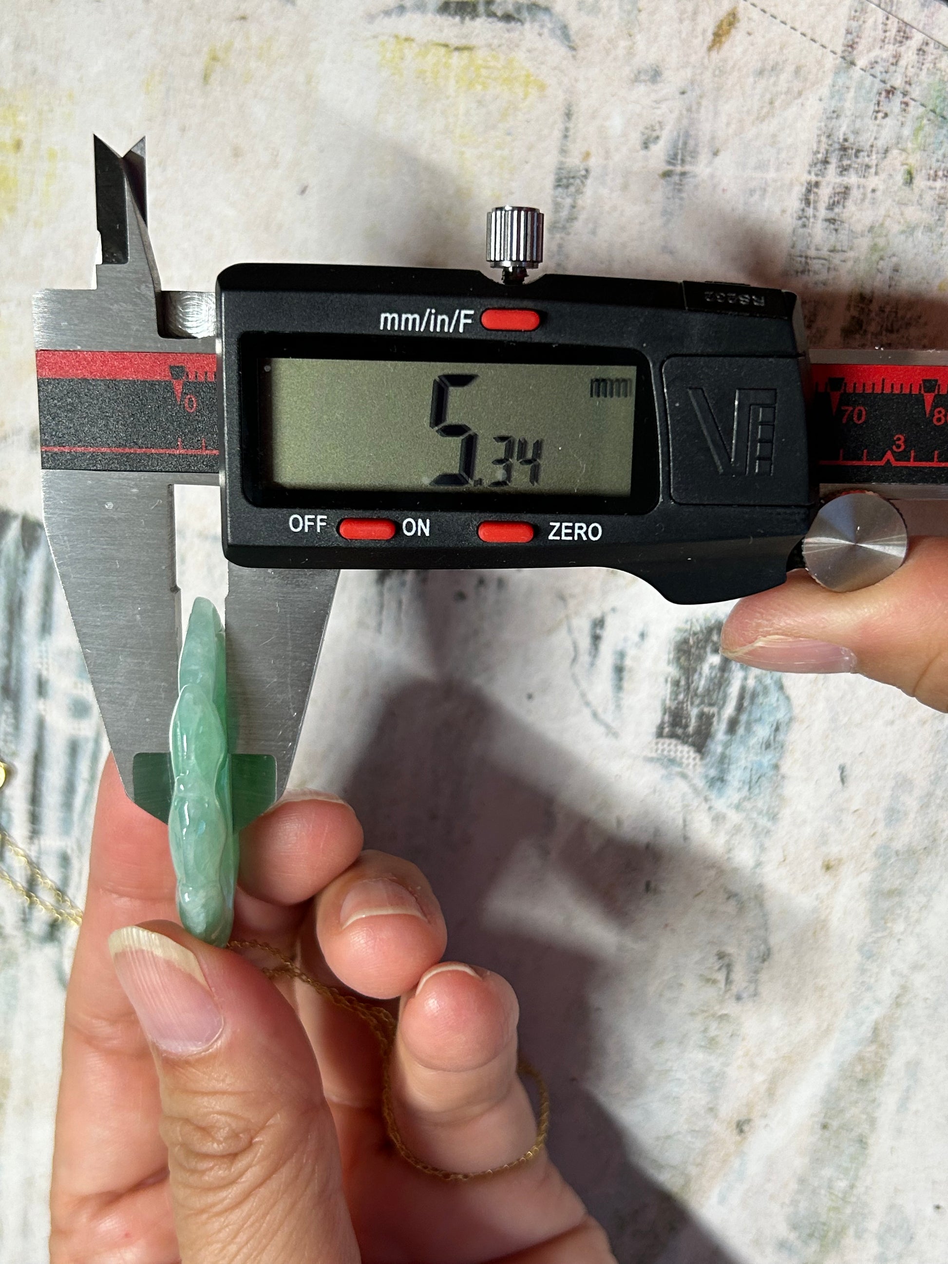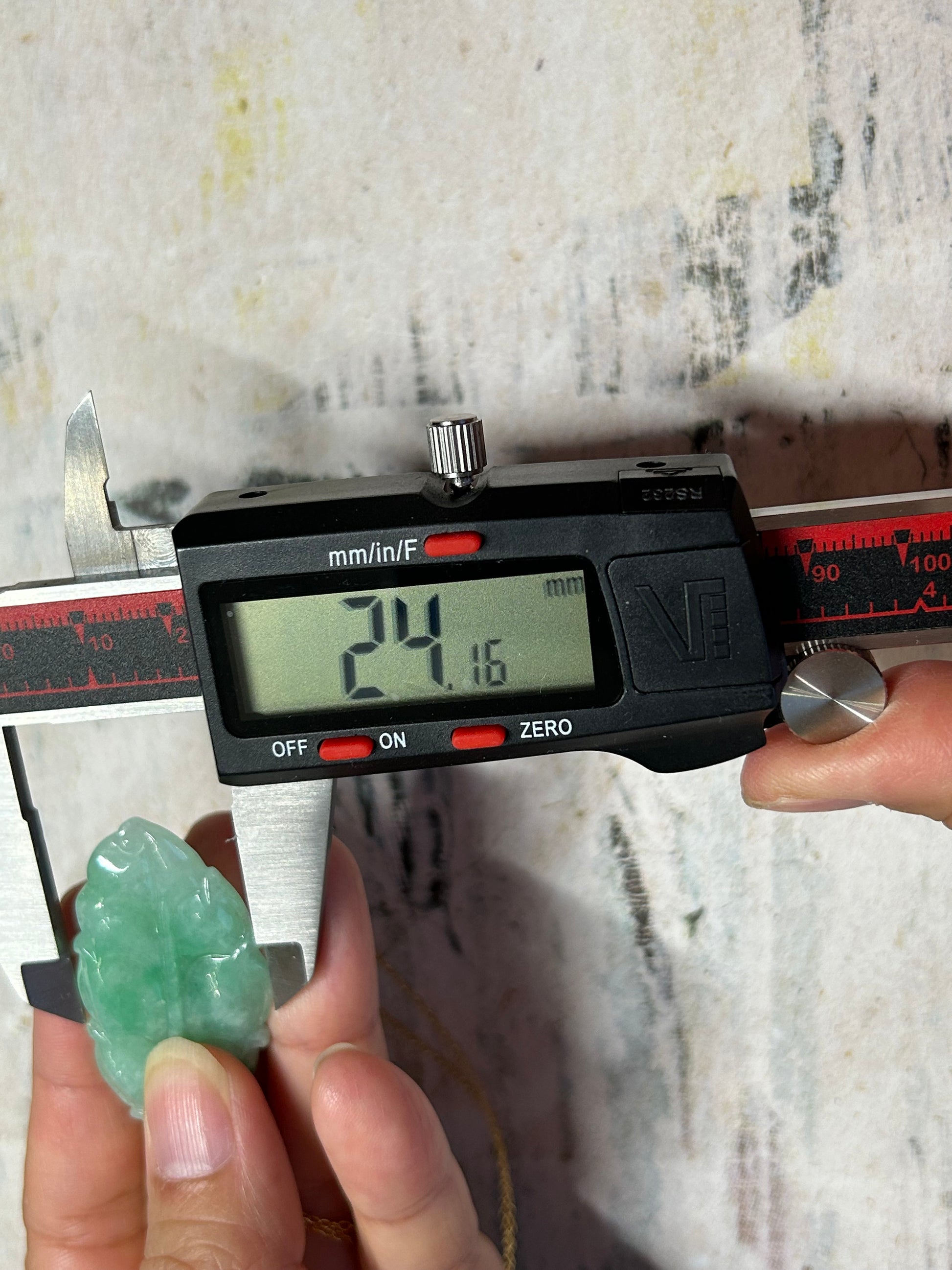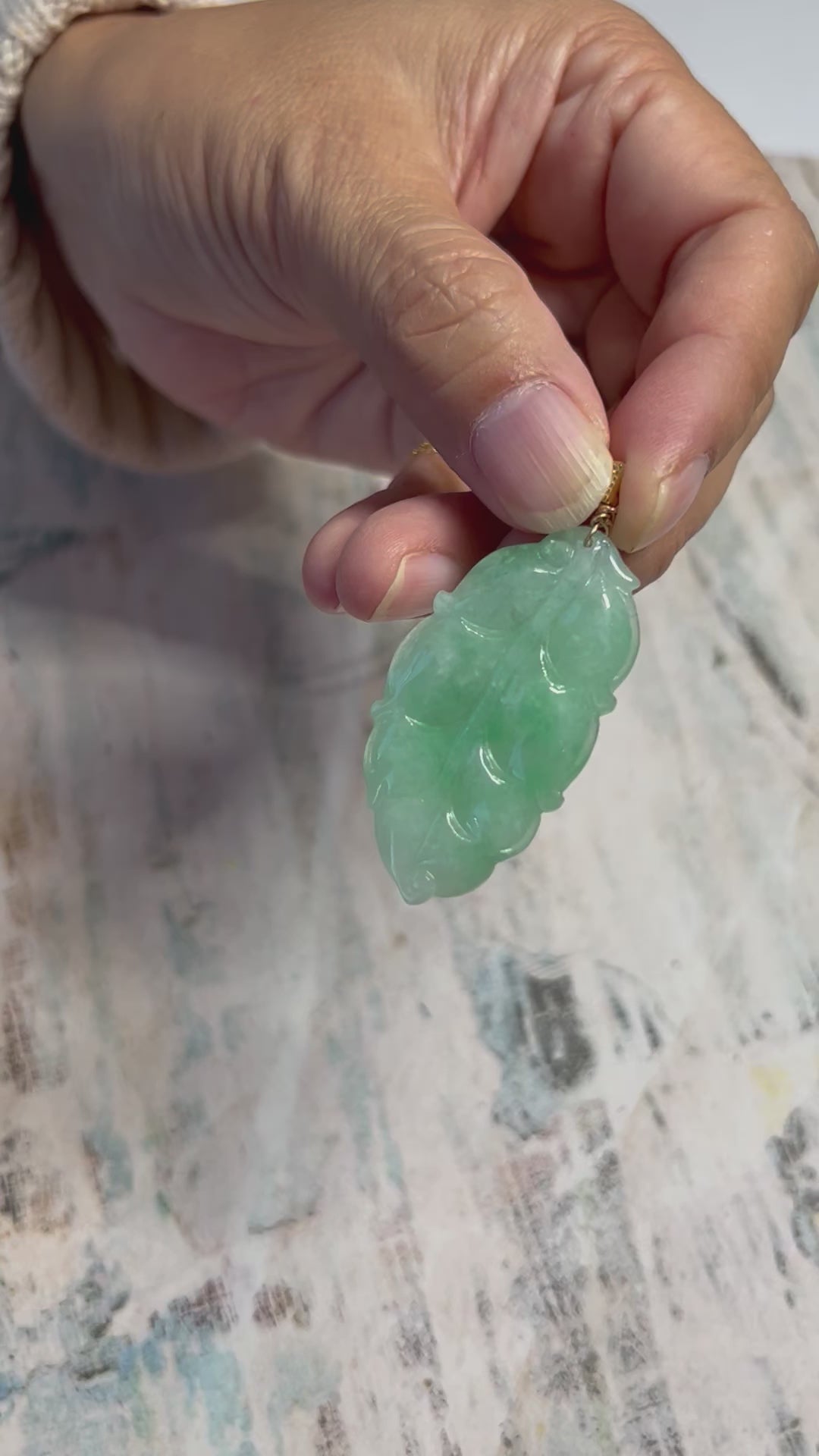This pendant is translucent, and have some light blueish green color. It is hand carved on both sides. Height:45.26mm, width:24.16mm, thick:5.34mm