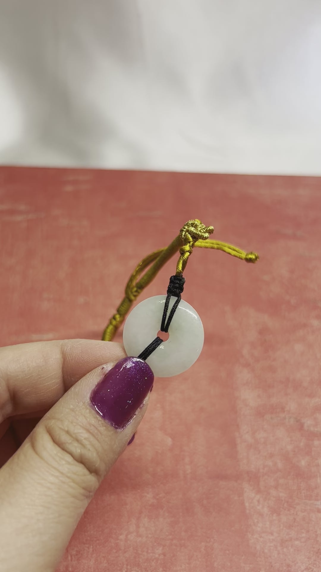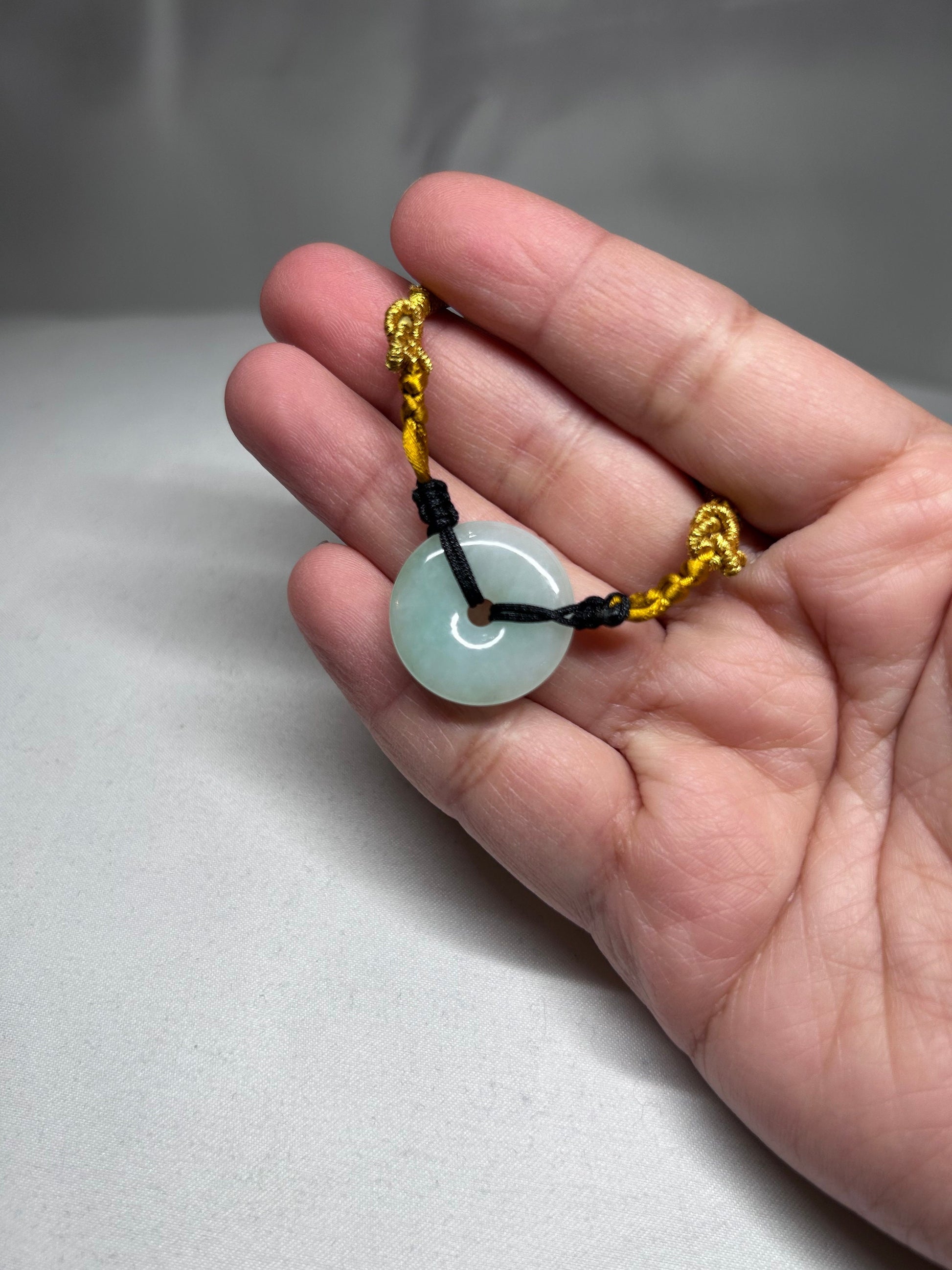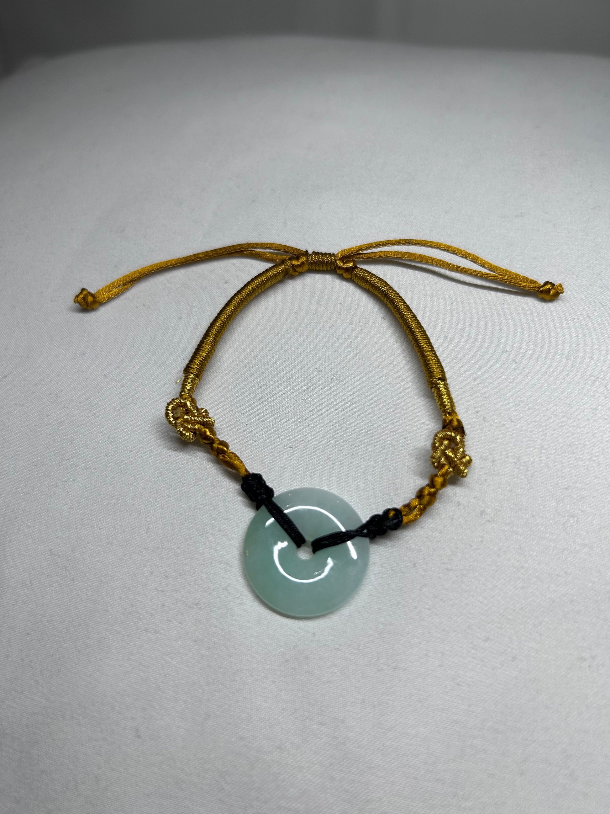 Beautiful translucent green pi disc (ping an kou)  braided with gold and black rope. This is a unisex pieces that is full of meaning.