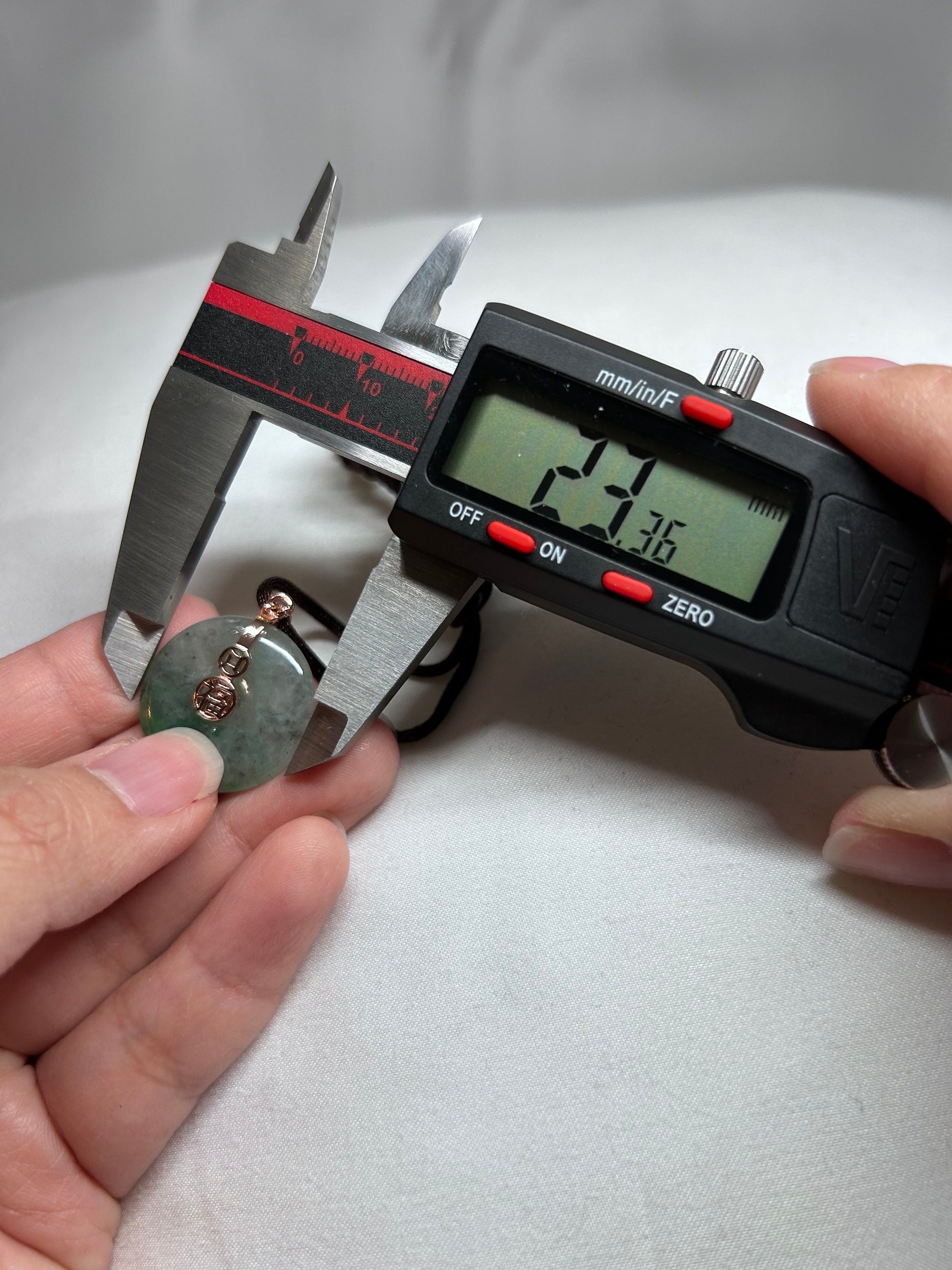 Icy green donut ( ping an kou) pendant. Genuine Grade A jadeite. All natural non treated jade. This is a beautiful translucent piece. The mounting is rose gold plated, 925 sterling silver. the pendant is 23.36 mm in diameter.