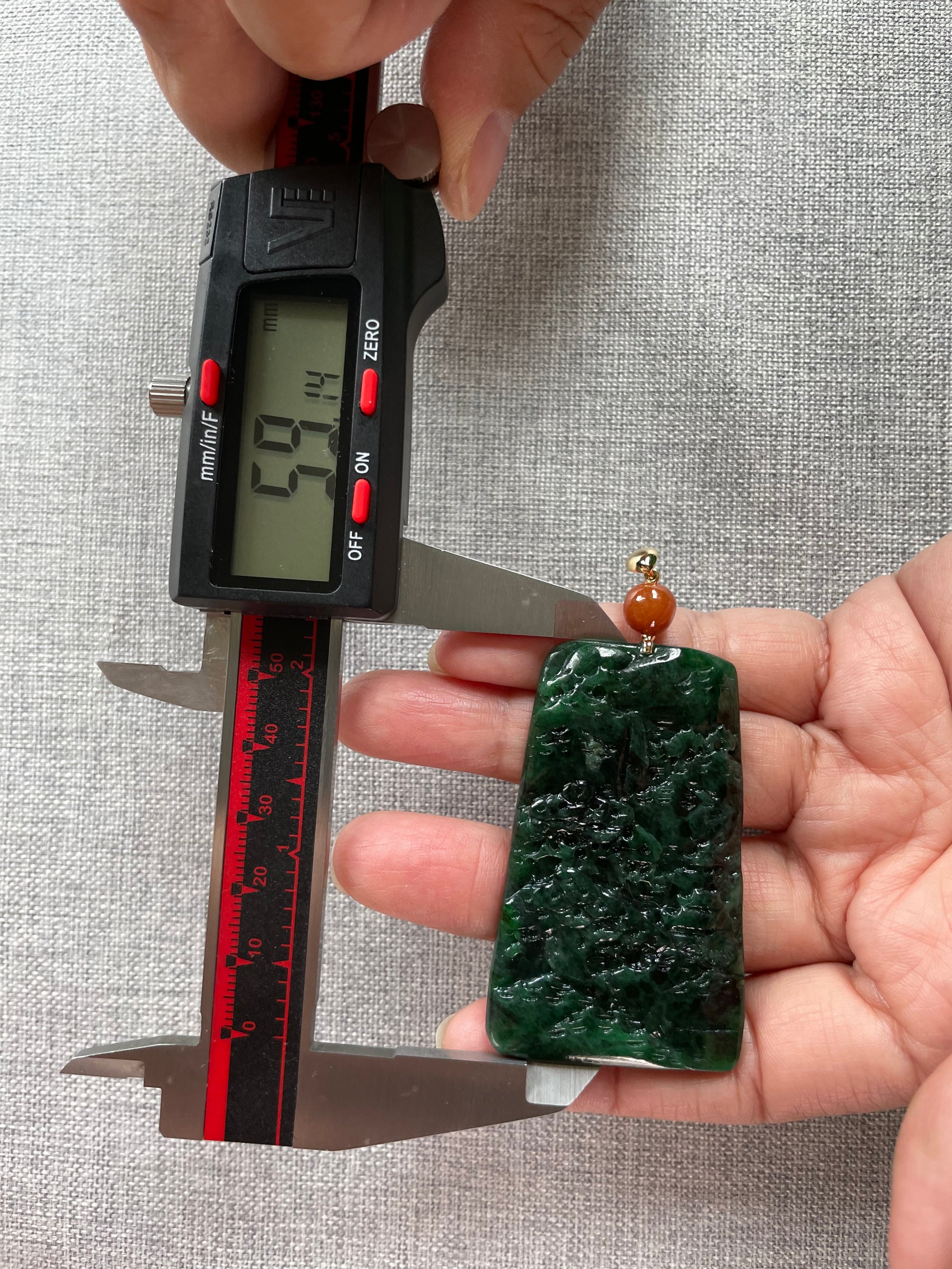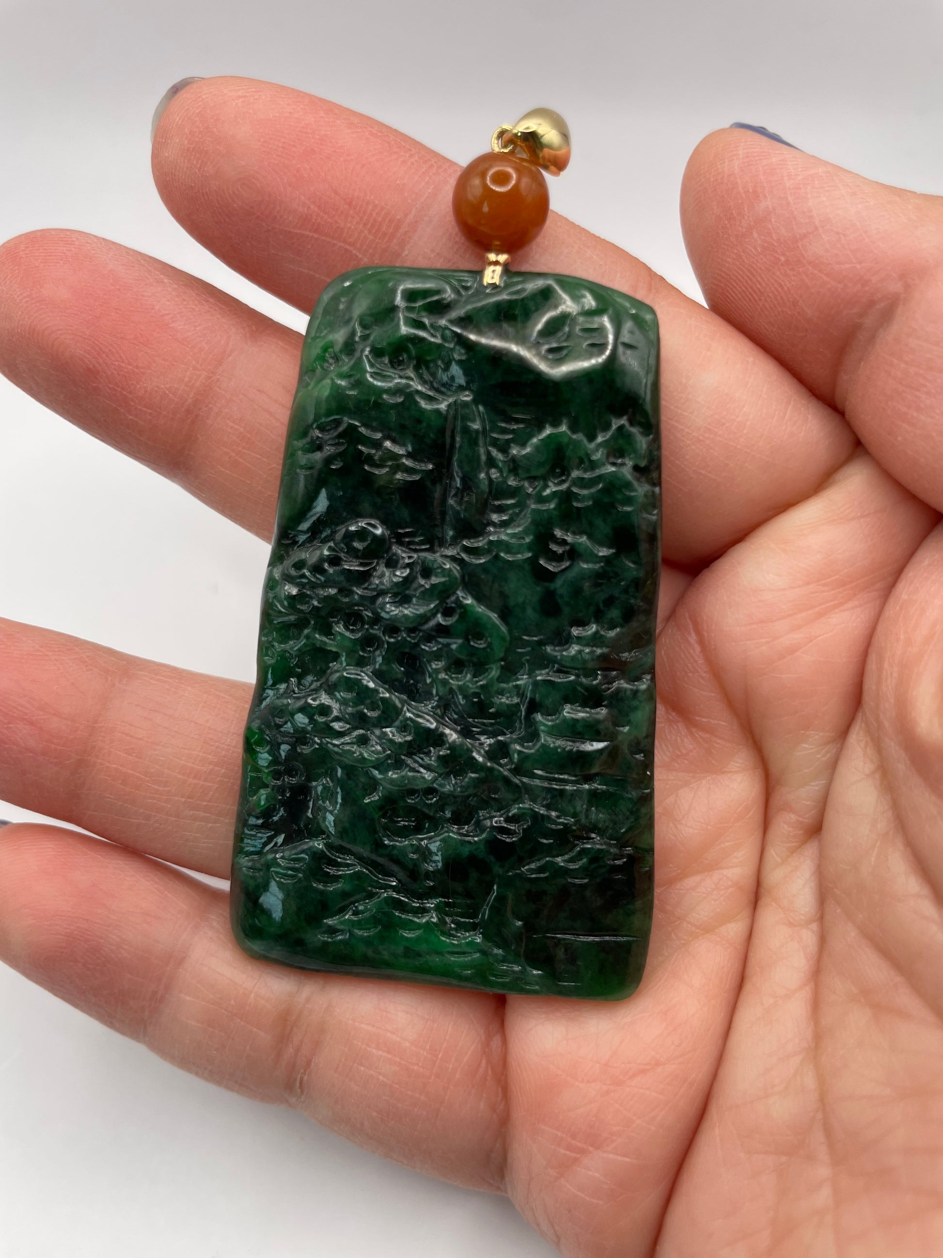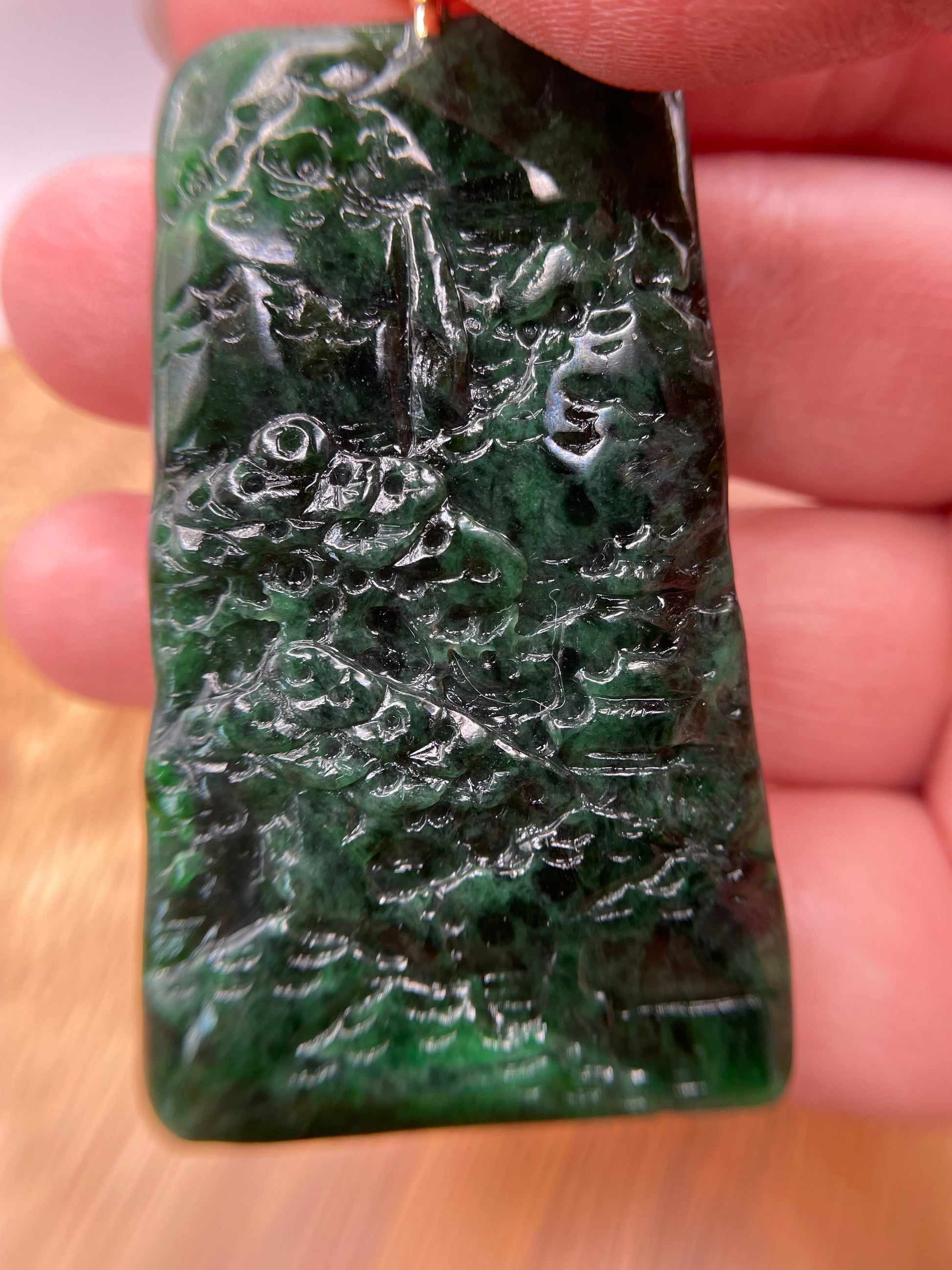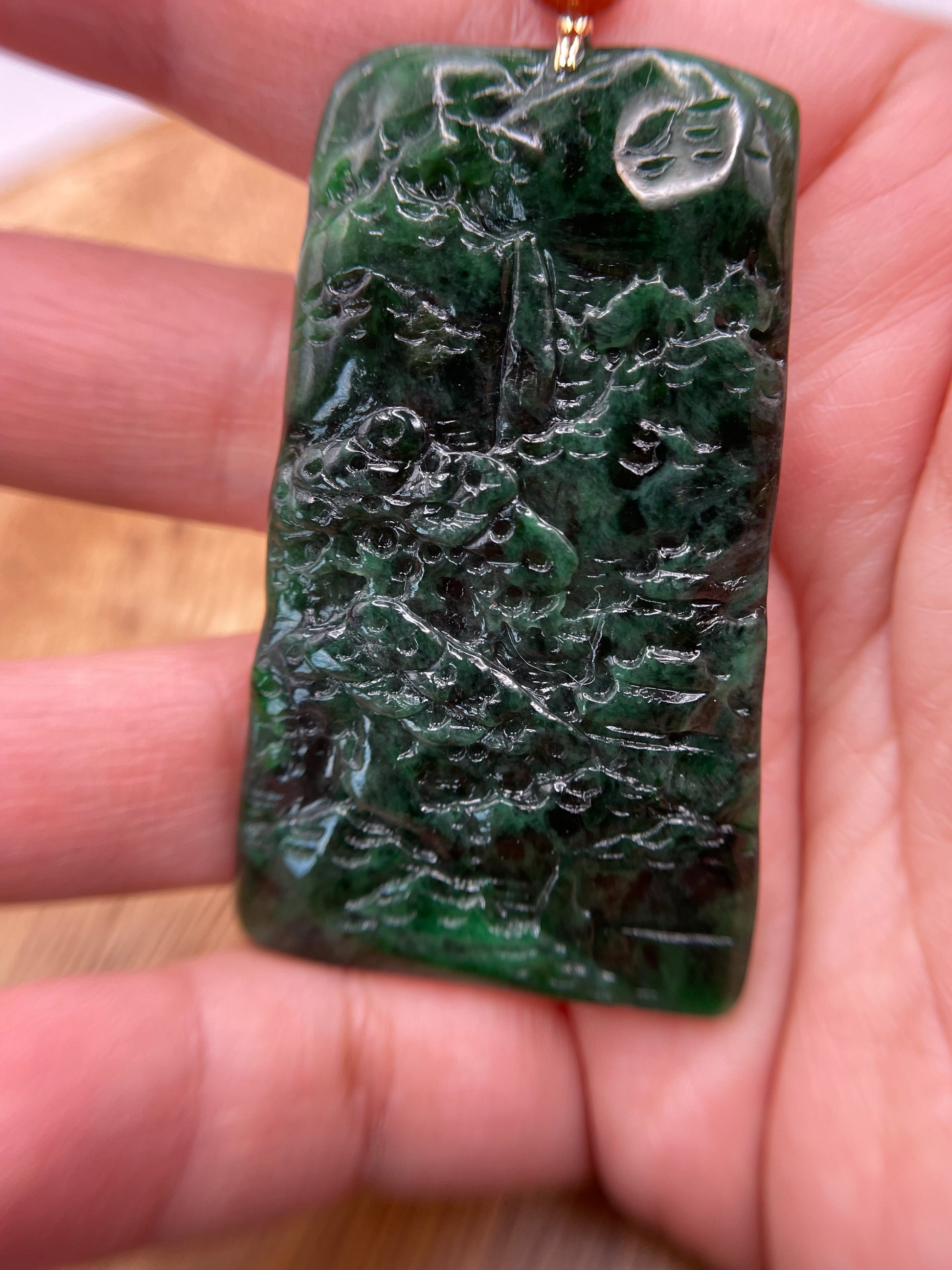 Deep green hand craft mountain view jadeite pendant is elegant , represents nobility and career success. The pendant is Grade A jadeite guarantee non treated, bleached, or dyed.