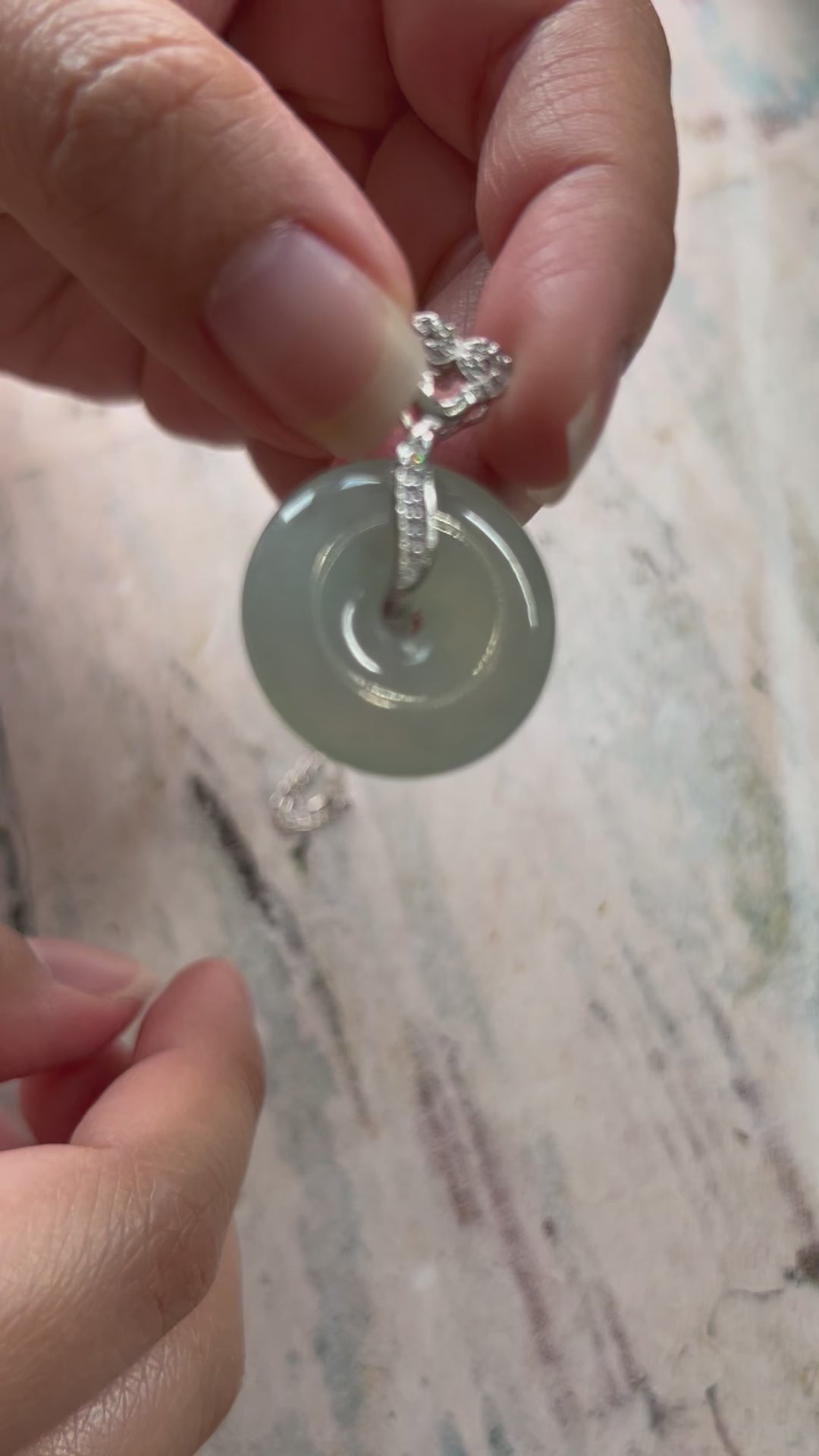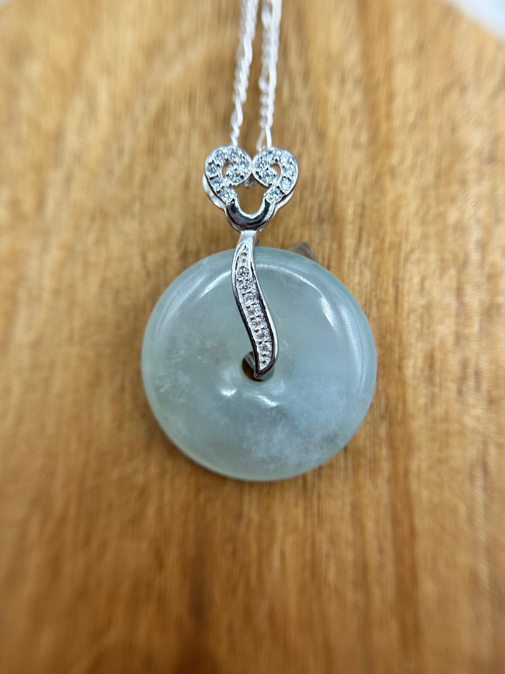Icy green donut (ping an kou) pendant. Genuine Type A jadeite. All natural non treated jade. This is a unique translucent piece of jadeite. The donut is 23.9mm in diameter and 5.69mm thick. It is an adjustable necklace.
