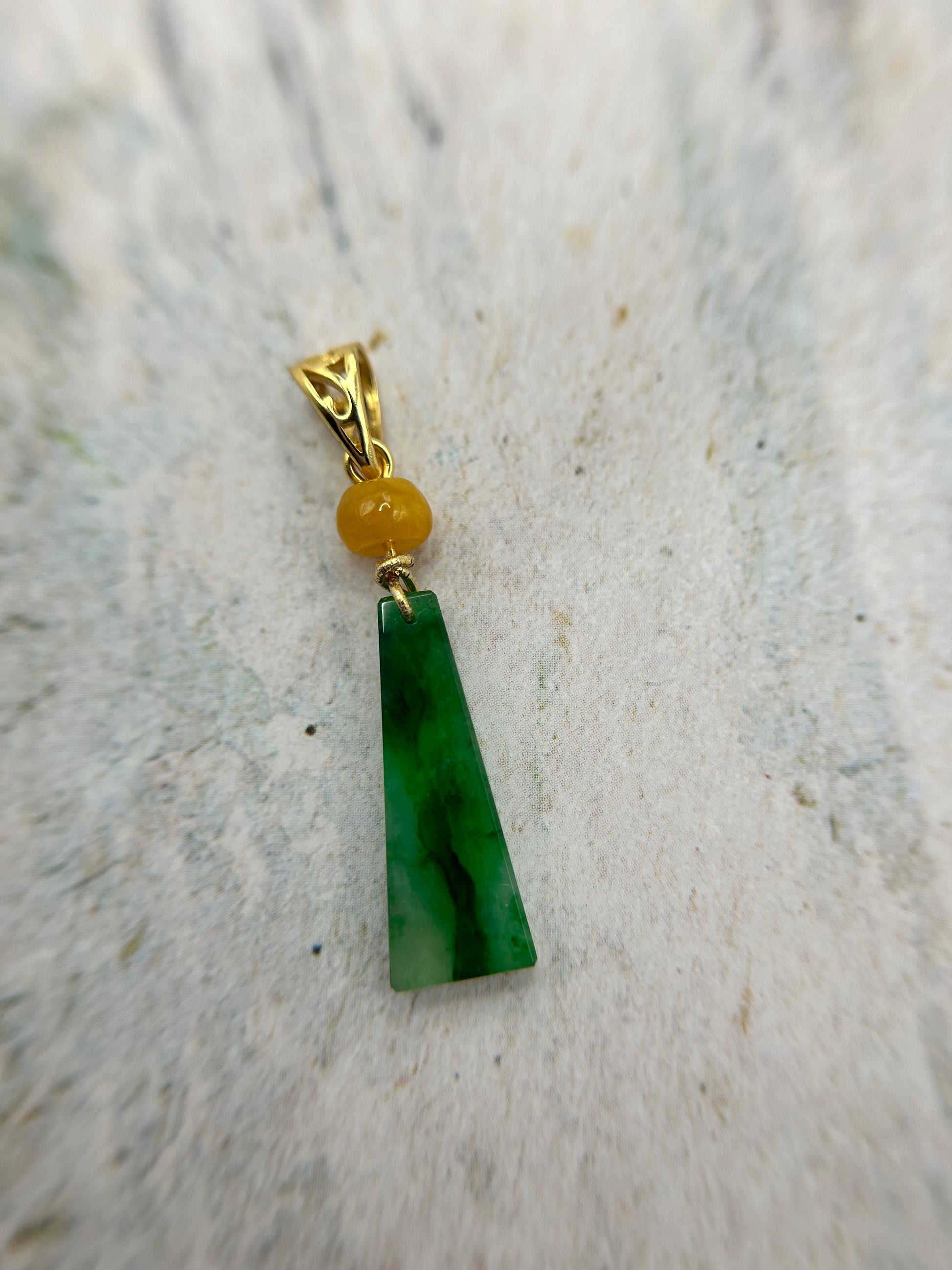 Unique icy green  trapezoid  gold plated sterling silver bail.  it grants safety, harmony, and fortune to its wearers.    Height:21.96mm, width:7.91mm, thick:2.5mm .