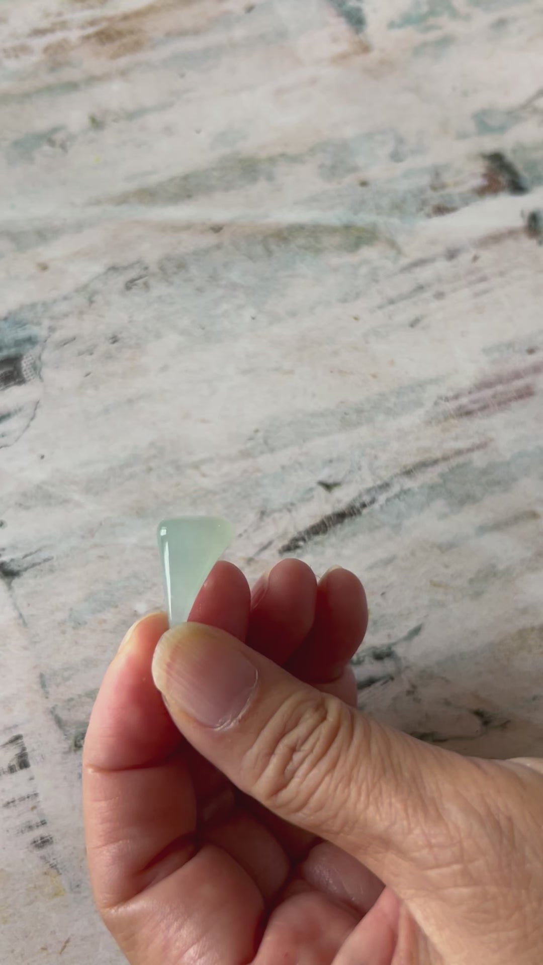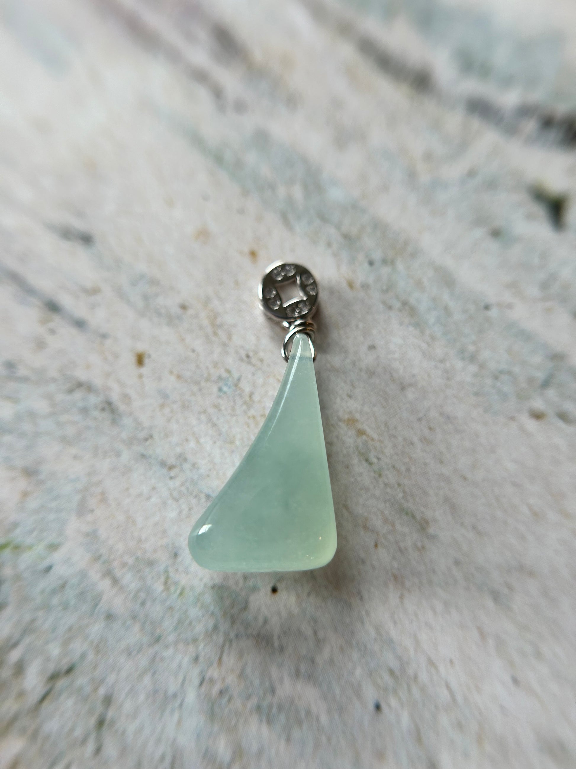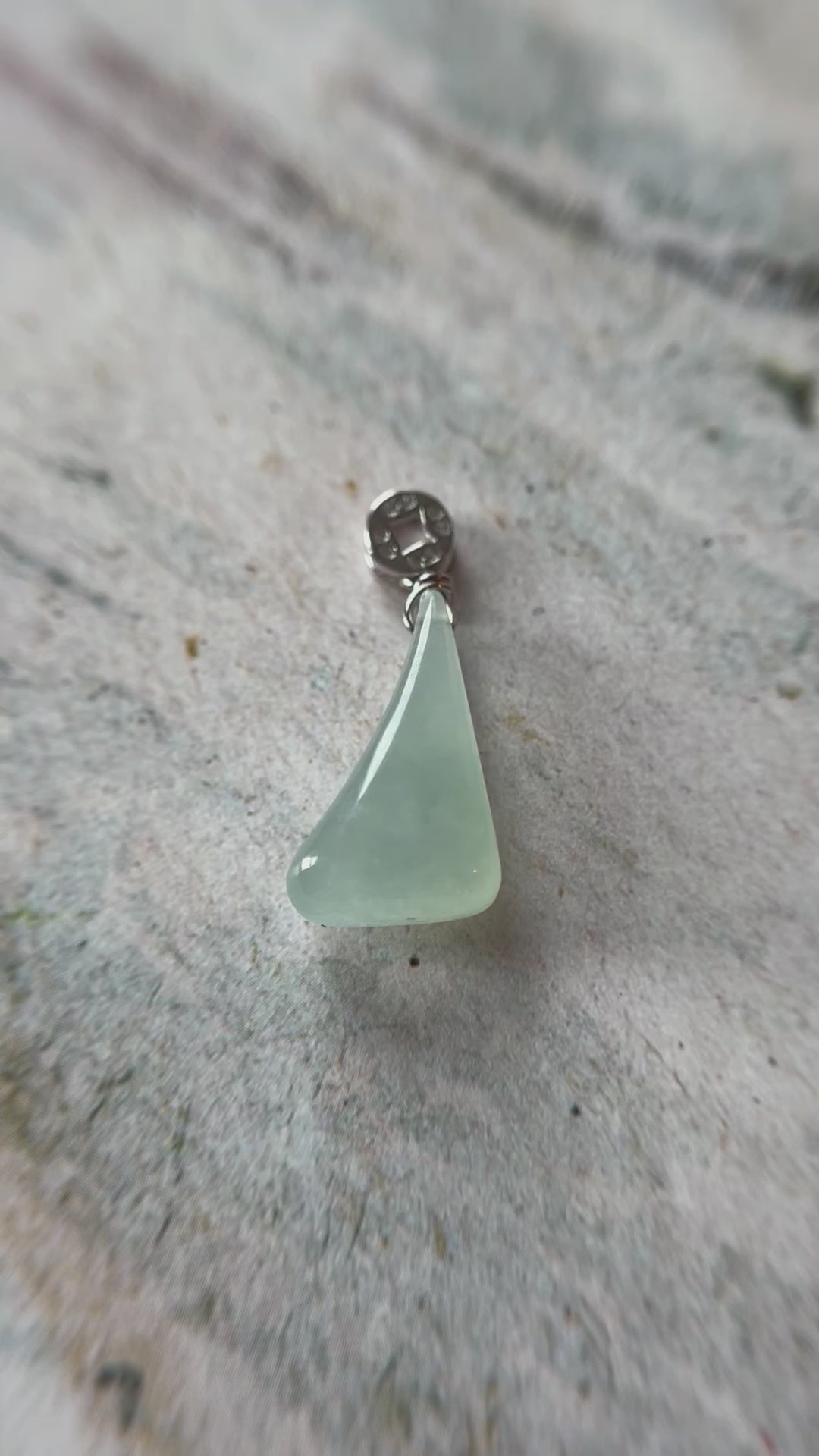 Unique icy green trapezoid sterling silver bail. it grants safety, harmony, and fortune to its wearers. Height:20.51mm, width:11.39mm, thick:2.85mm .