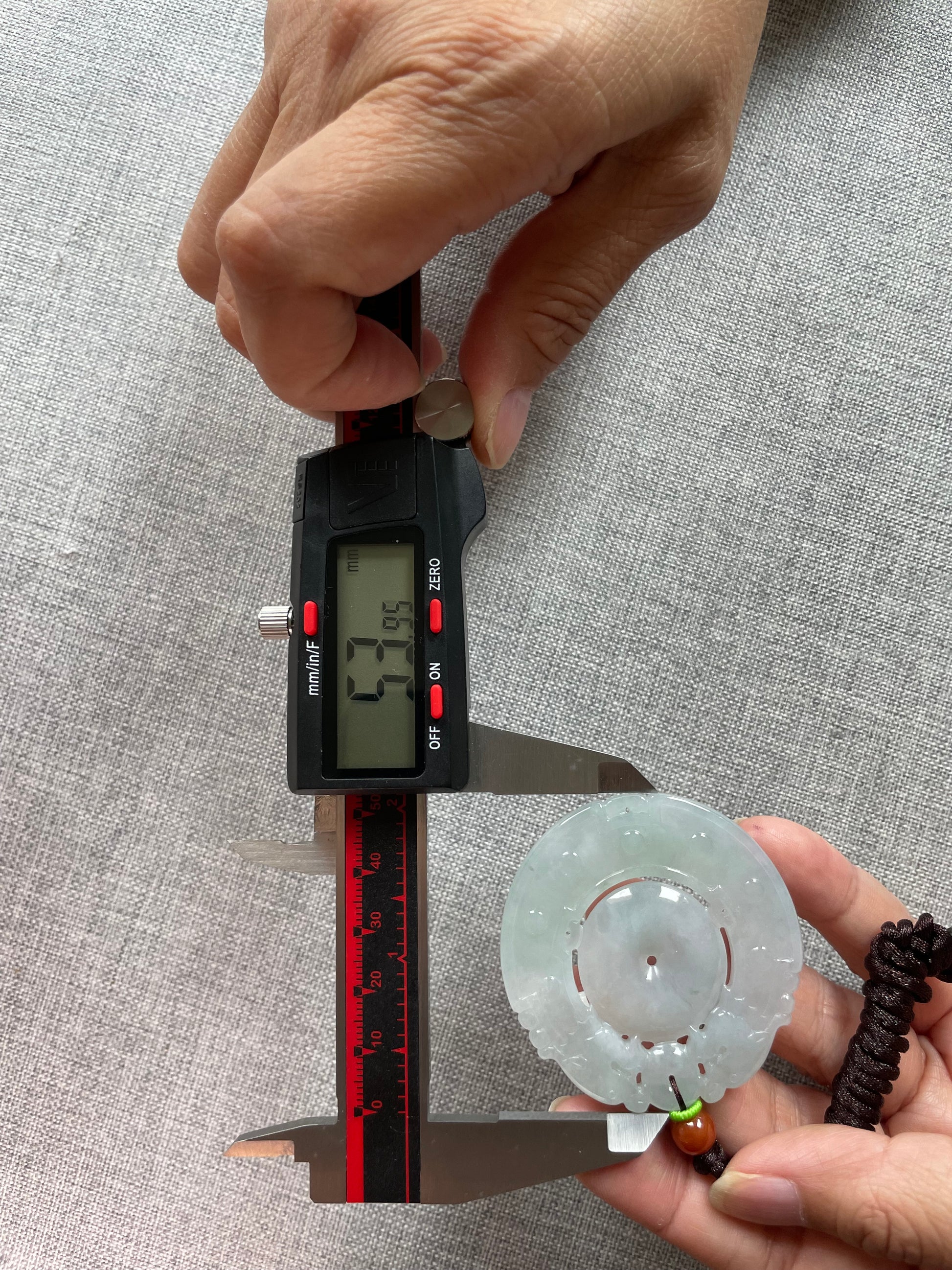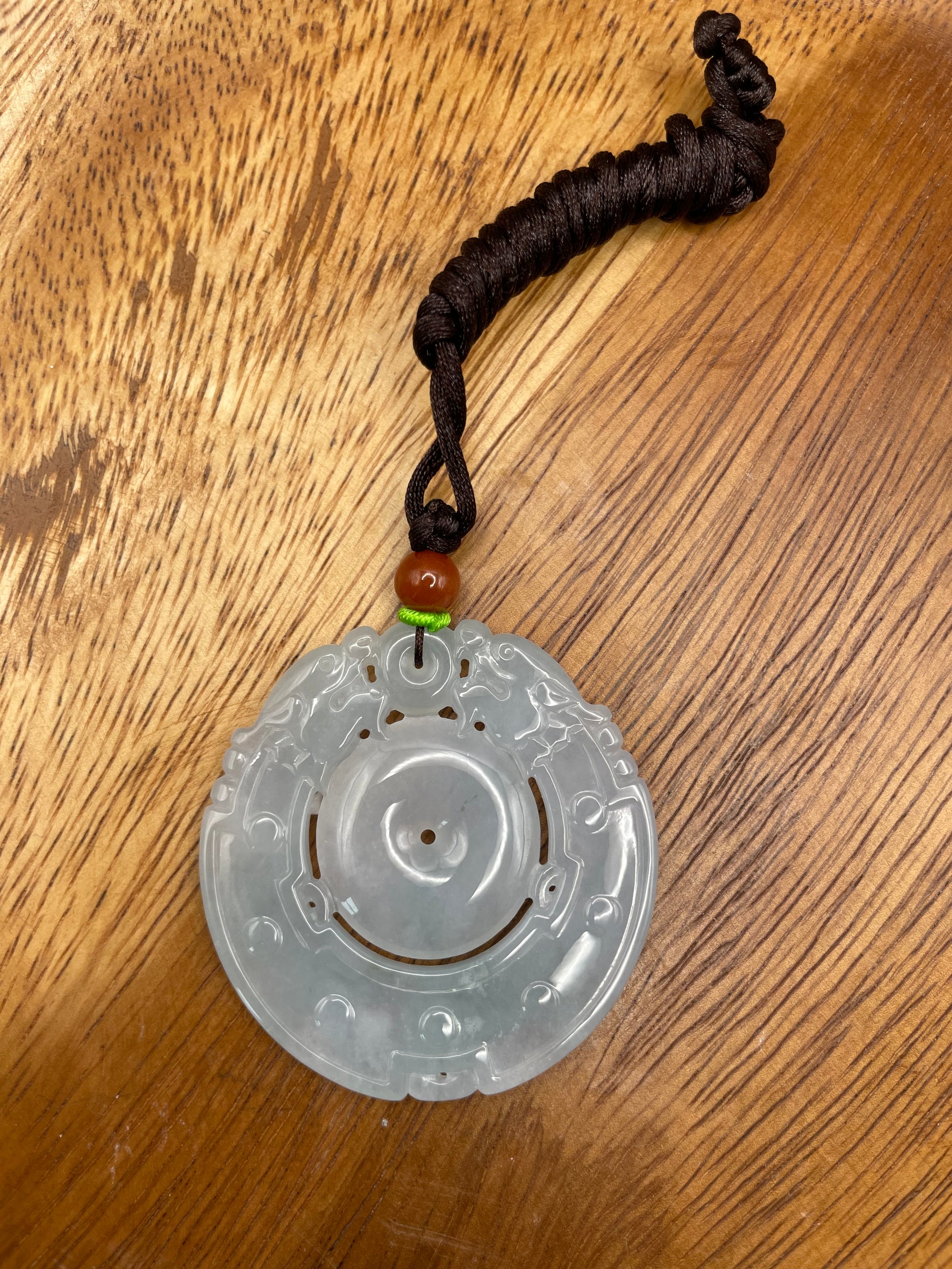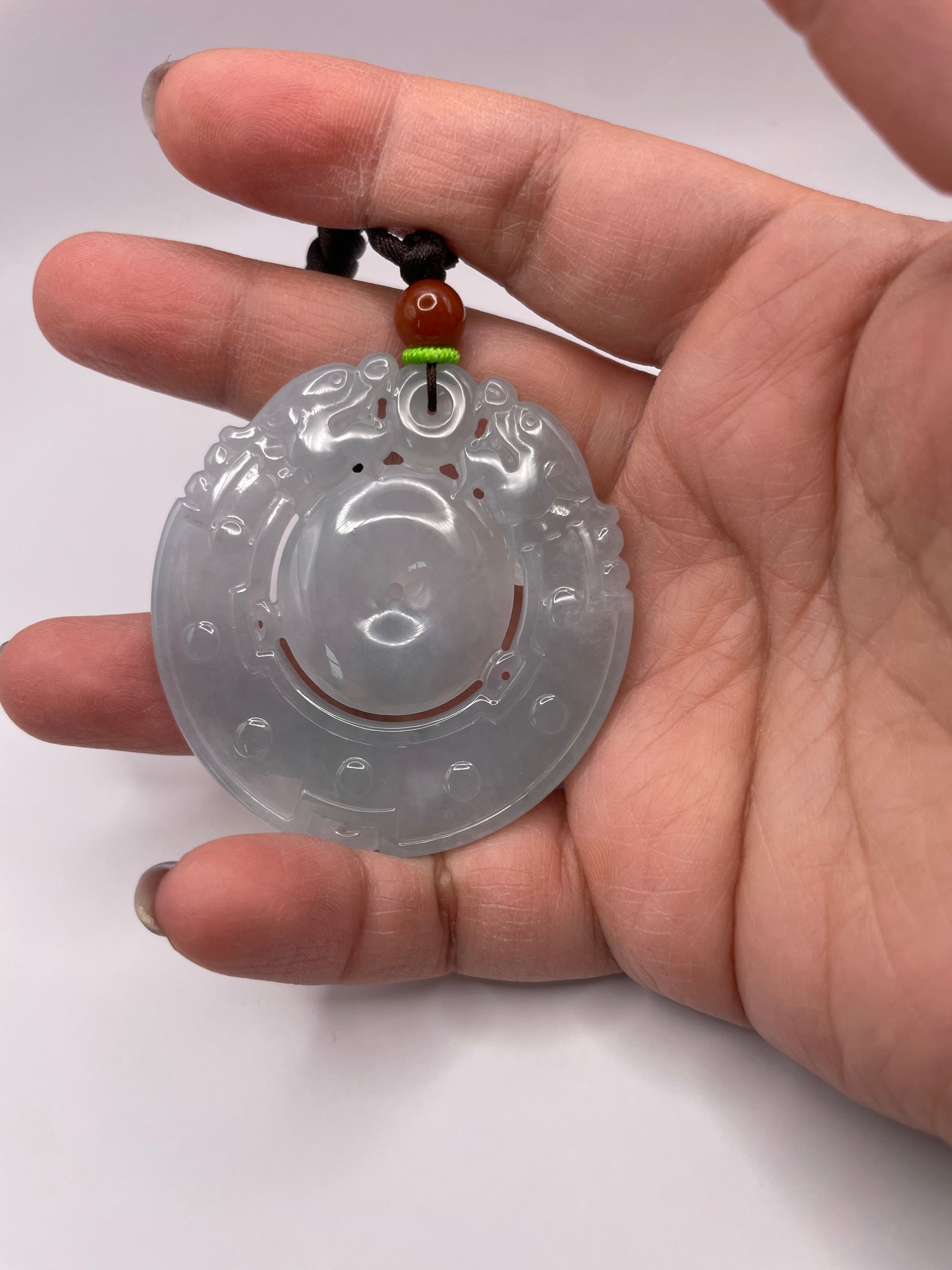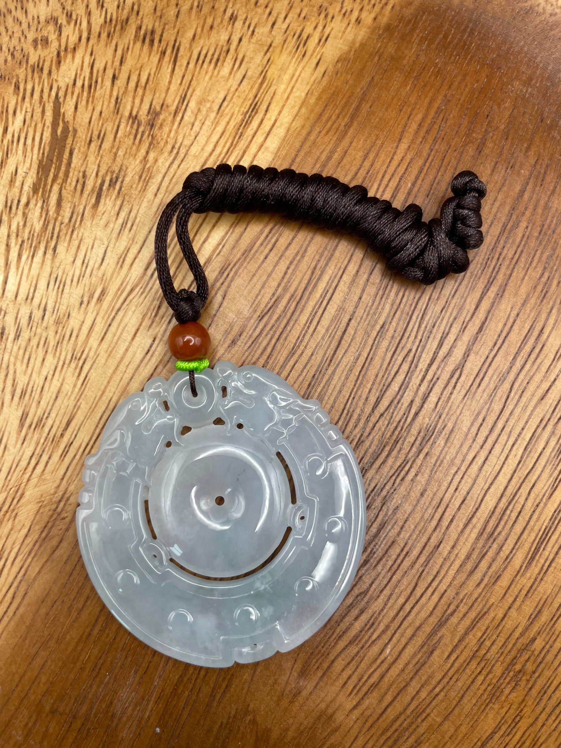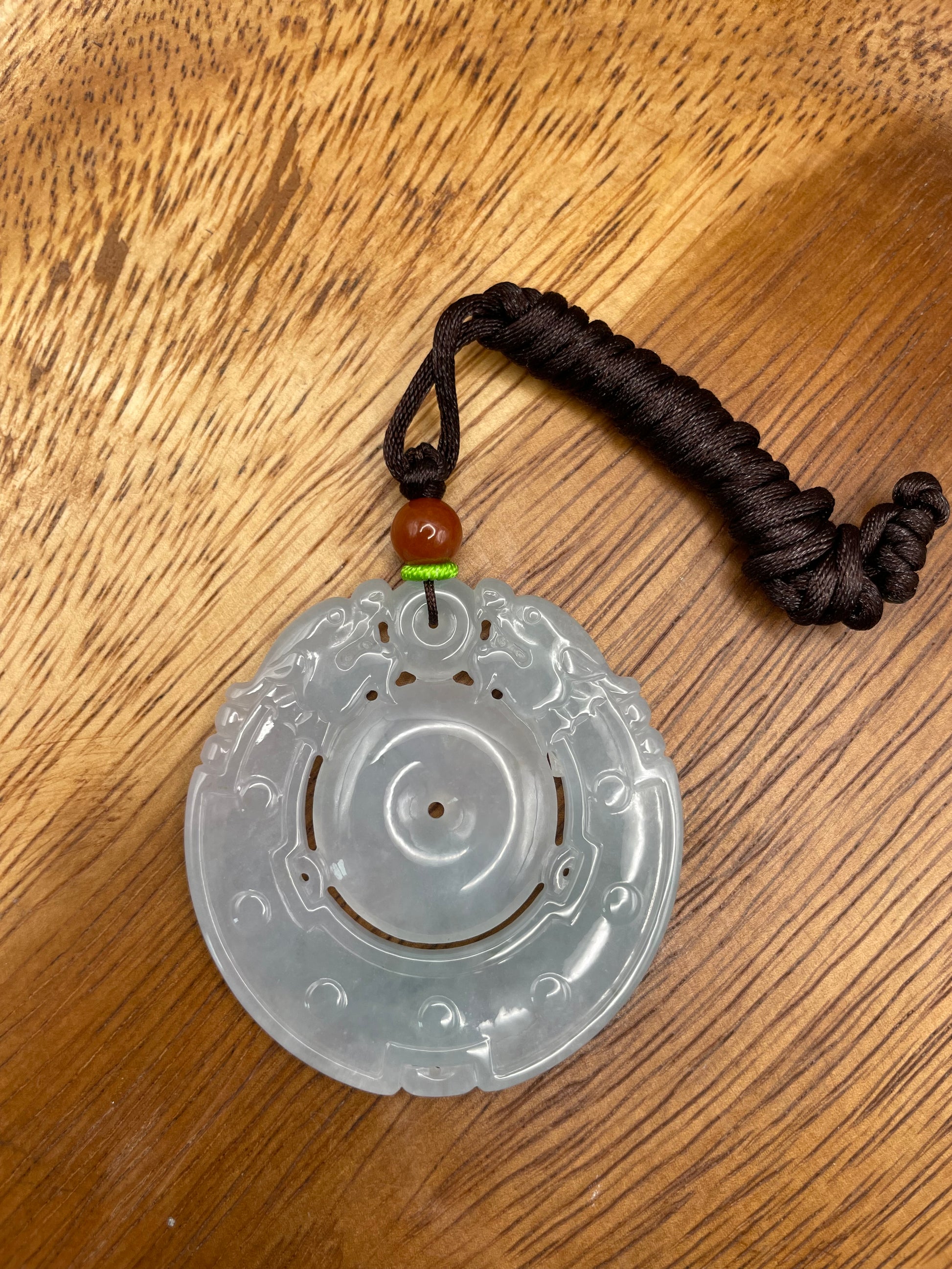 The dragon on coin pendant in Chinese signifies all is well and safety and wealth will comes for the wearer. the jadeite is Icy white and very translucent. it’s a very classic piece that can be worn casually and can be dress up. the piece is 53.95mm in diameter , 4.29mm thick .