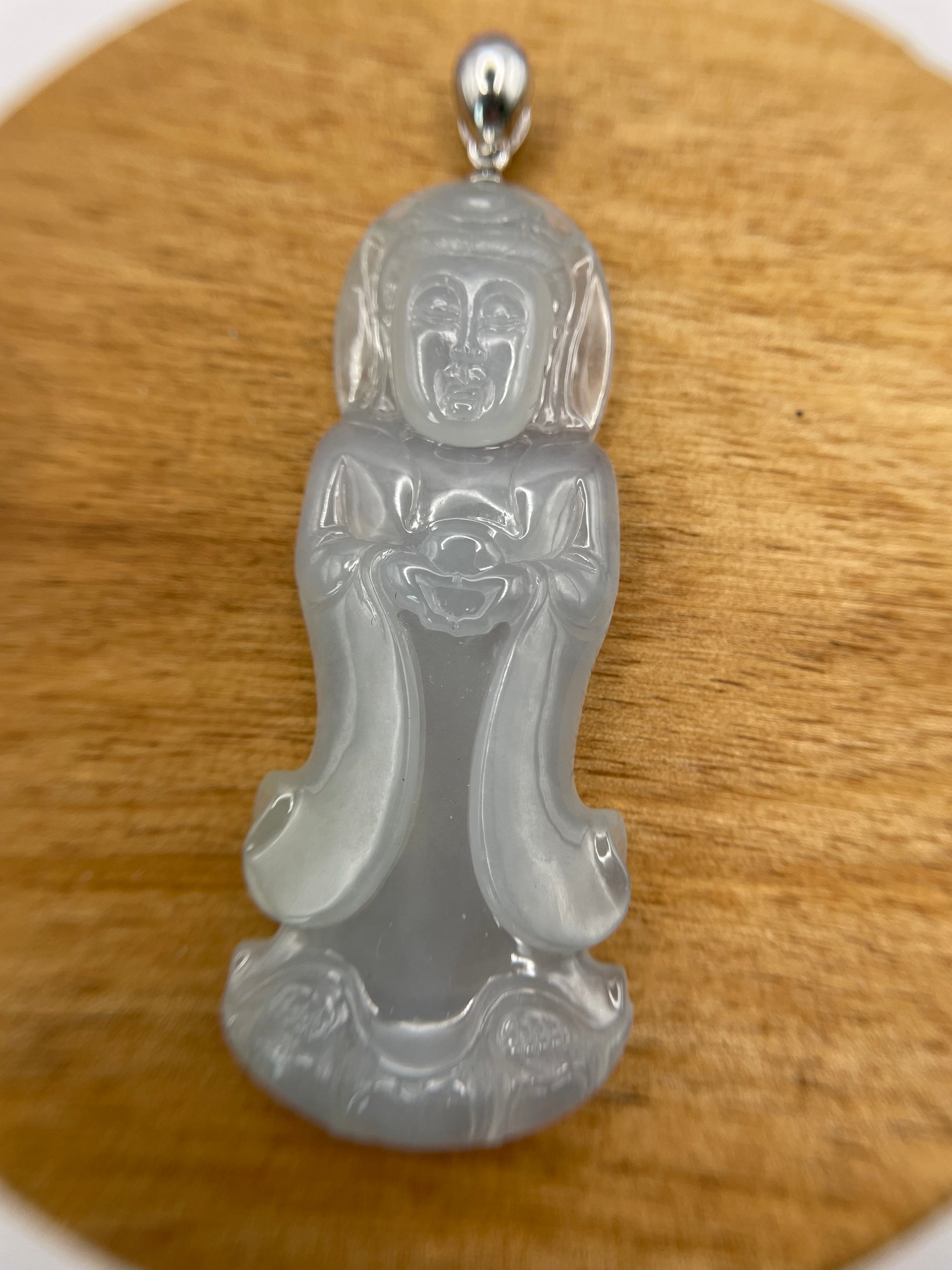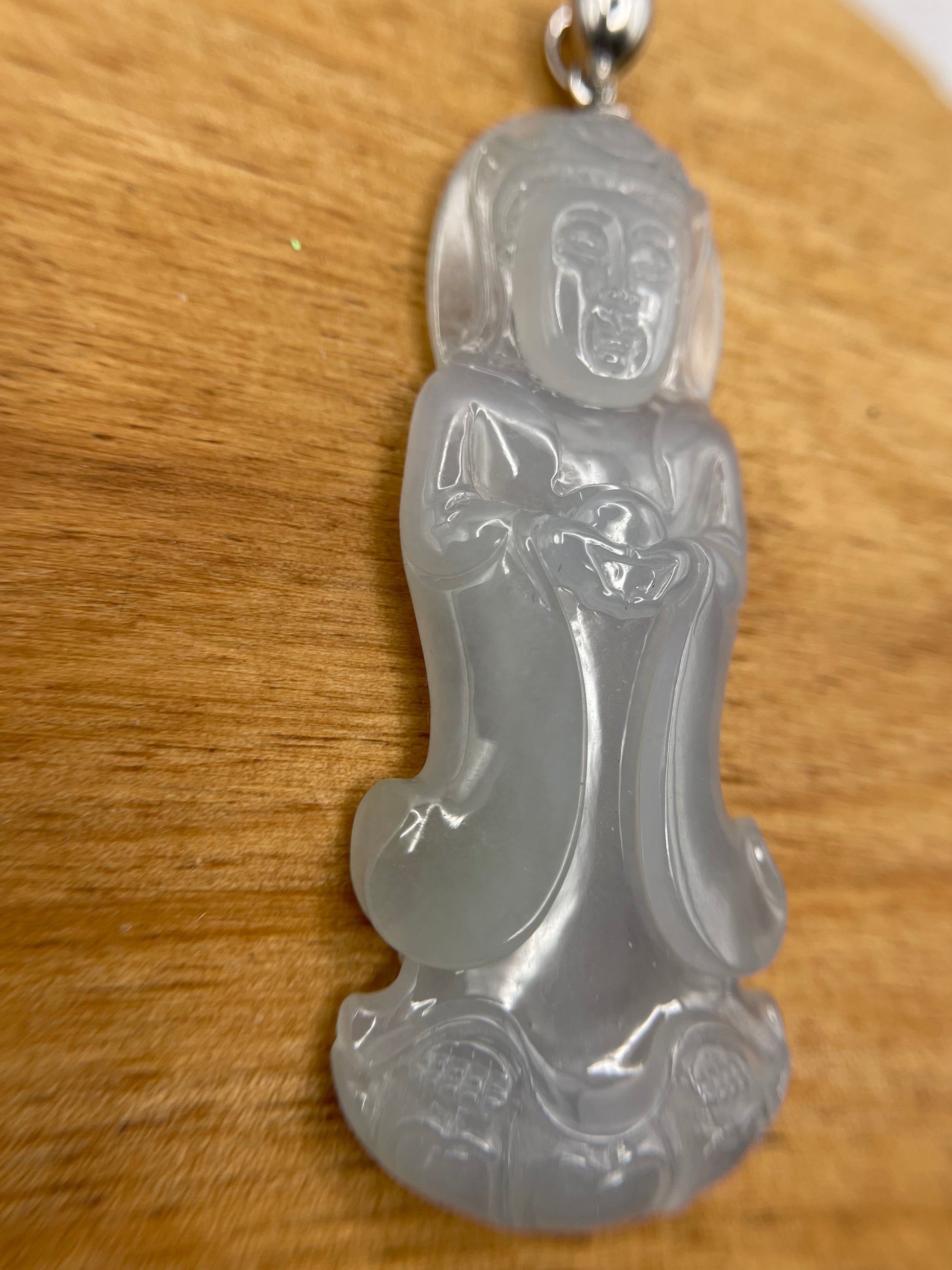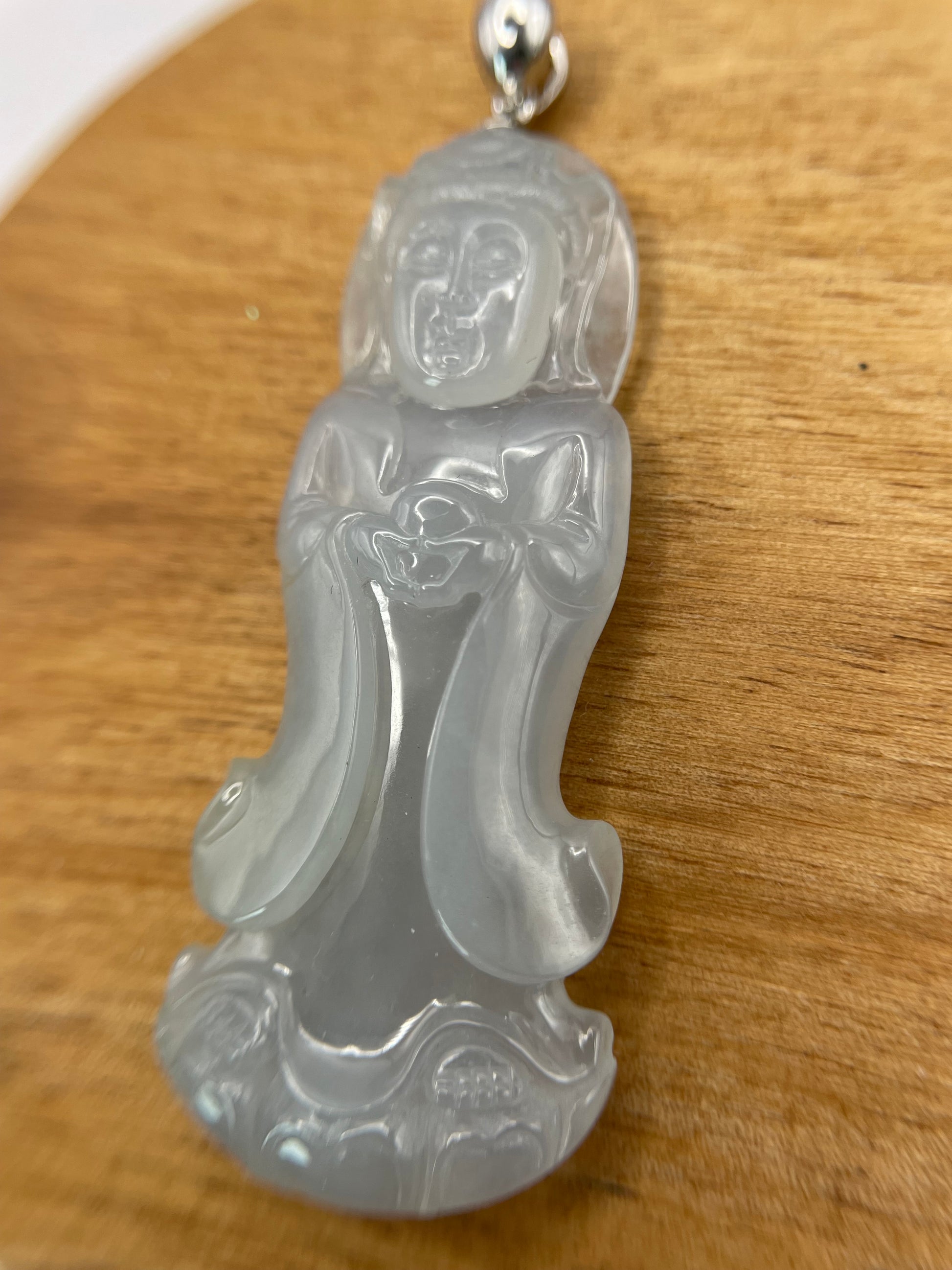 Grade A Natural Icy White Burma Jadeite Guanyin pendant with 18K white gold bail