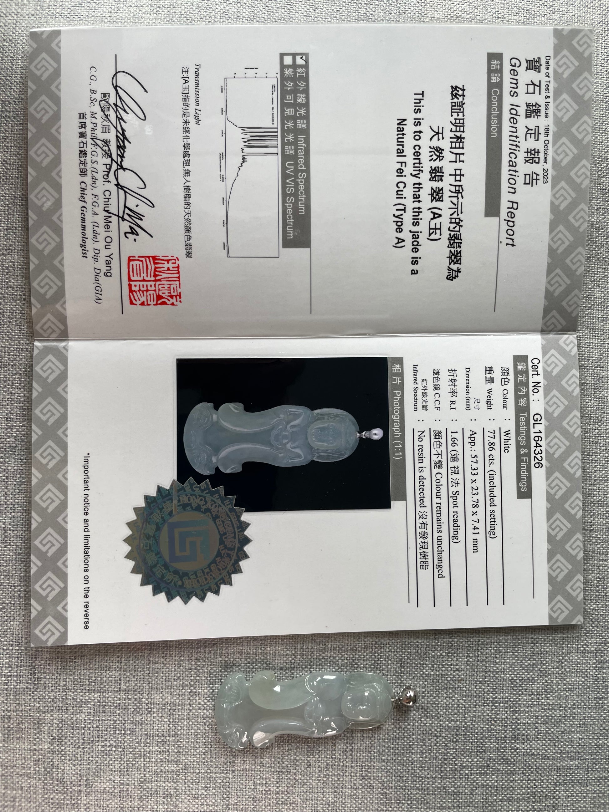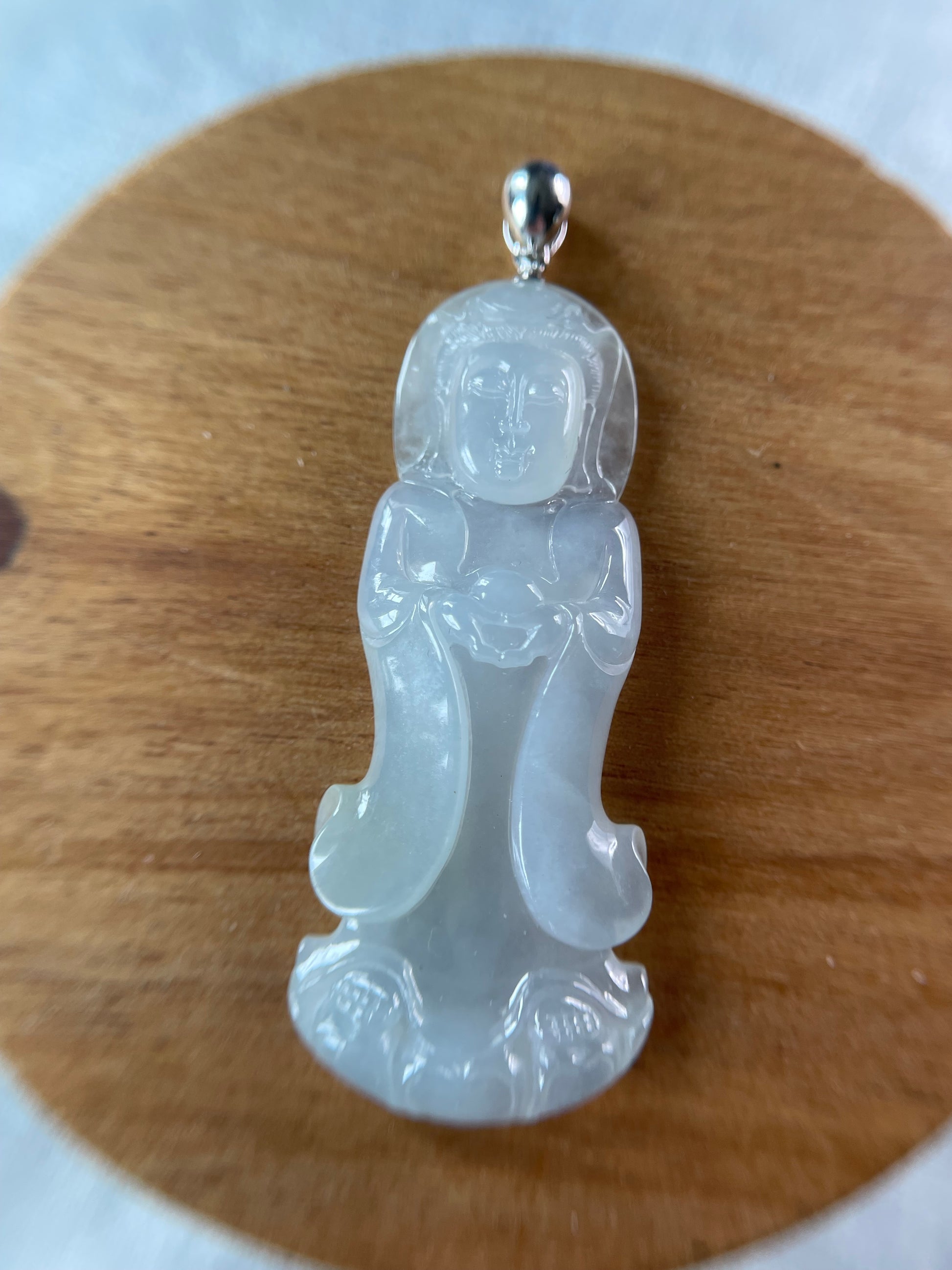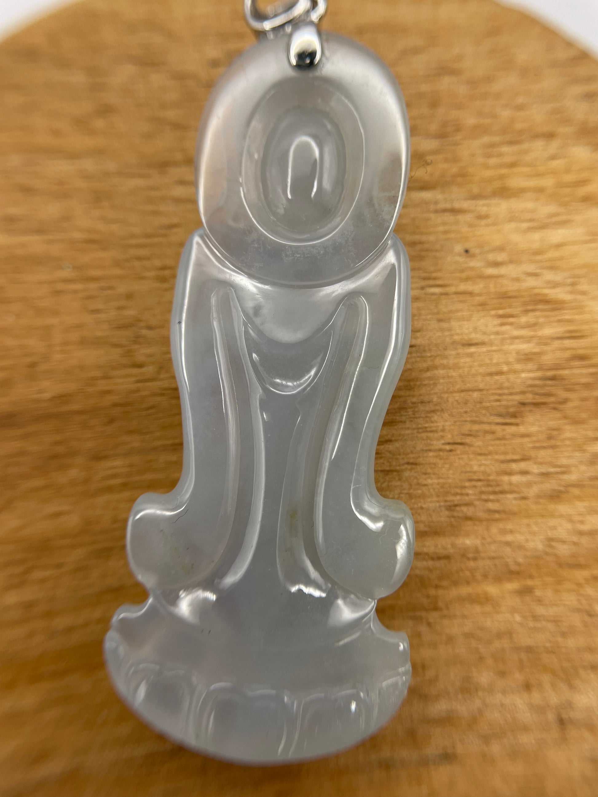 Grade A Natural Icy White Burma Jadeite Guanyin pendant with 18K white gold bail
