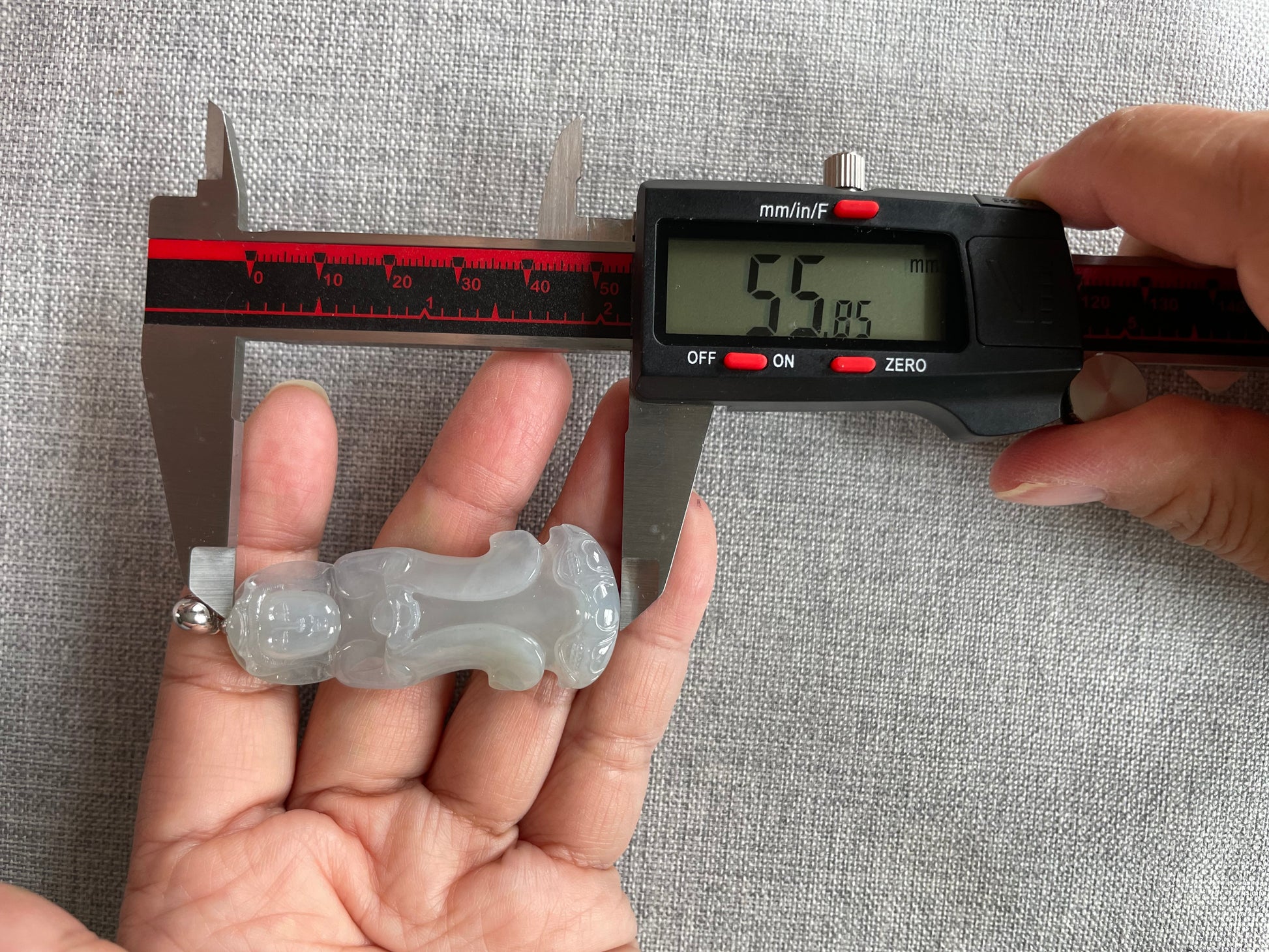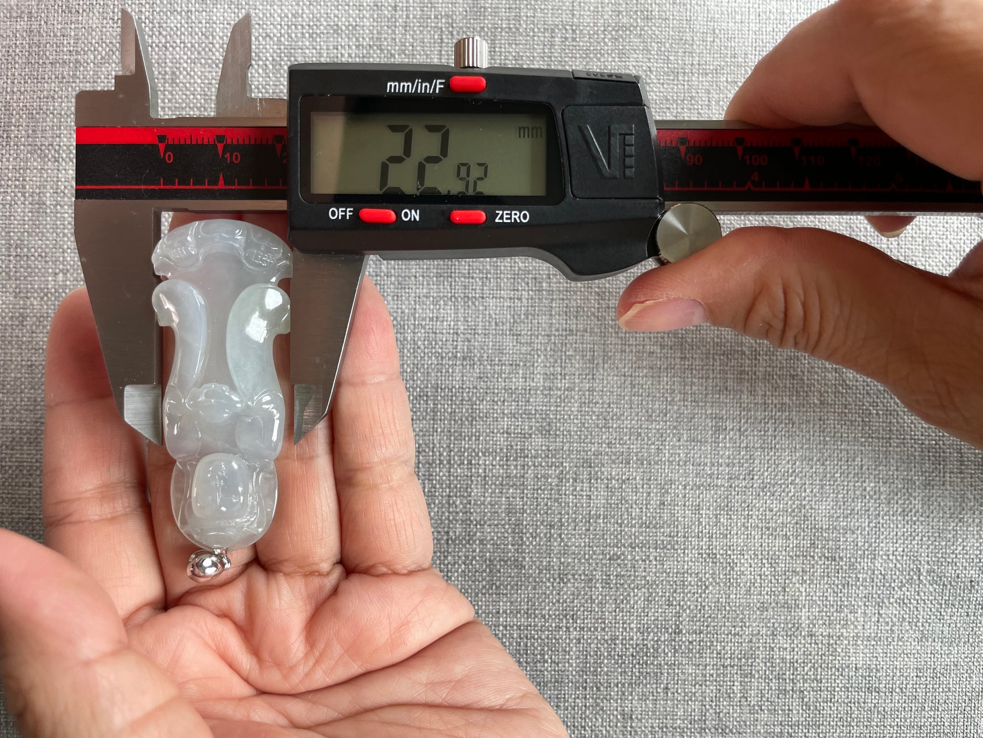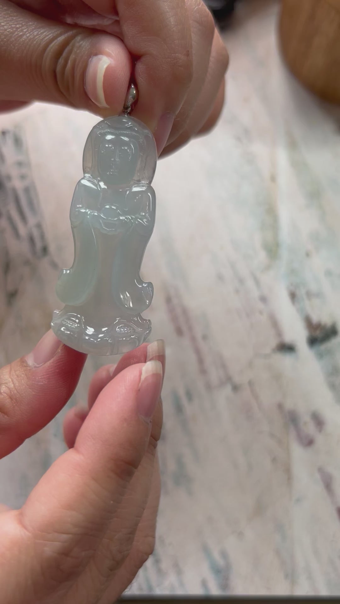 This translucent Icy Jadeite is carved on both sides with details such as the vase and necks lace that the Guanyin is wearing. The Guanyin face is serene and bring peace to its wearer.