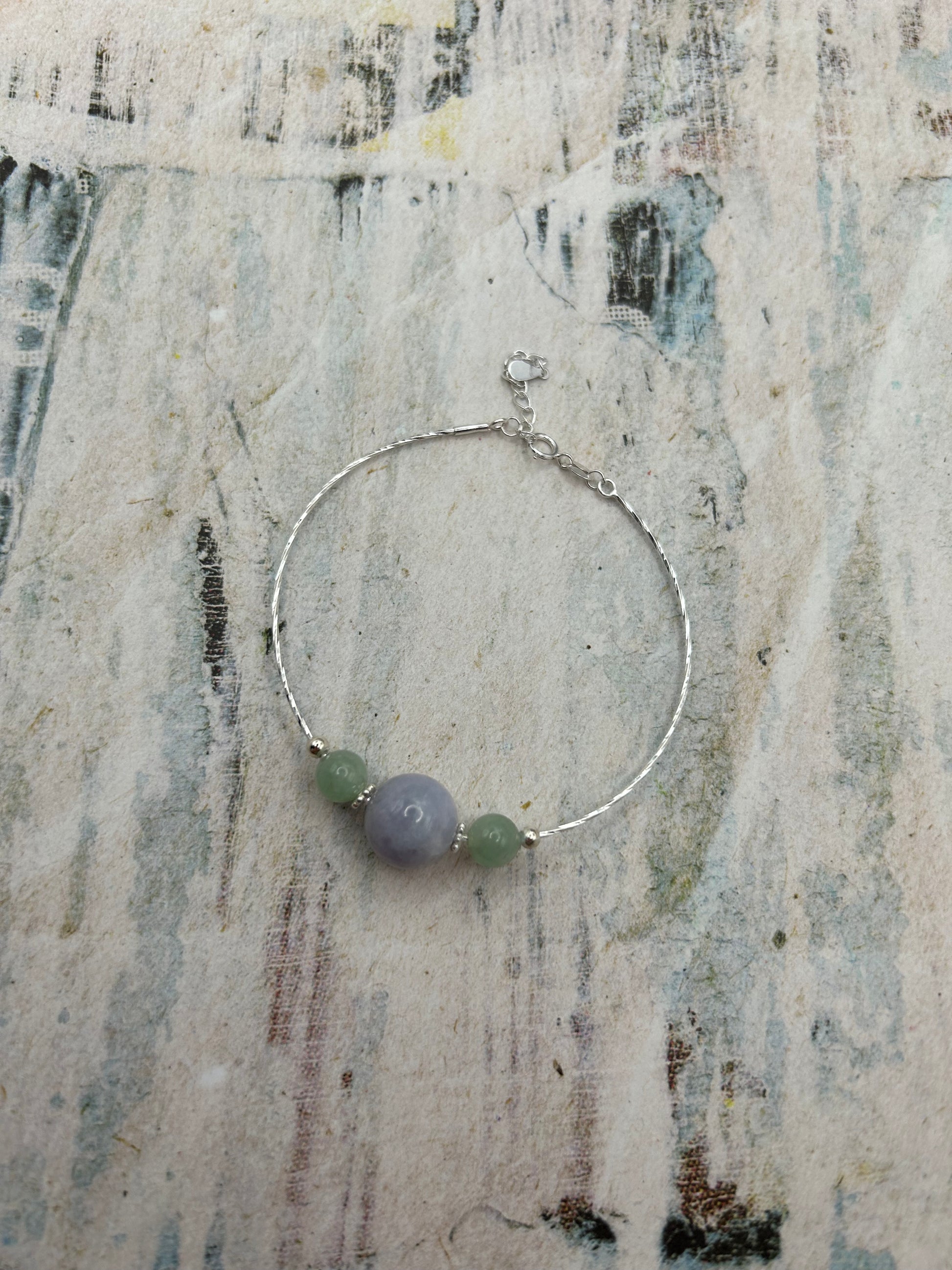 Grade A Natural Lavender and Green Burmese Jadeite beads on a sterling silver bracelet