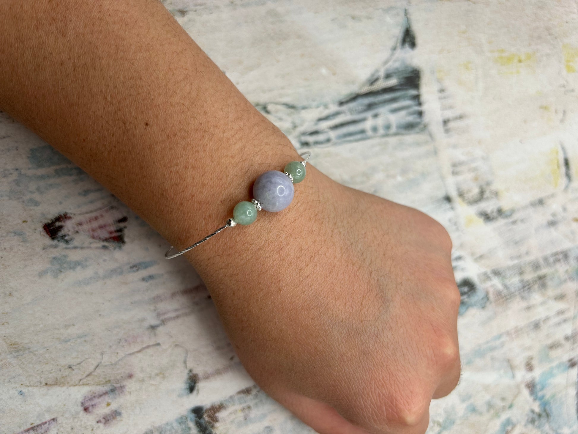 The Jadeite is Lavender and Green . This two tone jadeite is translucent and one of a kind. This can be easily dress up or down. . The sterling silver bracelet is 21cm.
