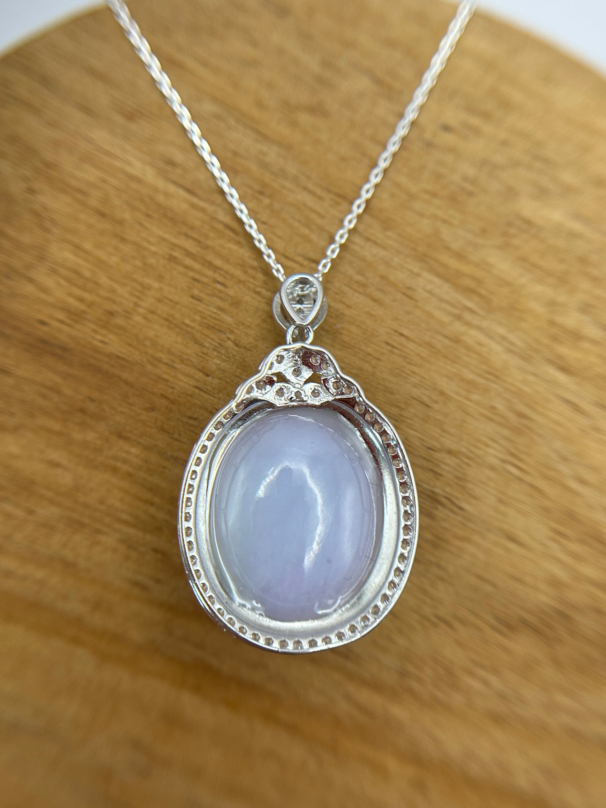 Grade A Natural Lavender Burma Jadeite Cabochon pendant With Cubic Zirconia Silver necklace