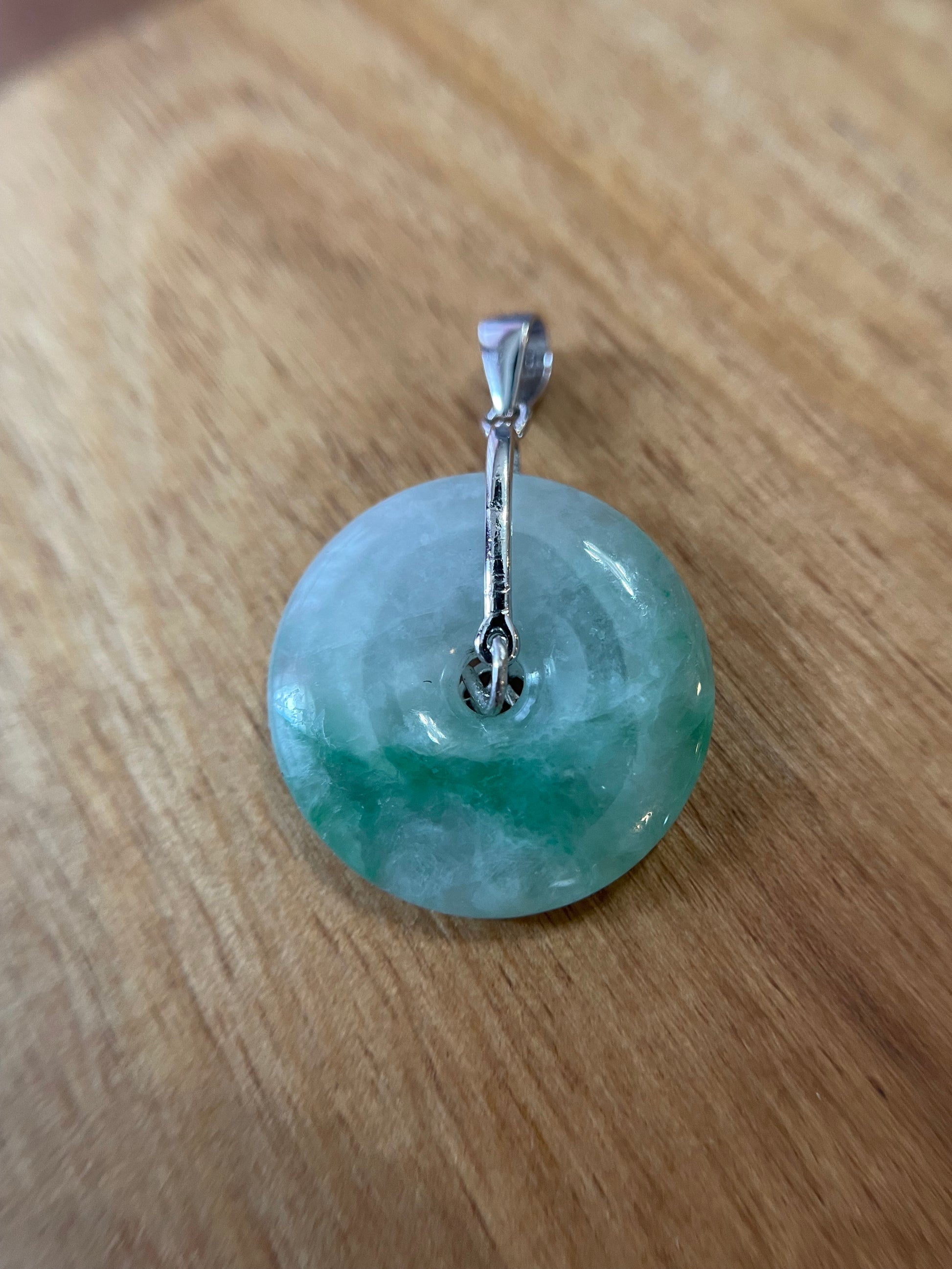 Grade A Natural Green Jadeite Pi Disc ( peng on kou, donut) pendant with sterling silver four leaves clover bail