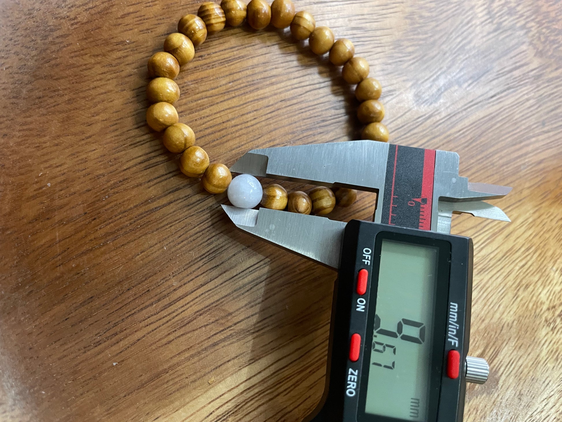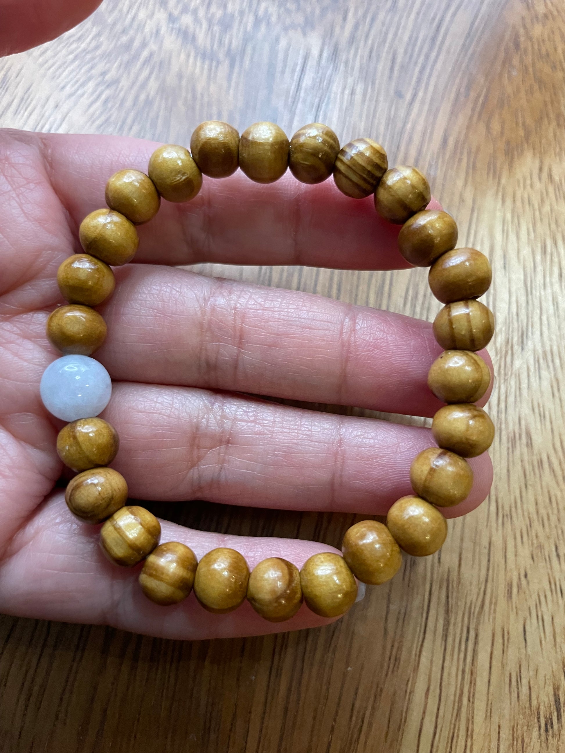 White jadeite bead with wood bead bracelet. The white jadeite bead is 9.67mm in diameter. The length of the bracelet is 7inches.