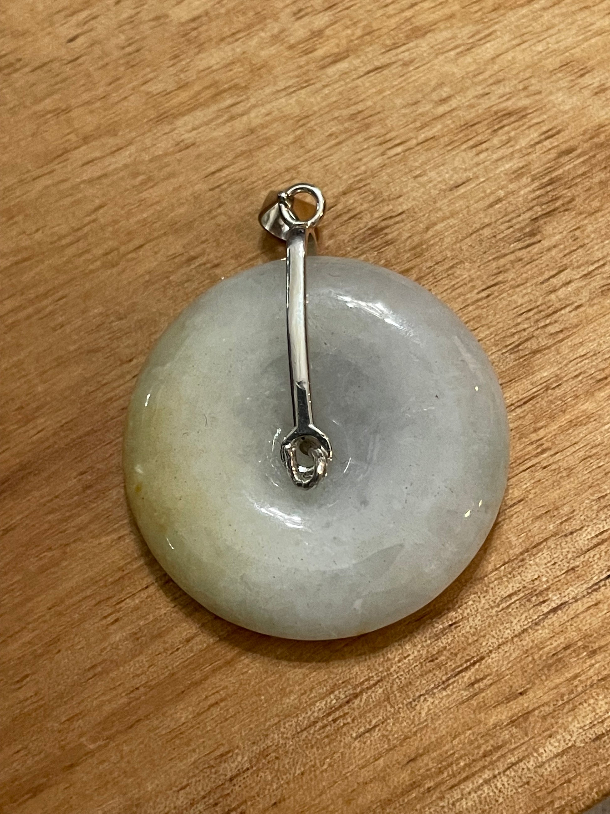 Yellow donut (ping an kou) pendant. Genuine Type A jadeite. All natural non treated jade. This is a unique translucent piece of jadeite. The donut is 19.77mm in diameter and 7.73mm thick. It is a silver necklace.