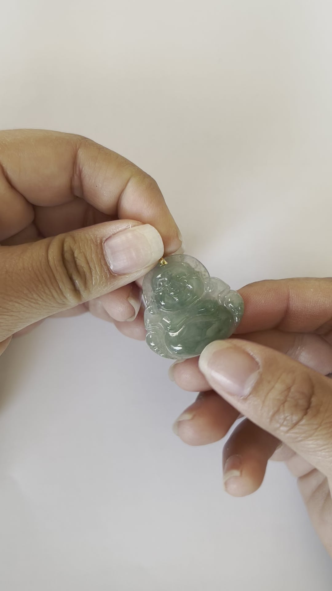 Icy green jadeite Buddha pendant with 18k yellow gold bail