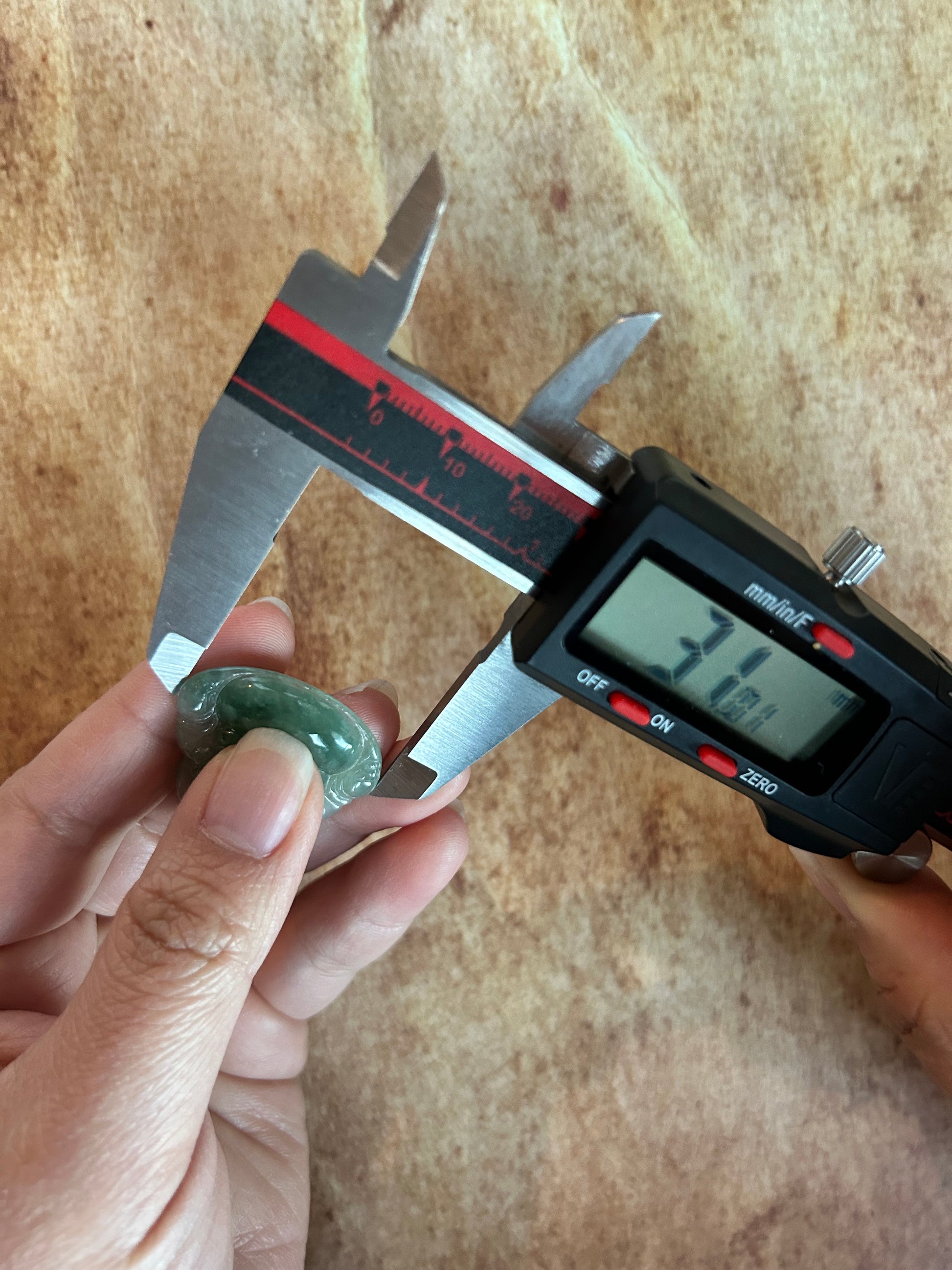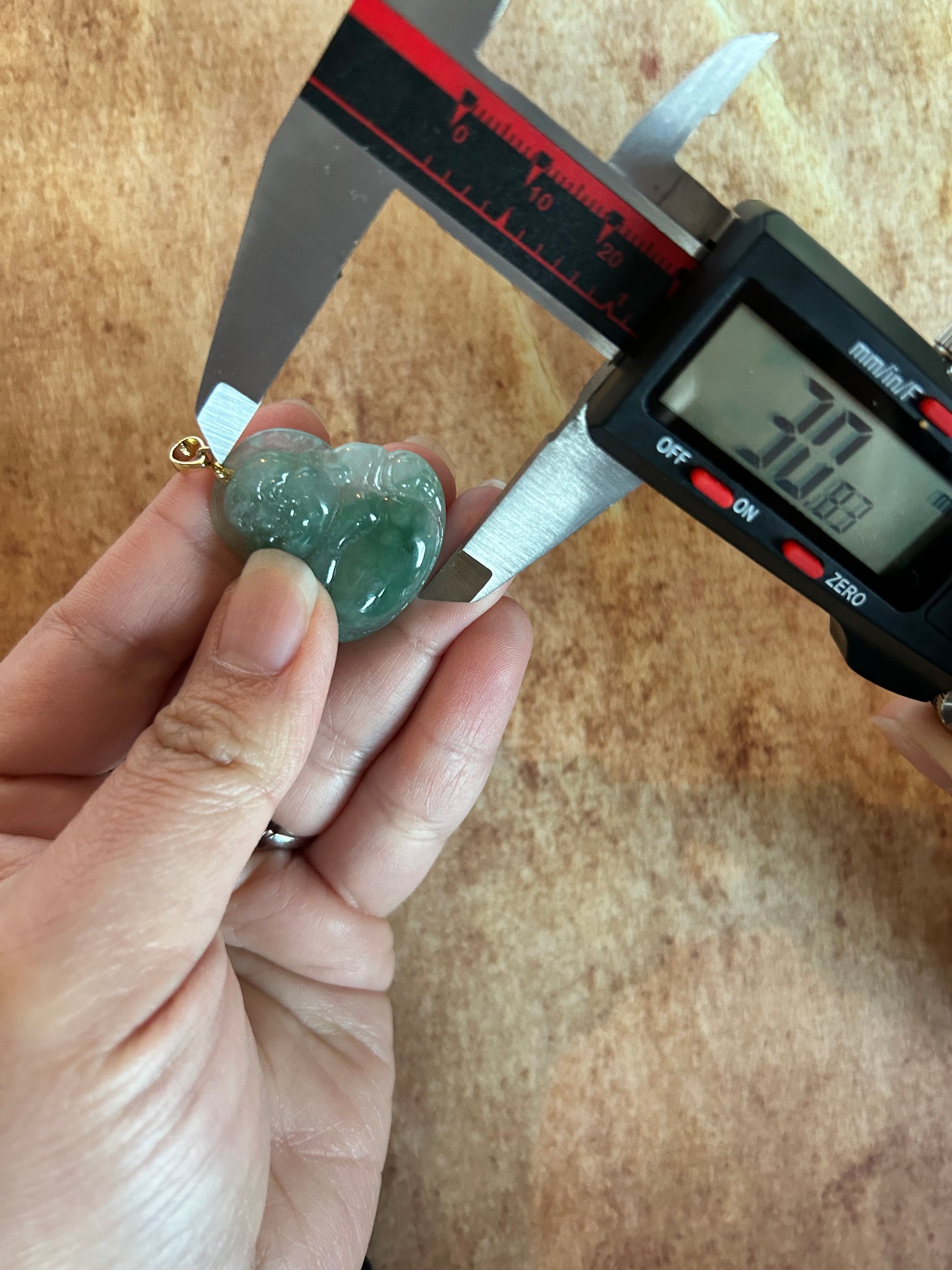 The jadeite pendant is an icy green buddha, and very translucent. it’s a very classic piece that can be worn casually and can be dress up. the piece is 30.83mm in height, 31.01mm in width and 5.84mm thick.