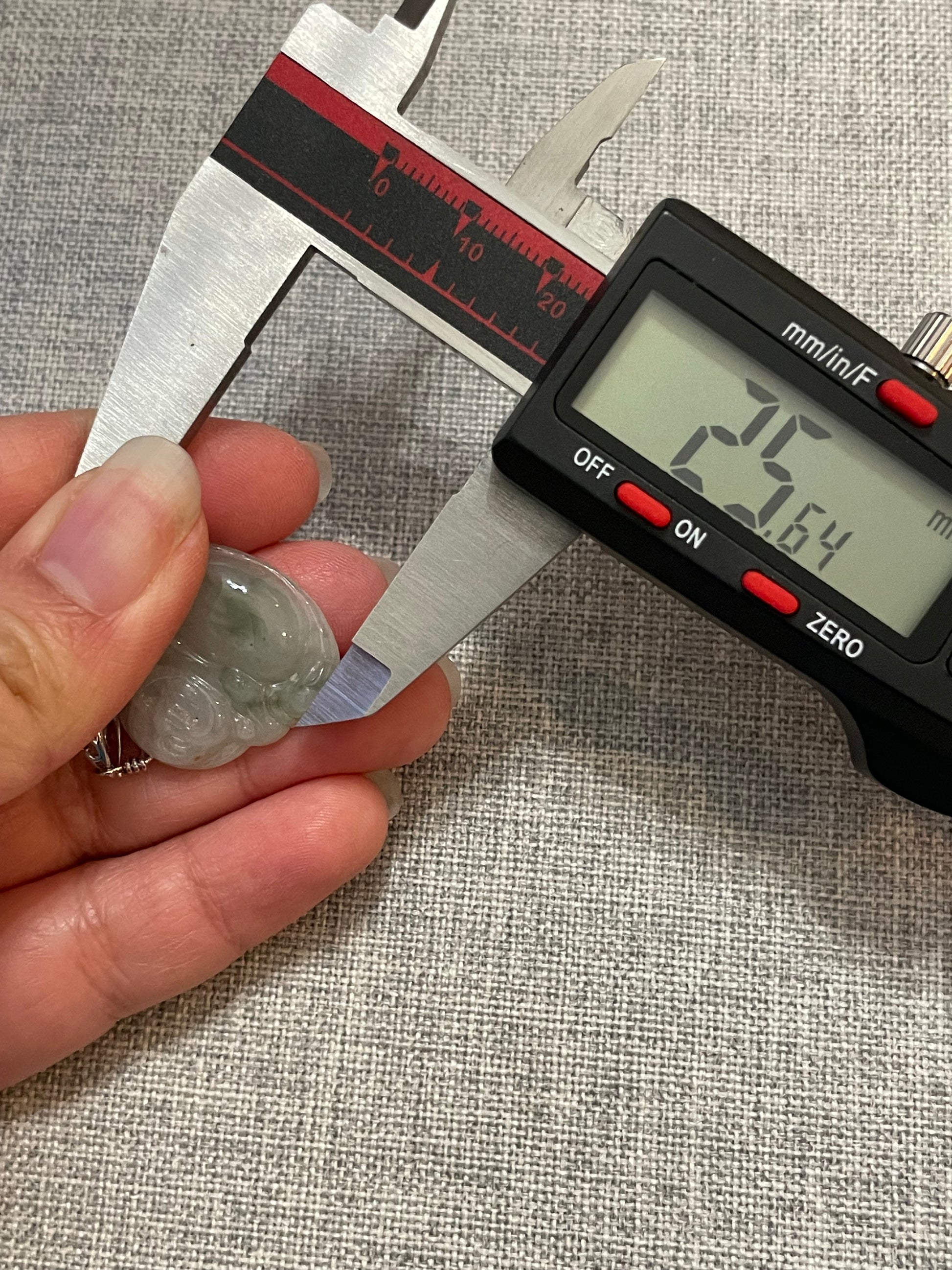 The jadeite pendant is an icy green buddha, it’s a very classic piece that can be worn casually and can be dress up. the piece is 25.28mm in height, 25.64mm in width and 5.82mm thick.