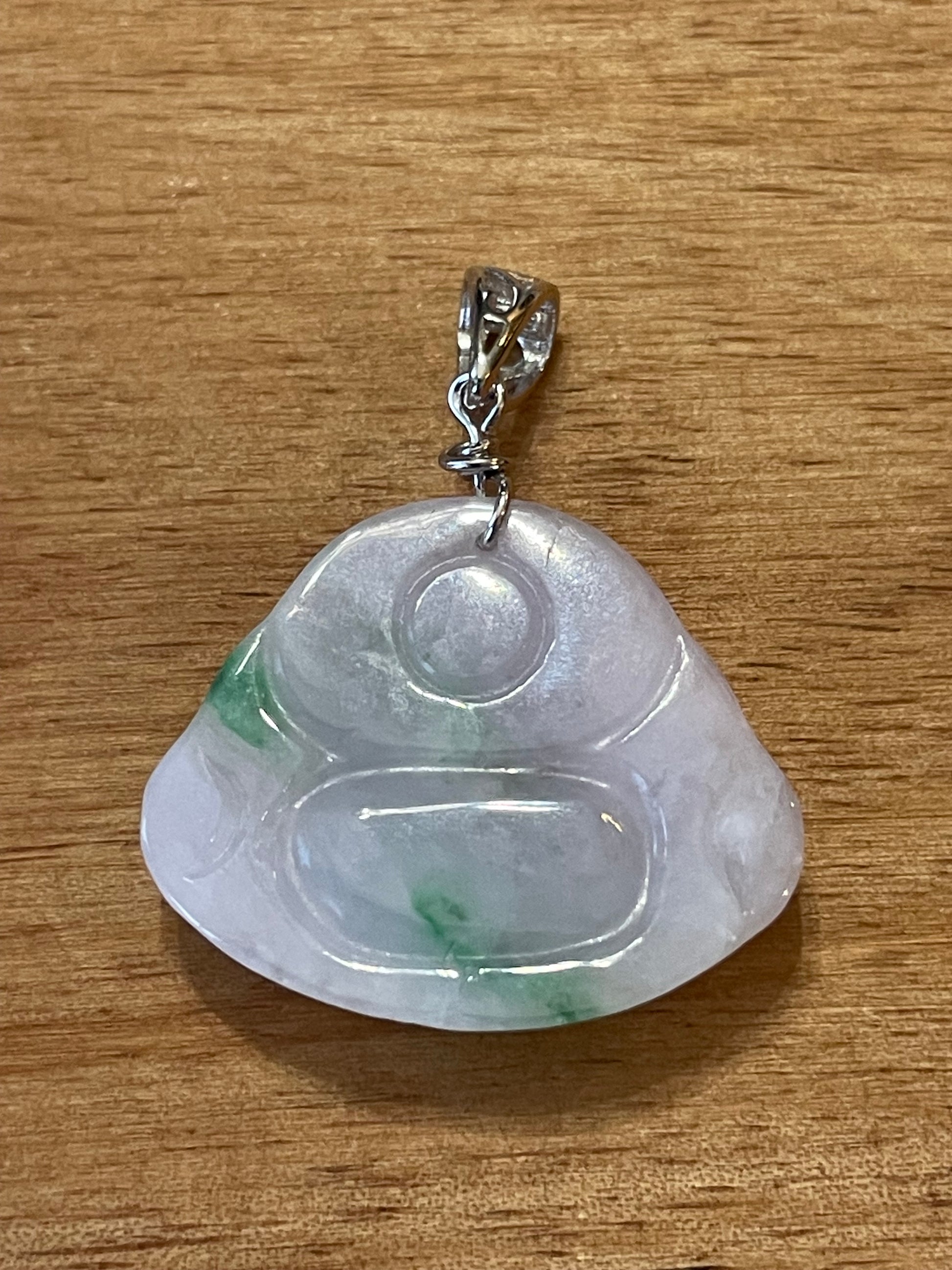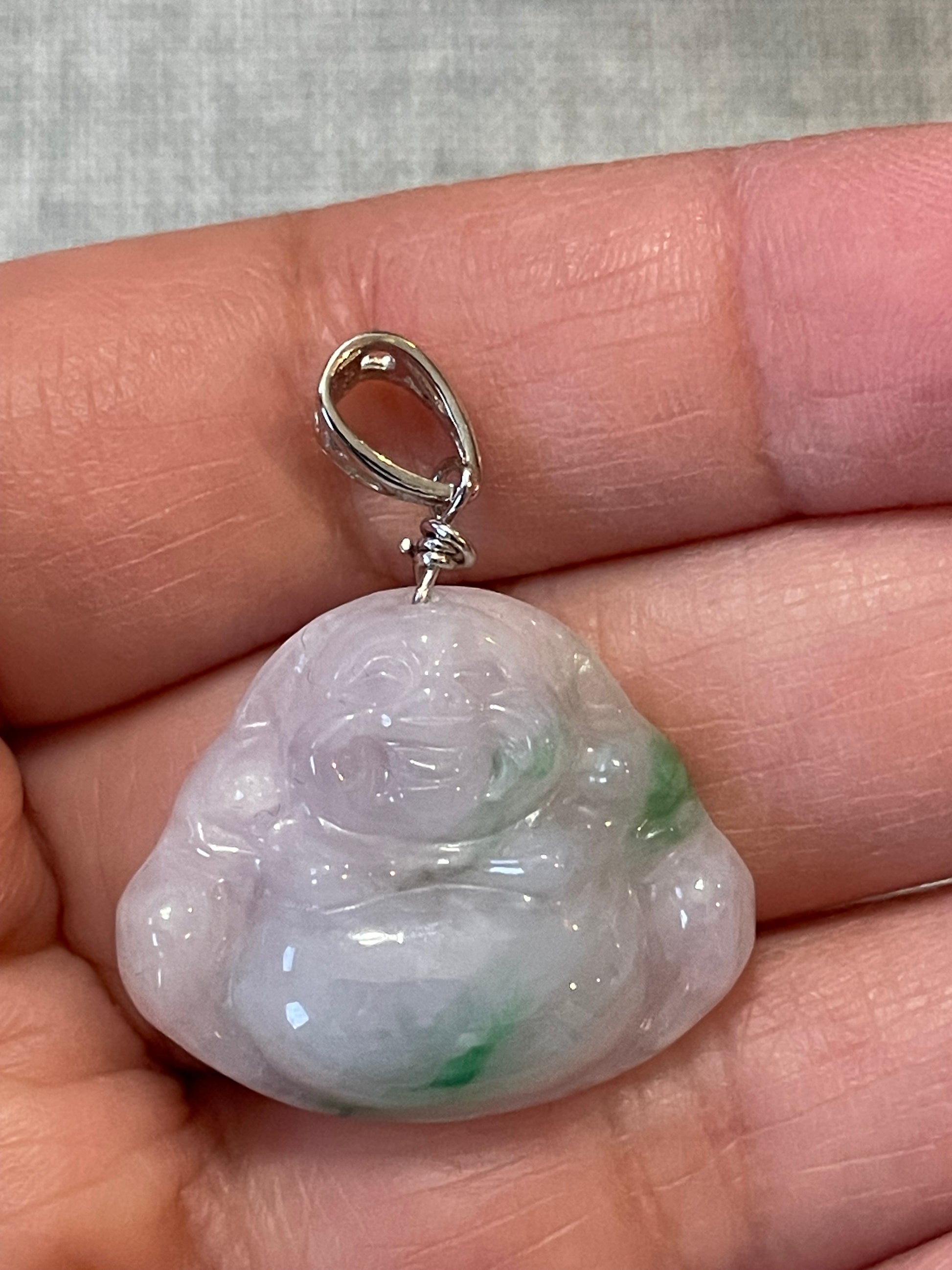 Icy Lavender and Green jadeite Buddha pendant with Sterling silver bail necklace