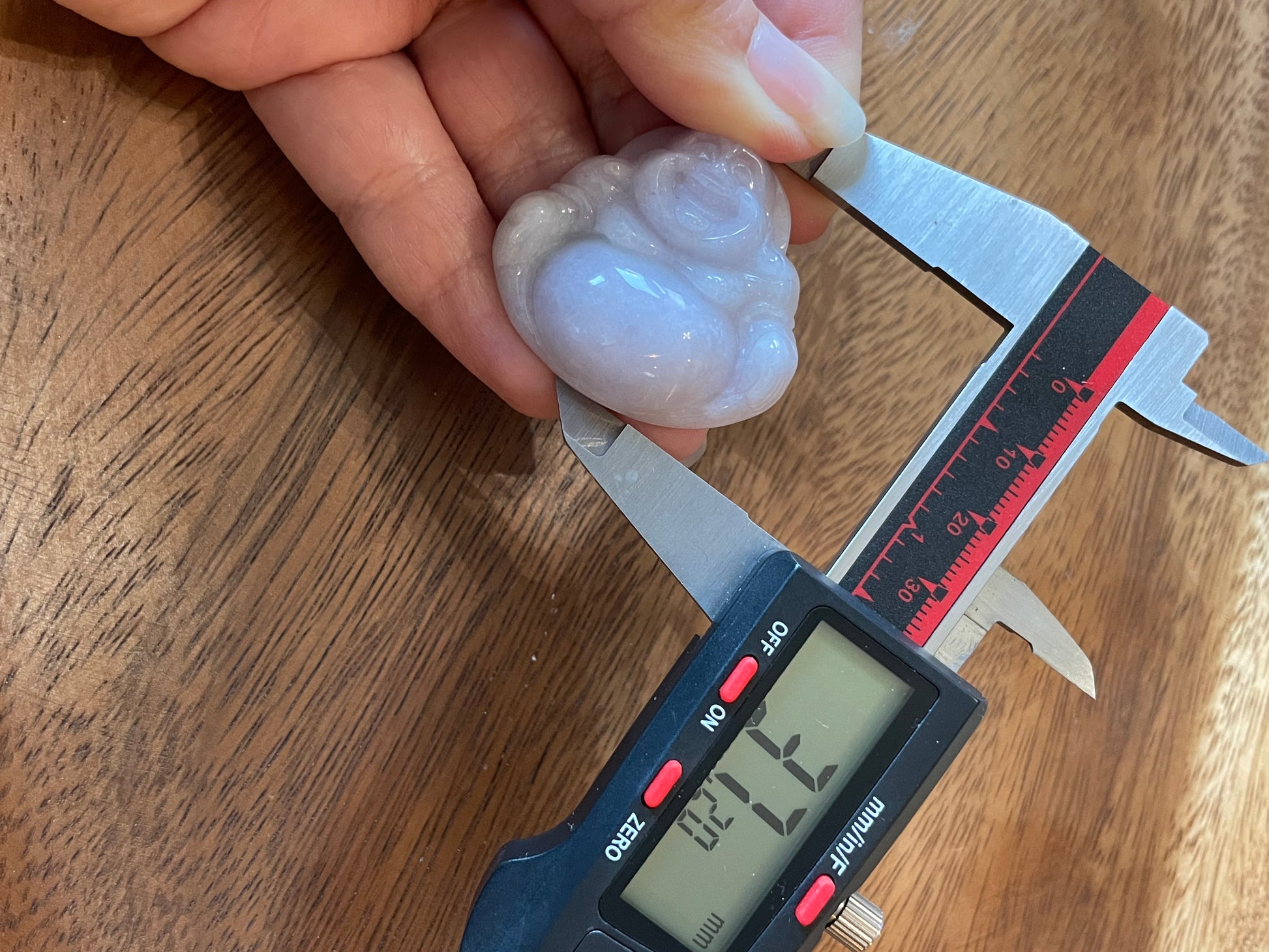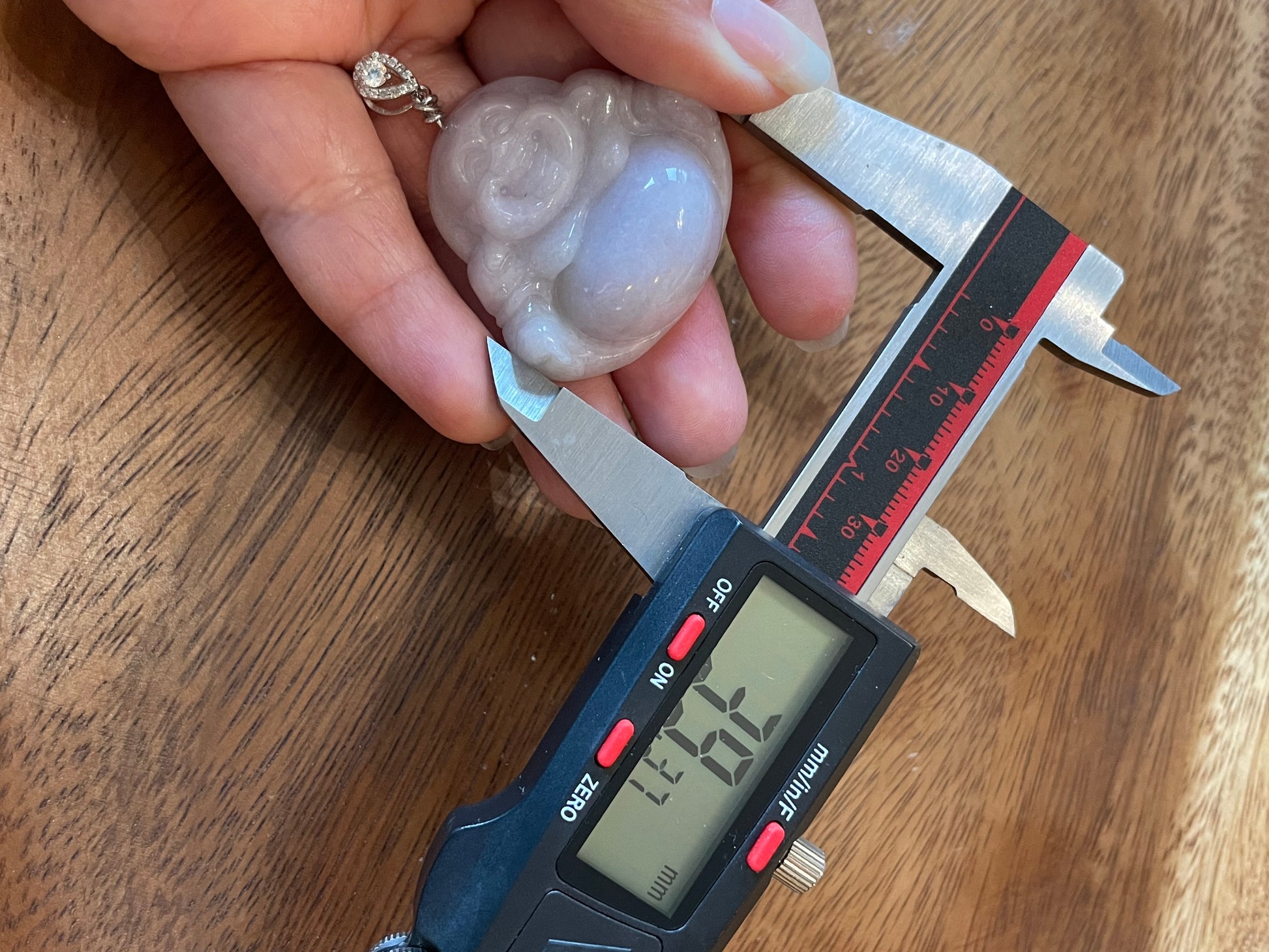 The jadeite pendant is an icy lavender buddha, it’s a very classic piece that can be worn casually and can be dress up. the piece is 37.24mm in height, 39.37mm in width and 13.03mm thick.