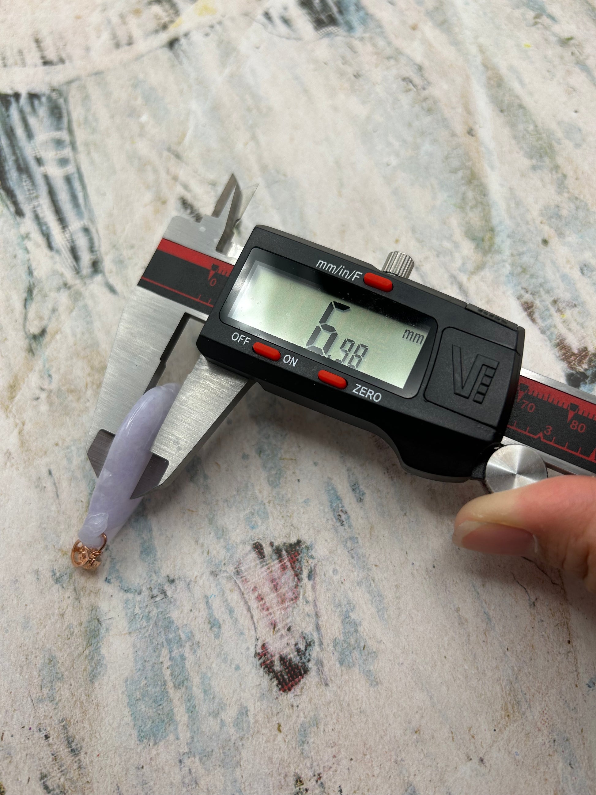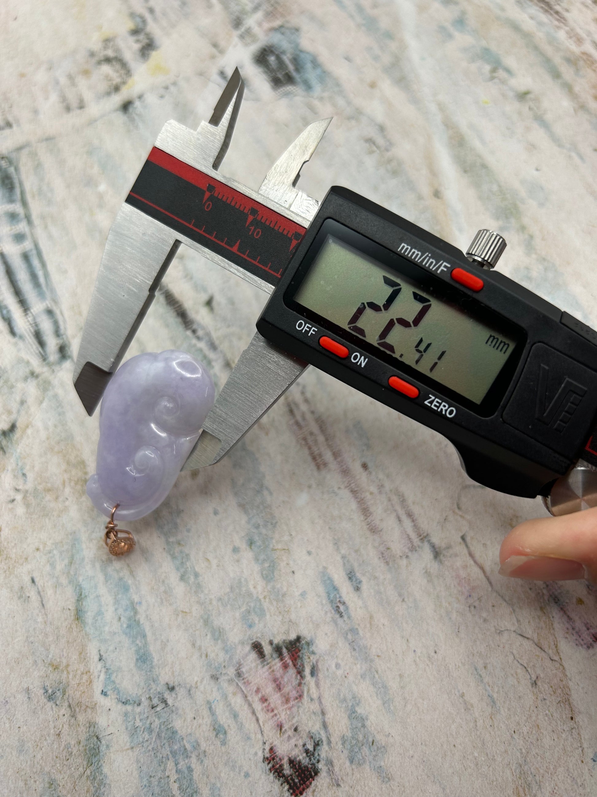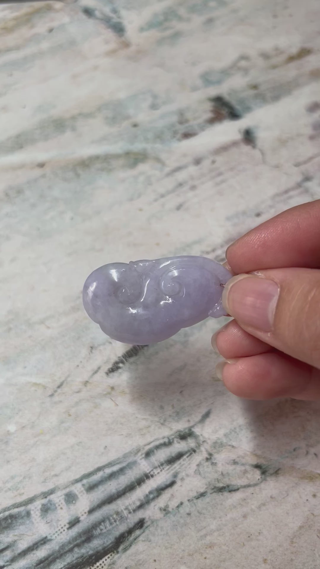 This pendant is translucent, and have some light blueish green color. It is hand carved on both sides. Height:39.45mm width:22.41 mm thick:6.98mm