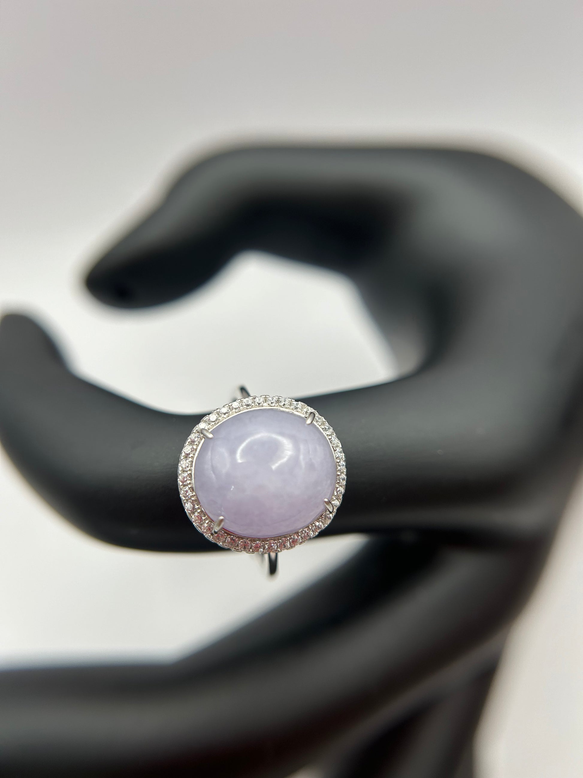 Natural grade A Burmese Lavender Jadeite cabochon with Cubic Zirconia Silver Ring