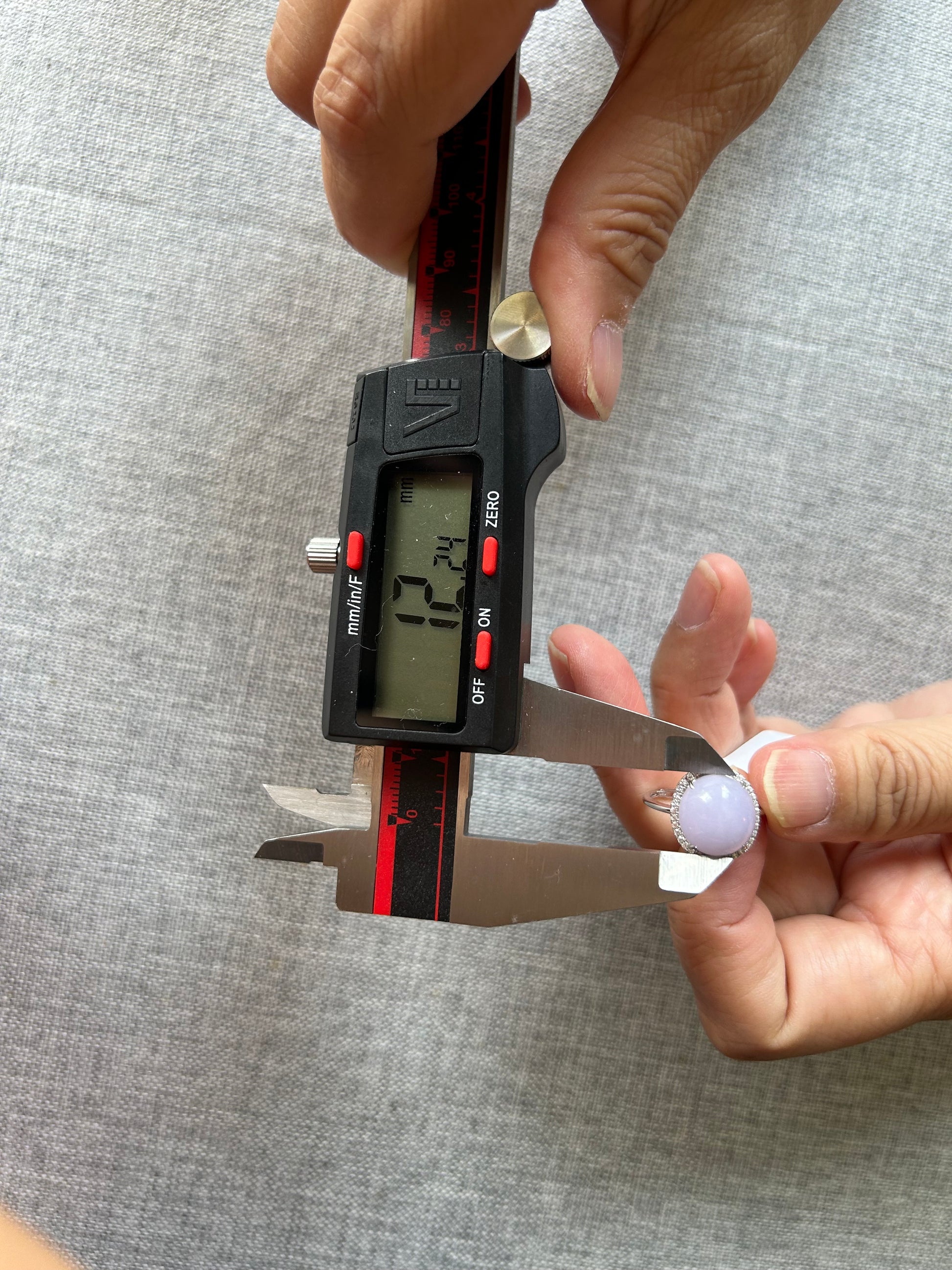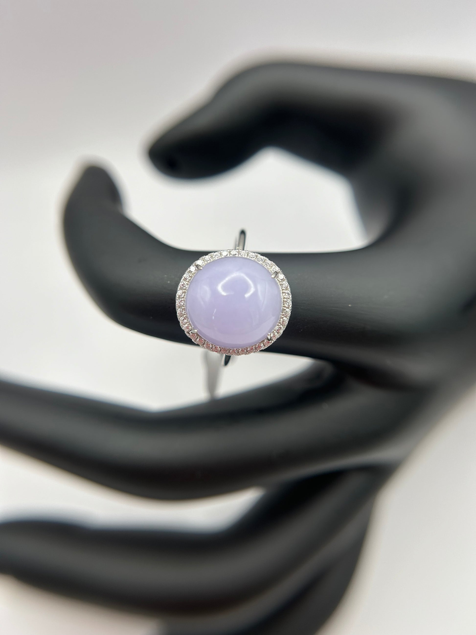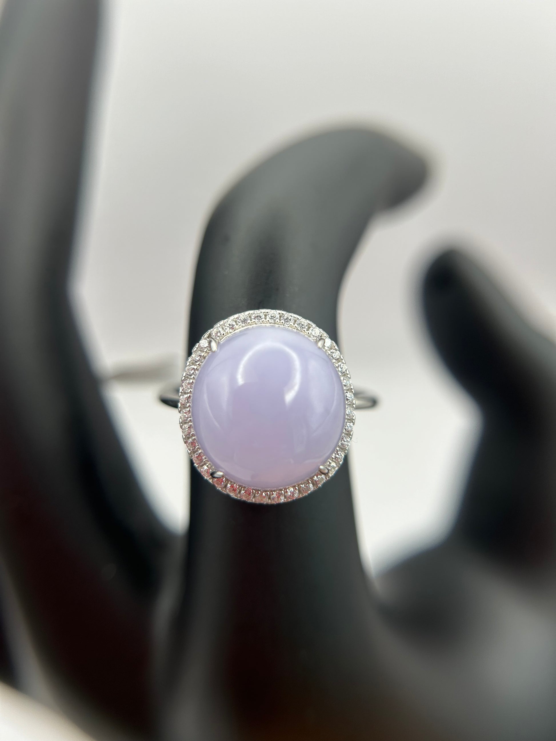 This is a Grade A Burma lavender cabochon jadeite with Cubic Zirconia sterling silver adjustable ring. The jadeite cabochon size is 12.24X 11.93mm